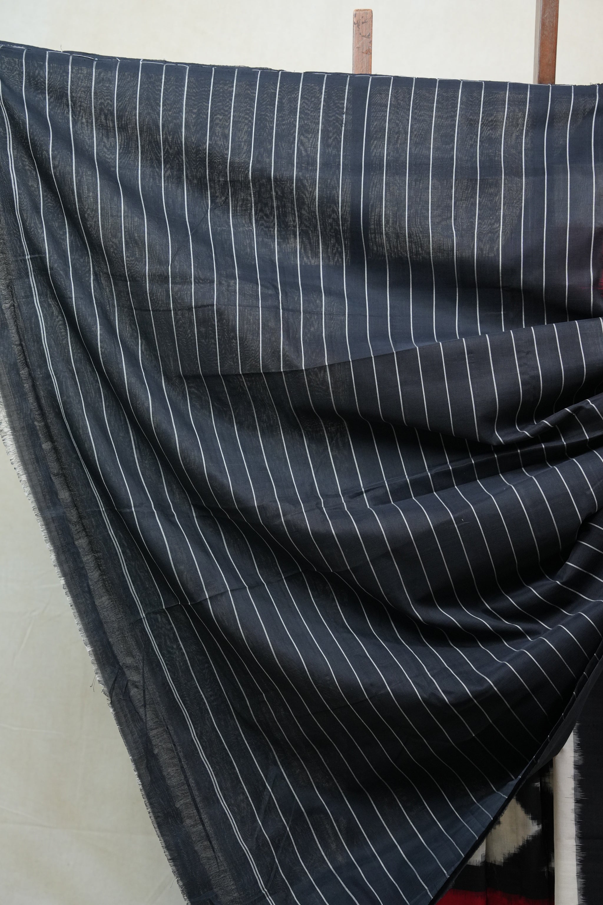 Work - This is a Pochampalli Cotton Ikat saree with white-black color on the body, complemented by an ikat patterned border and striped pallu.