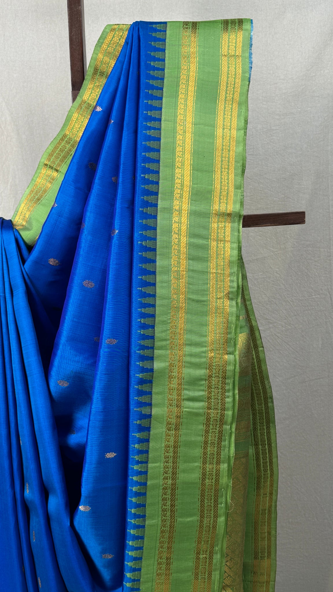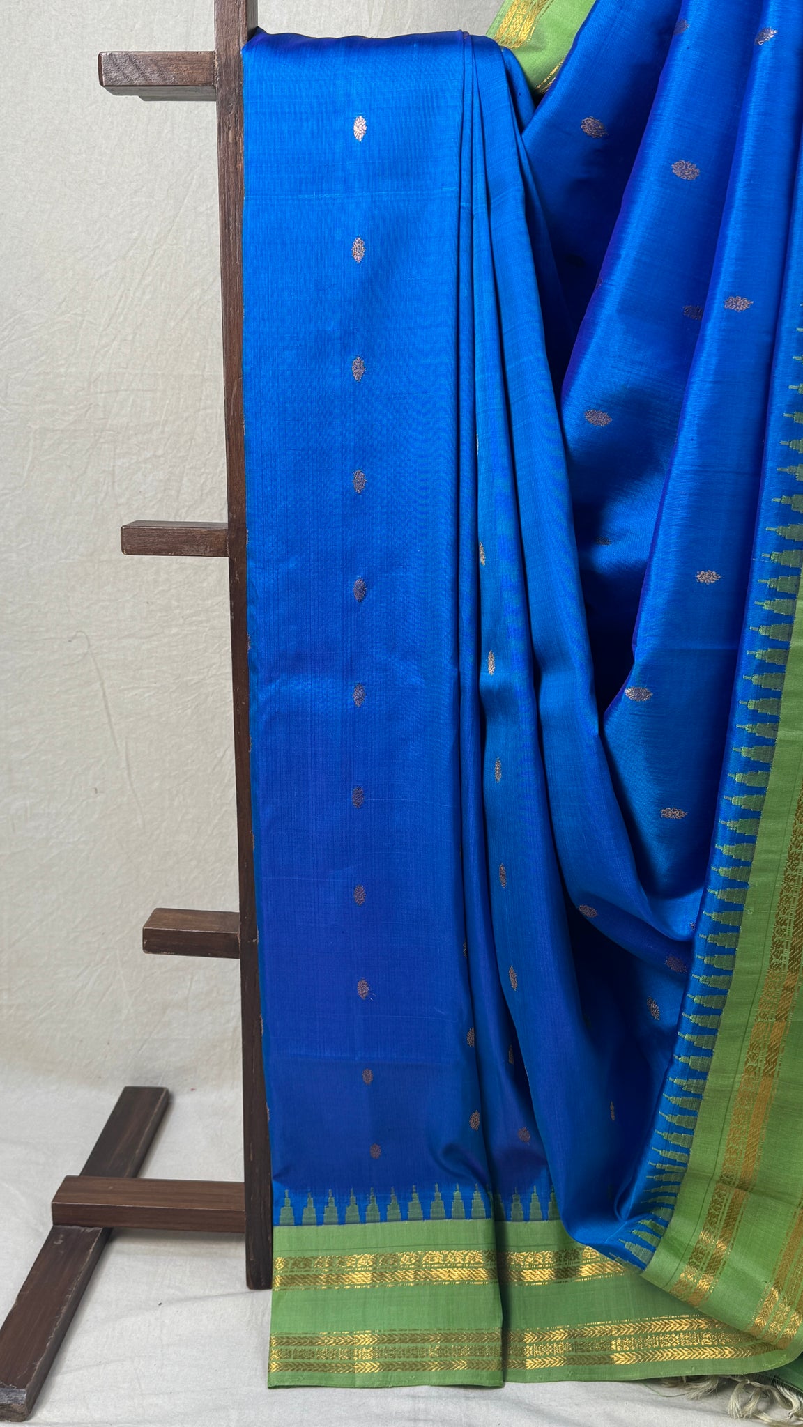 Work - This Gadwal silk saree features a blue colour plain body adorned with small golden buttas and a contrasting colour & zari border. It features unique and attractive design.