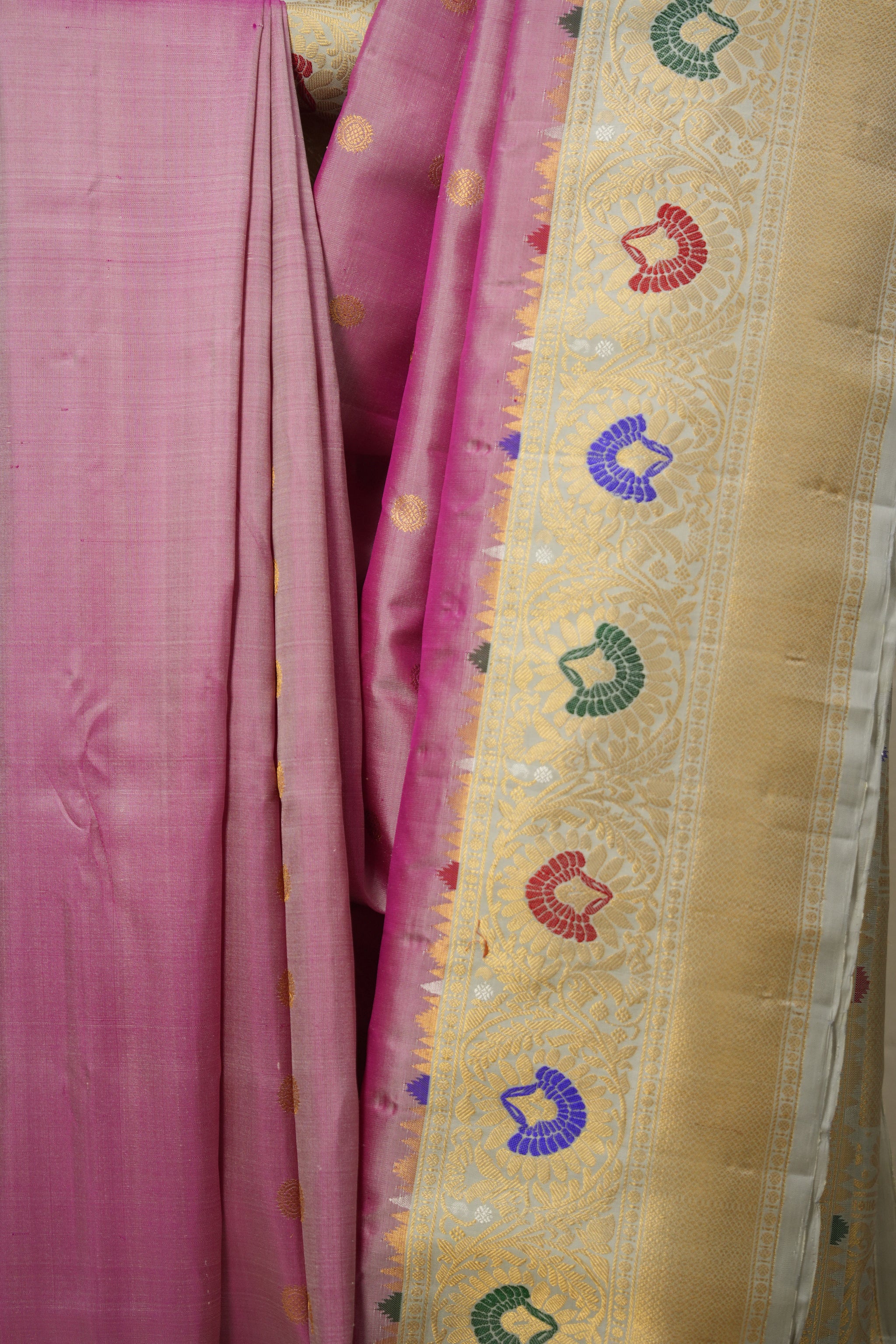 Work - This Gadwal silk saree features a pastel pink colour plain body adorned with small golden buttas and a contrasting colour & zari border with brocade pallu. It features unique and attractive design.