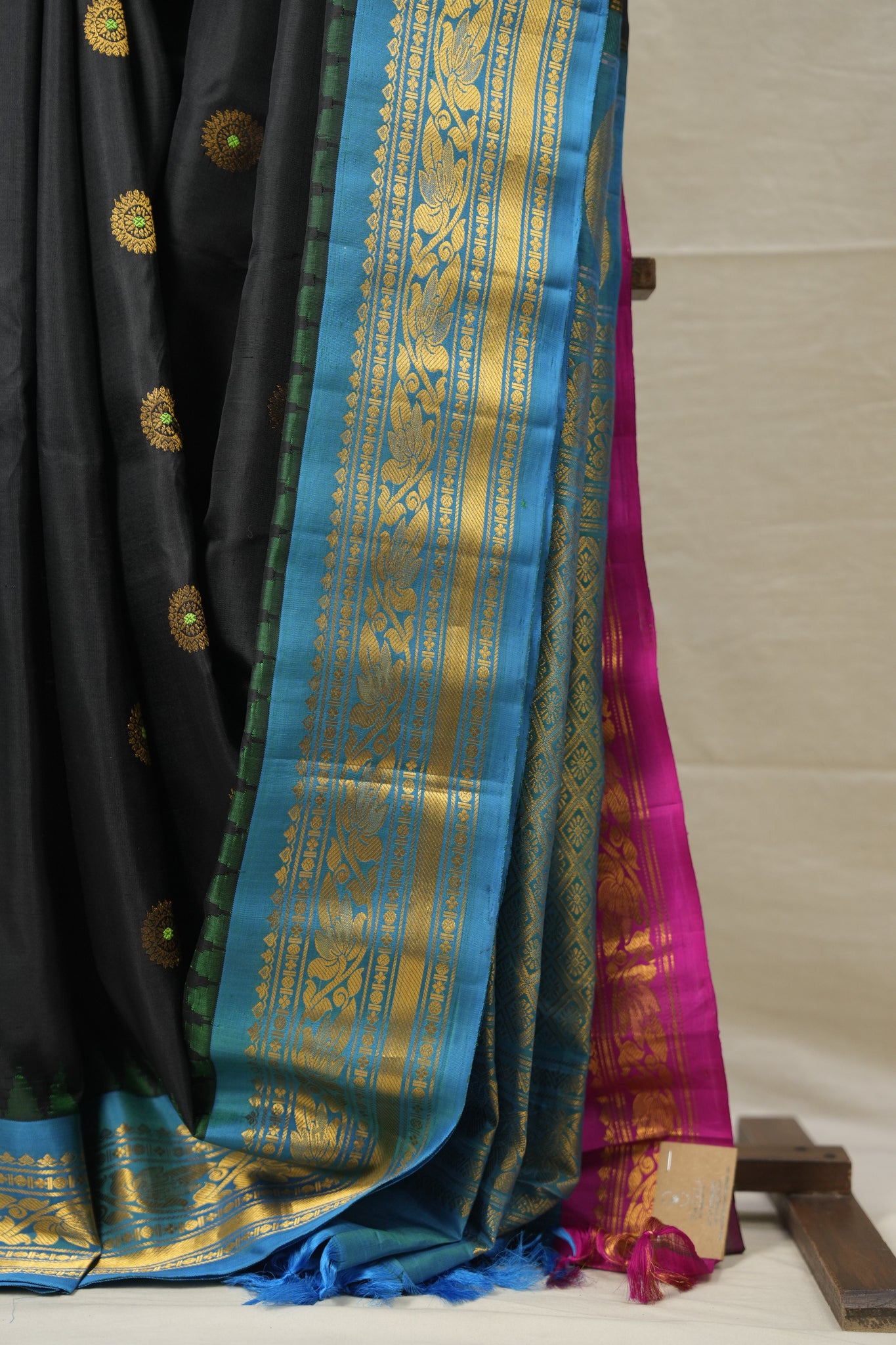 Work - This Gadwal silk saree features a black blue colour plain body adorned with small golden buttas and a contrasting colour & zari border with design pallu. It features unique and attractive design.
