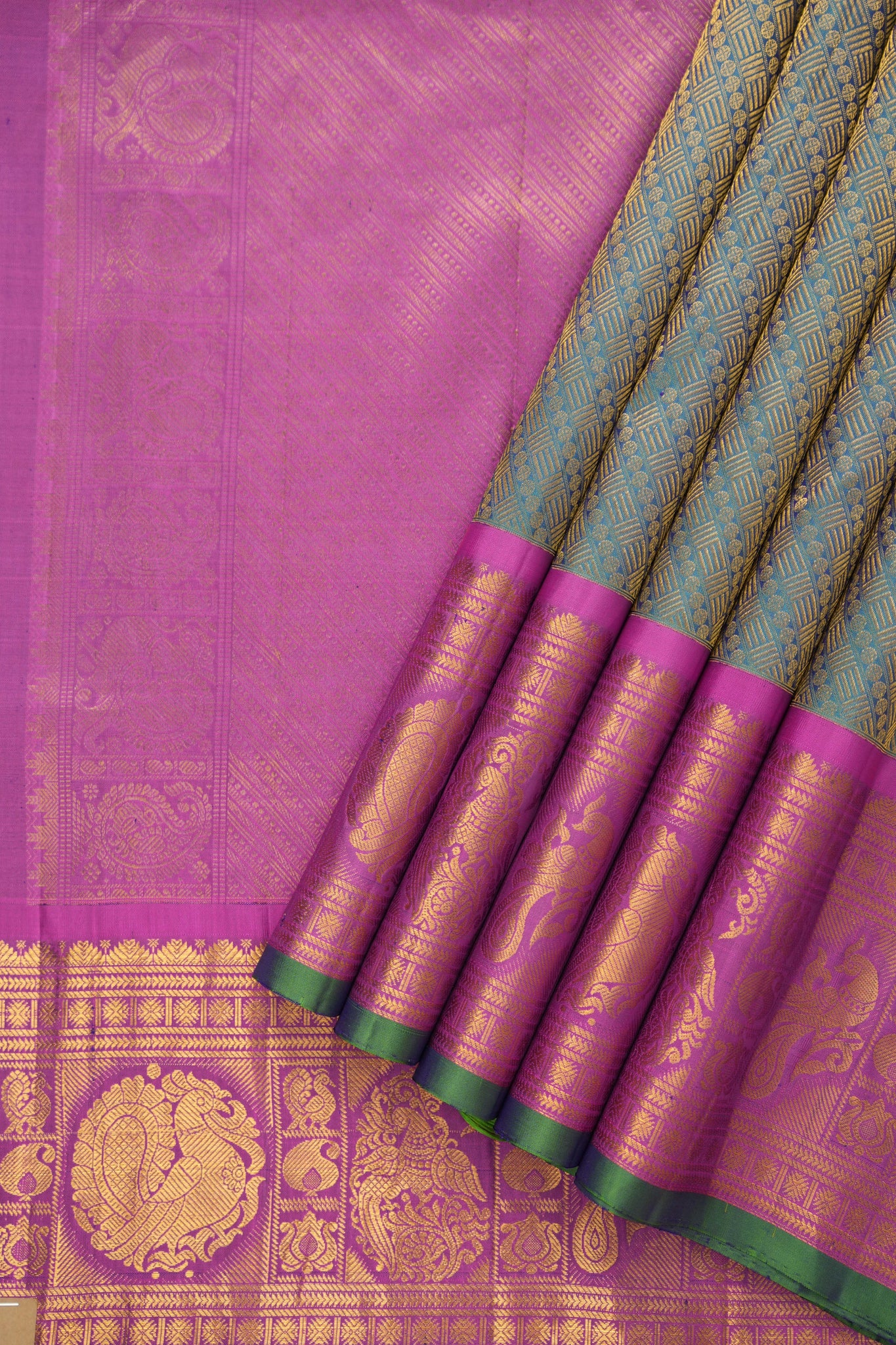 Work - This Gadwal silk saree features a teal colour gold zari all over body adorned with small golden zari design and a contrasting colour & zari border with pallu. It features unique and attractive design.