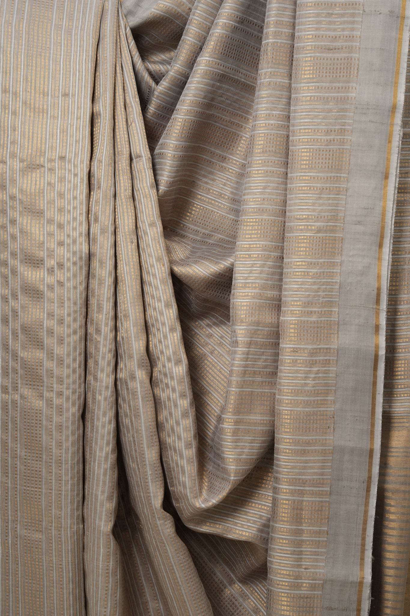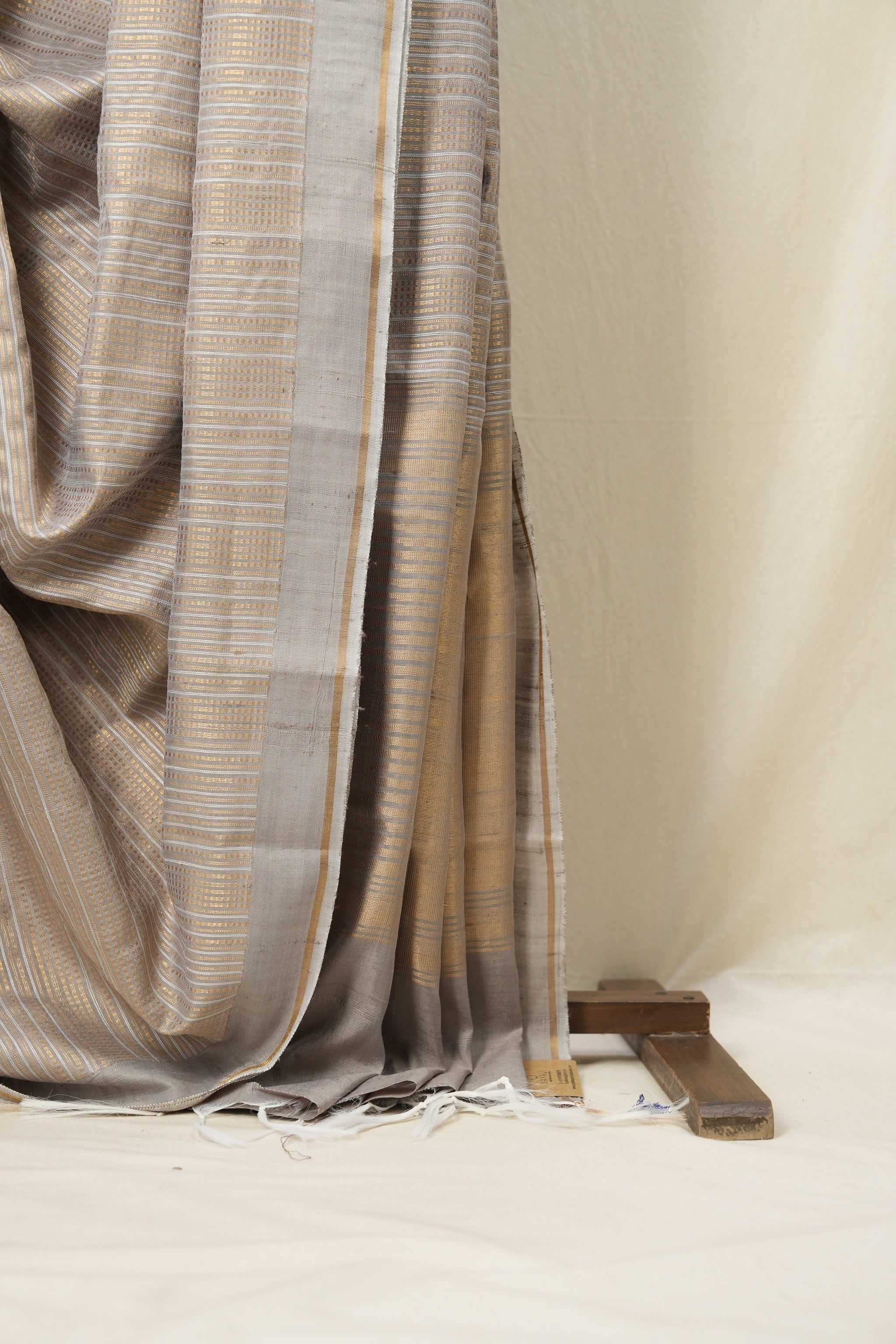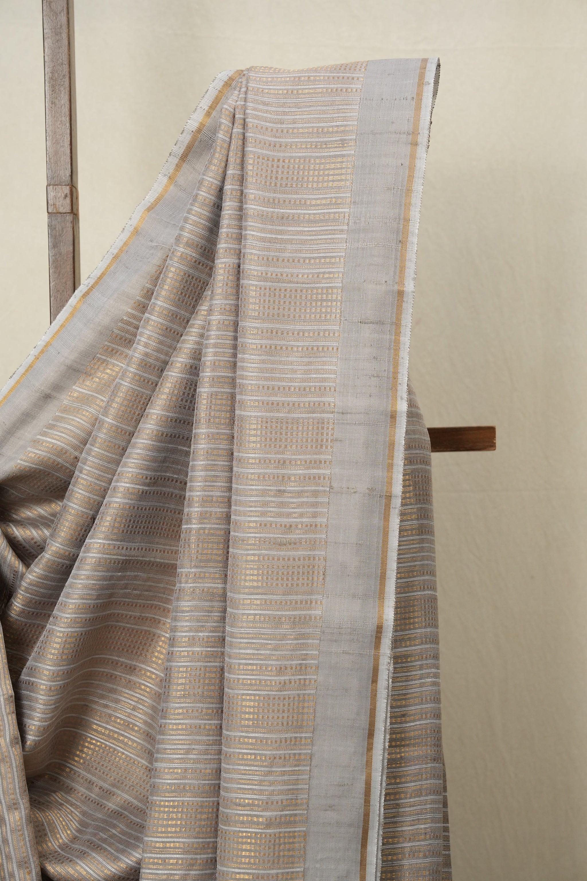 Work - This raw silk saree features a grey base with fine woven stripes and a solid gold border, showcasing a rich and elegant look.