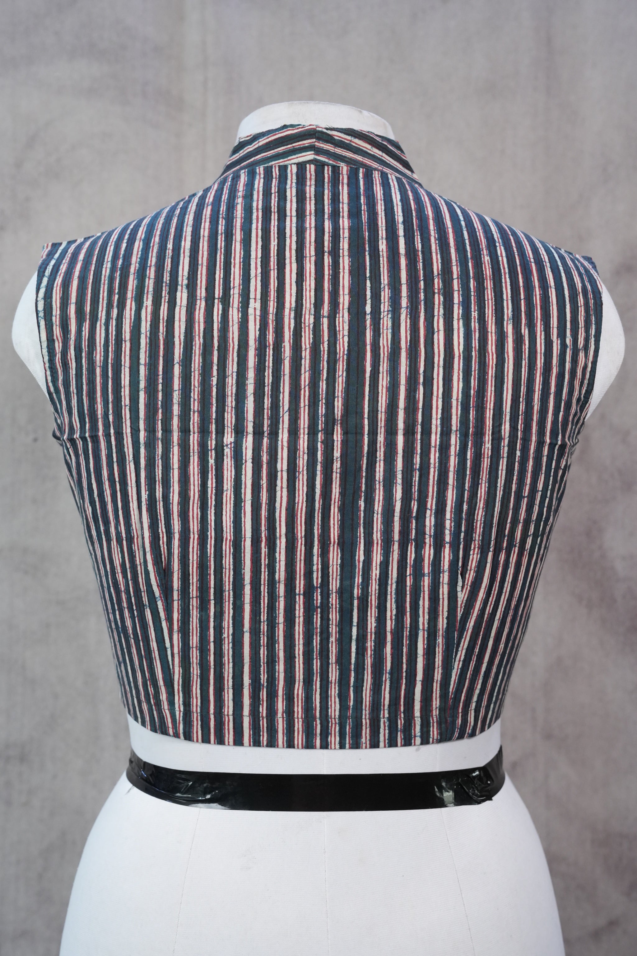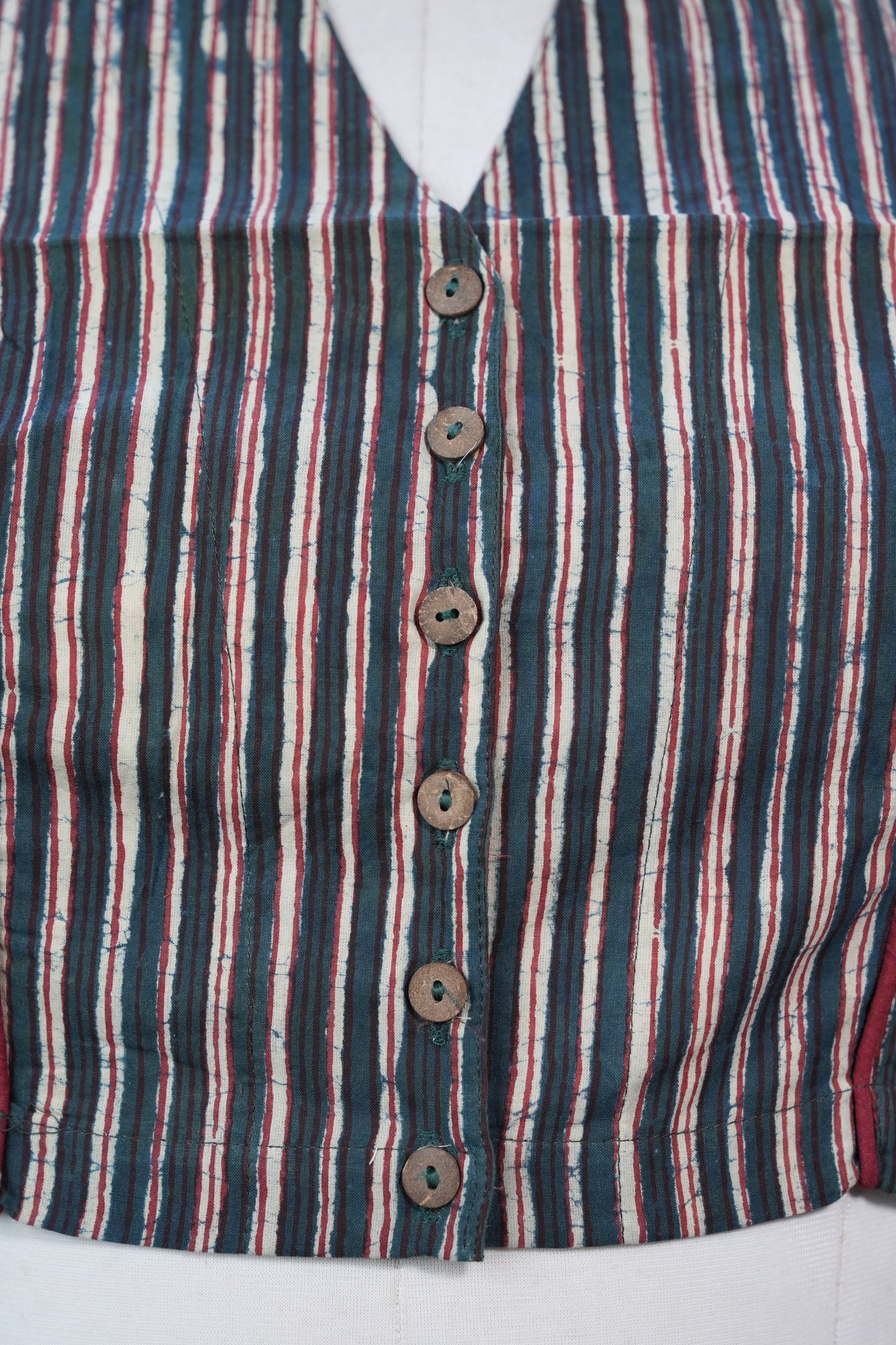 Vertical multicolor stripe print with contrast maroon piping and wooden-style buttons.