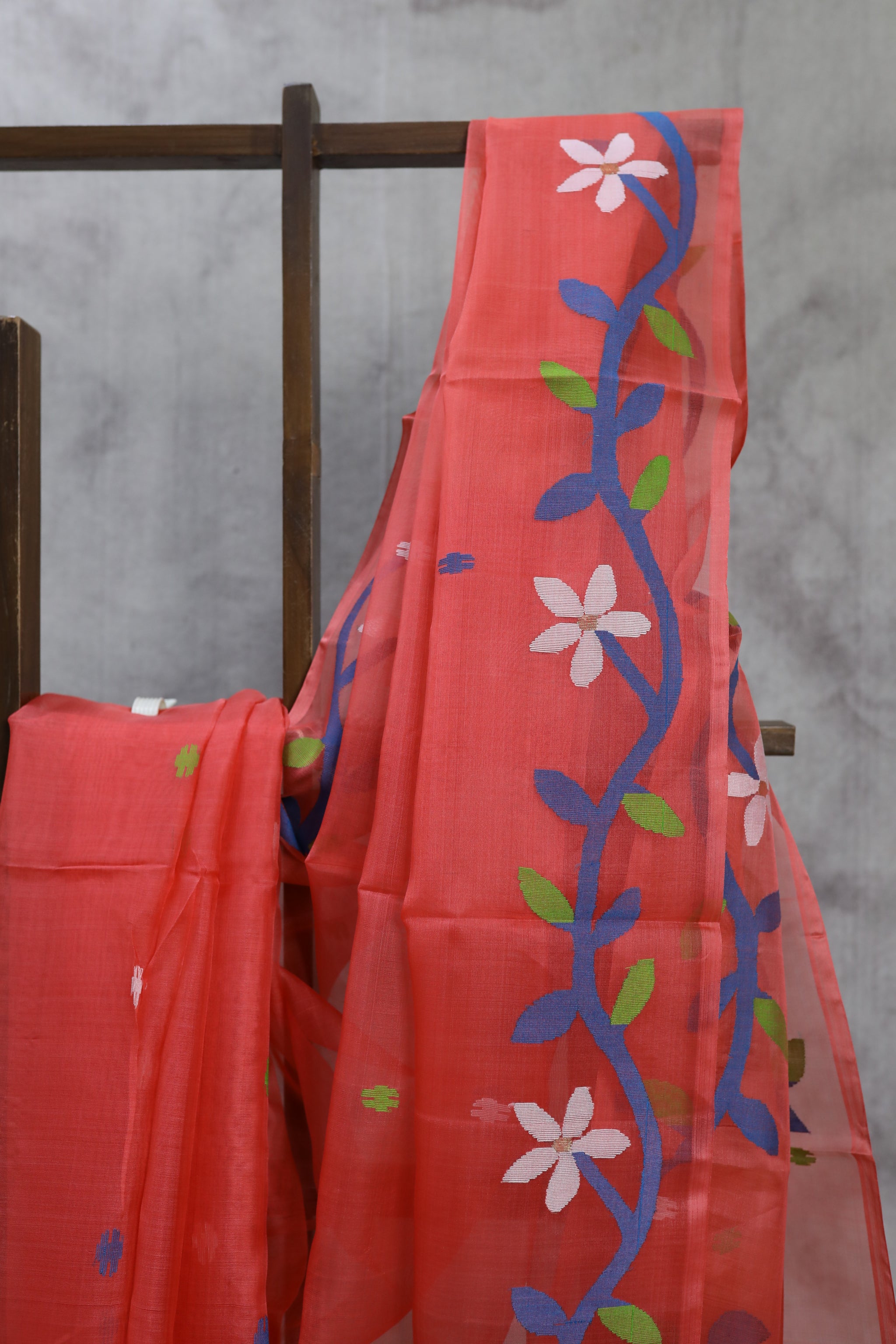 Handloom dark peach pure muslin jamdani saree with border. Embark on a journey through indigenous weaves with our Muslin Jamdani Saree, adorned with enchanting village motifs and nature-inspired designs.