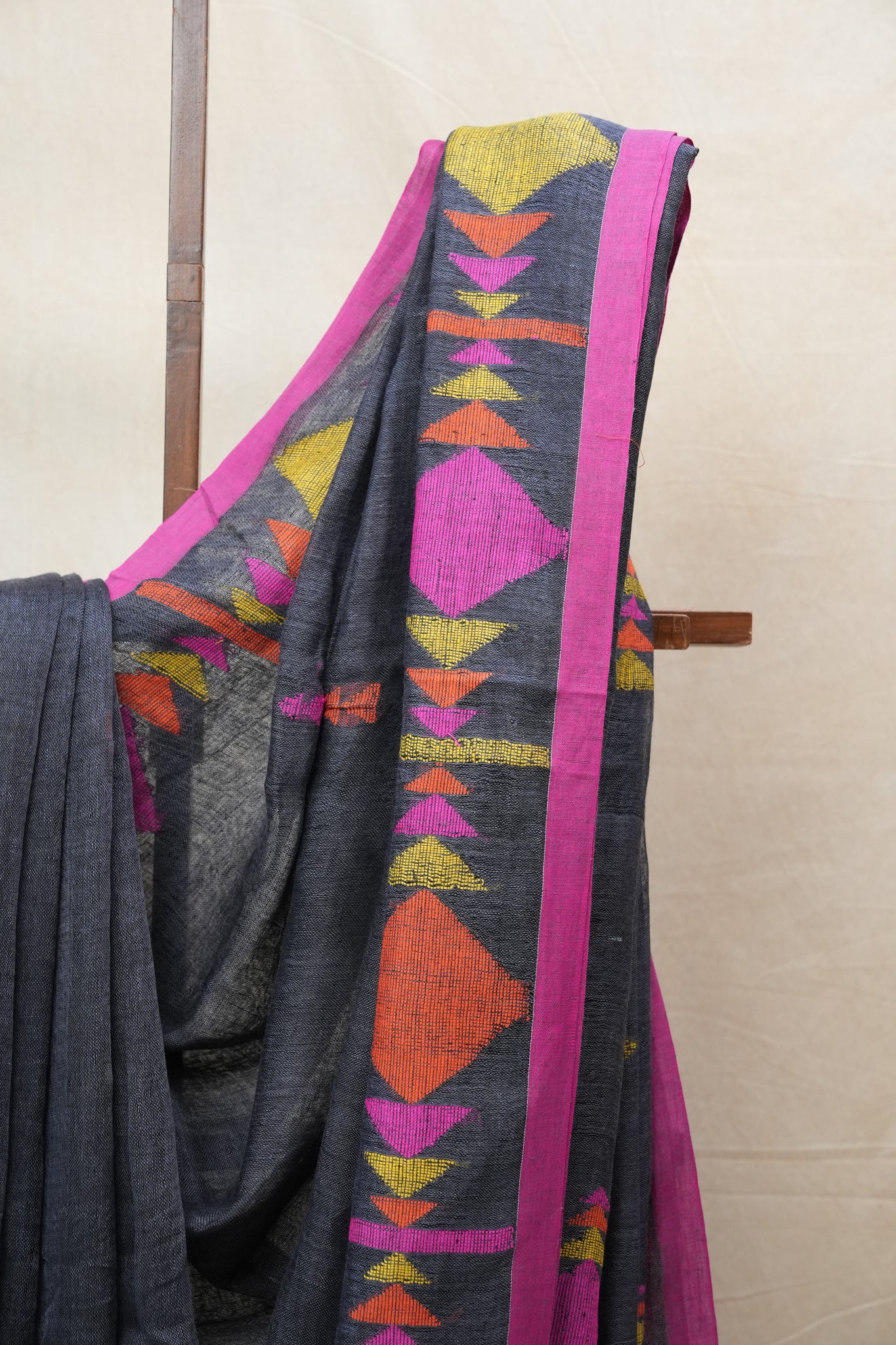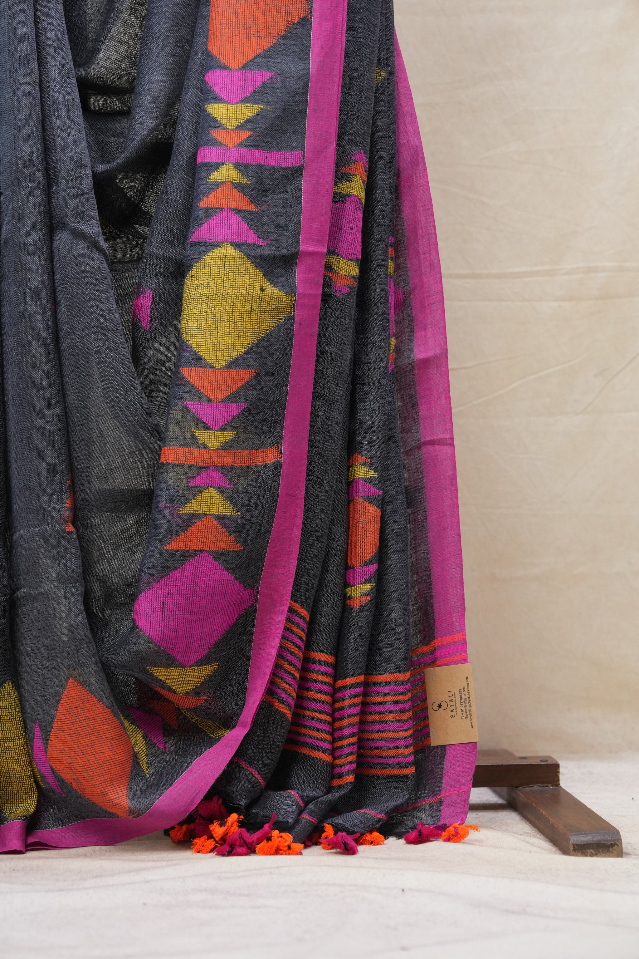 Grey Linen Jamdani Saree With Multi Color Tassels - SRGLJS418