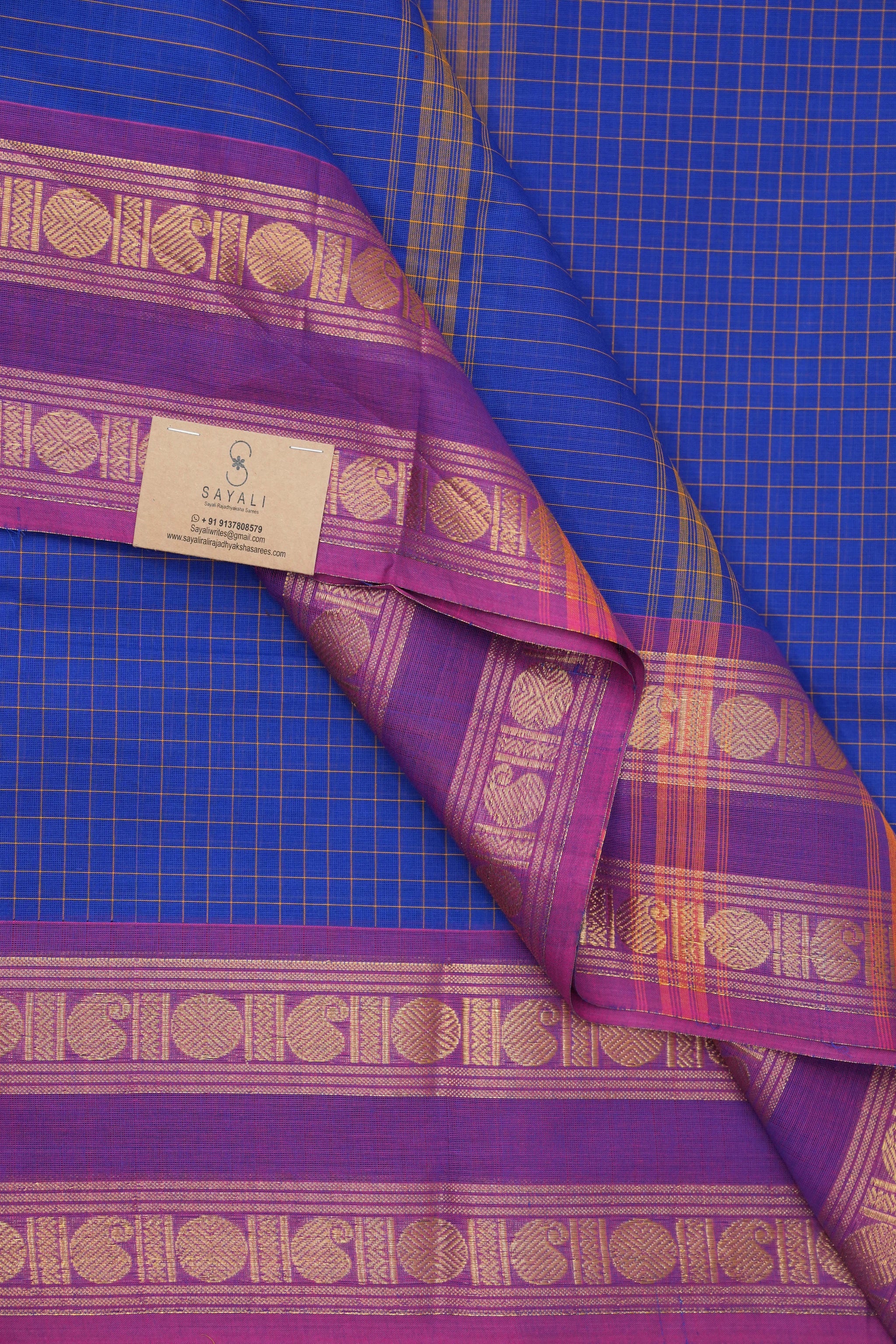 Work -The saree is in a blue color with checkered pattern. The border is highlighted with gold woven patterns for contrast.
