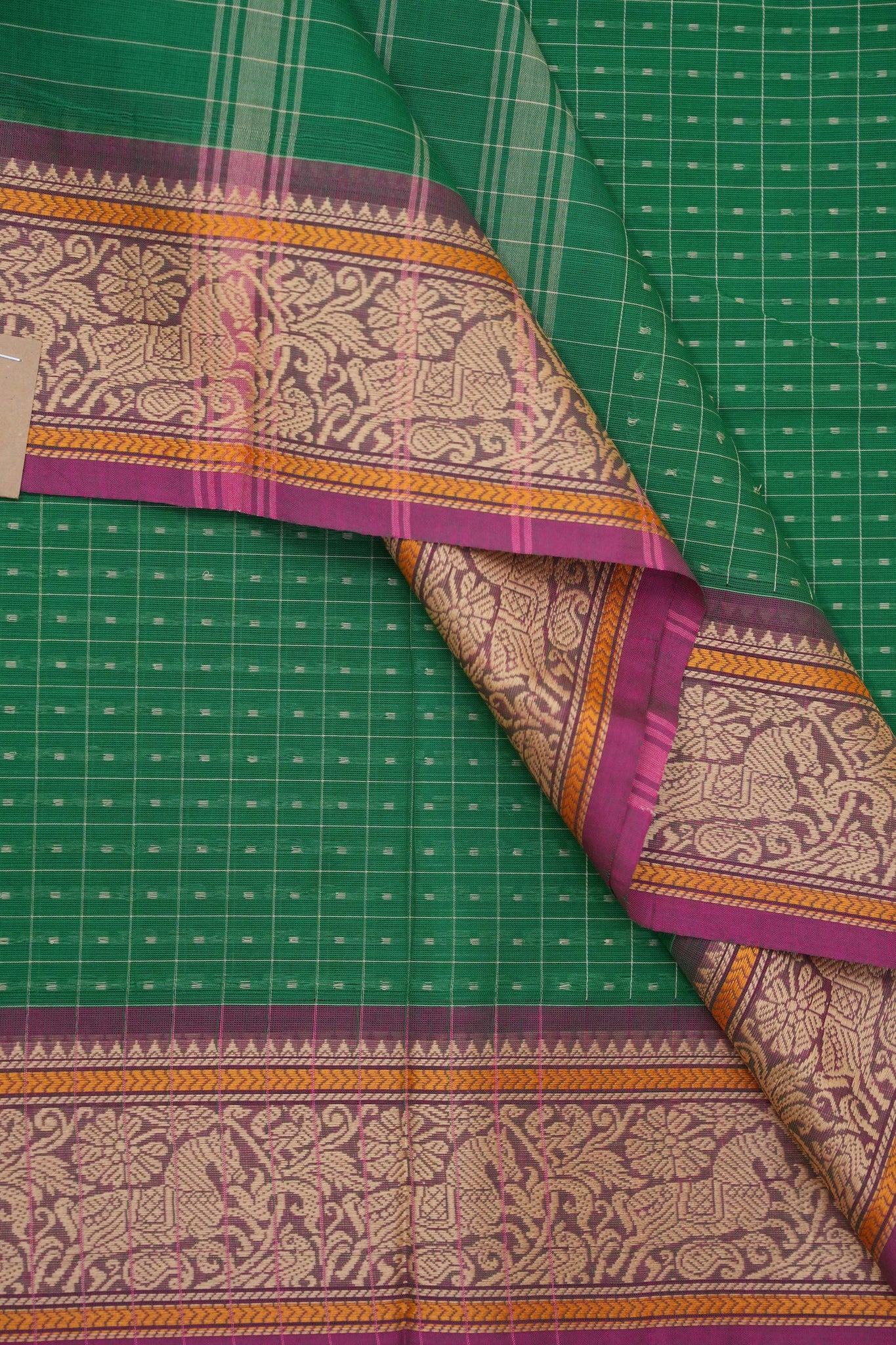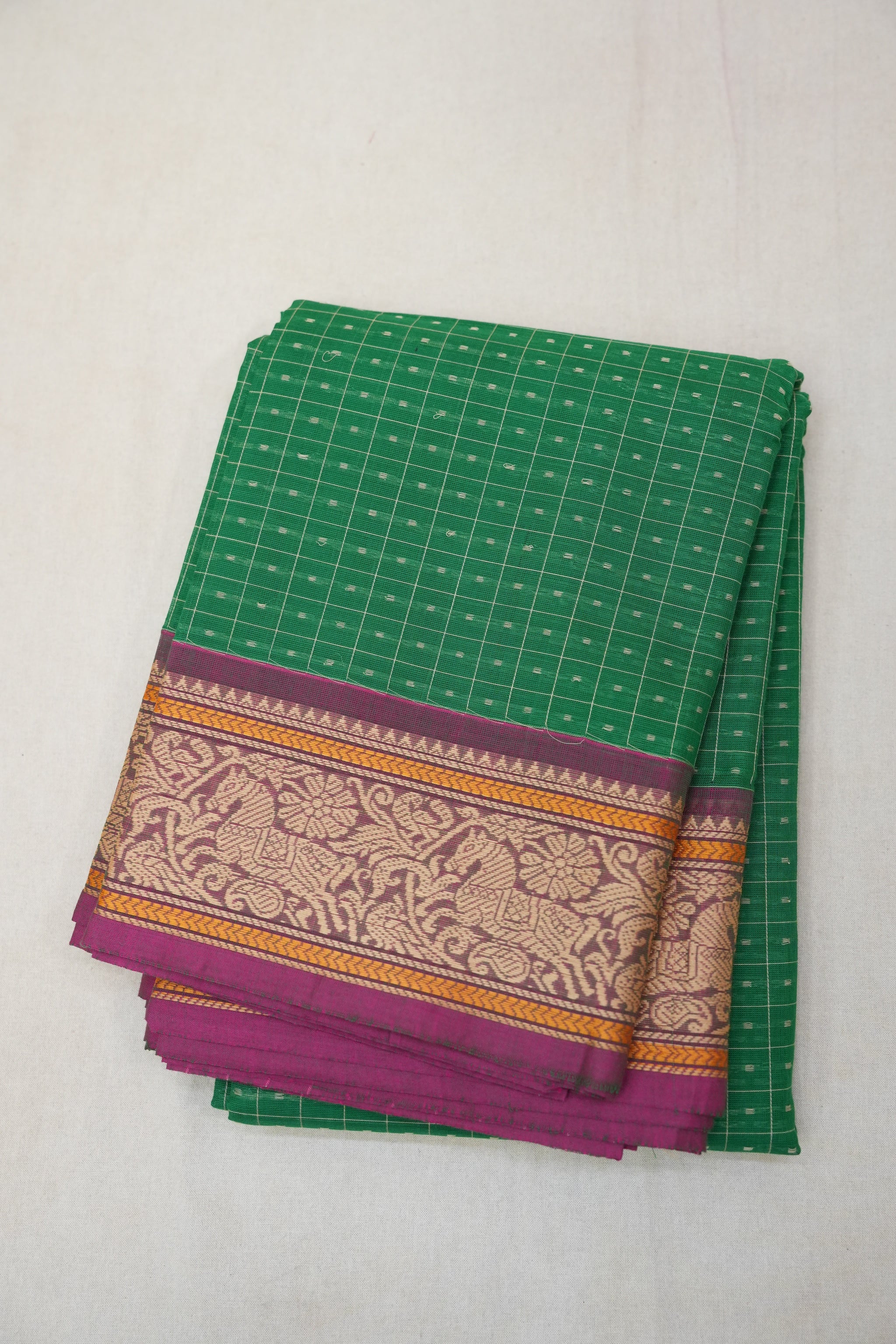 Work - Small checked weave on the body with intricate golden zari floral motifs on the border and pallu.