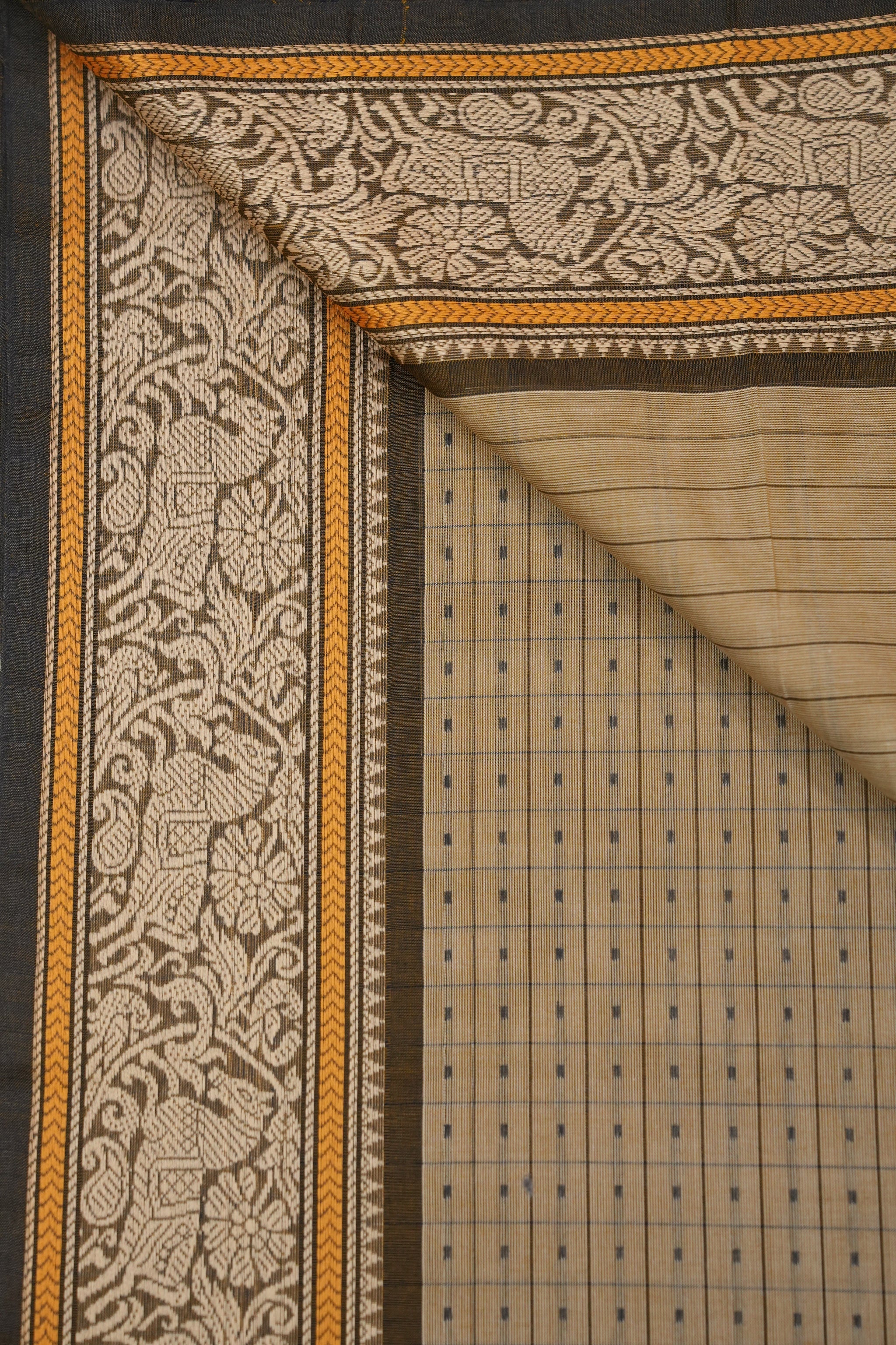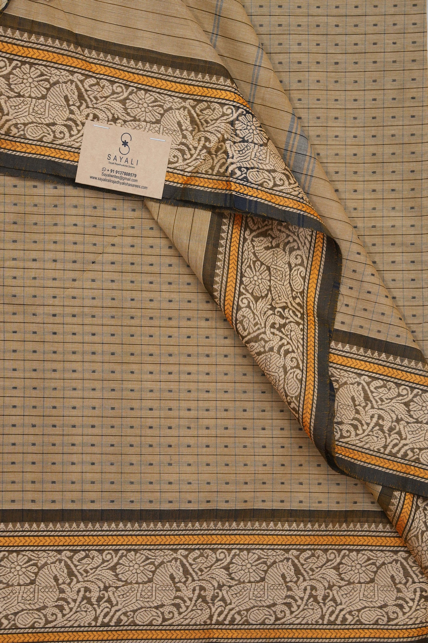Work - Light Brown checked pattern with all over butti in body and contrast kashish border woven in golden zari featuring floral vines, horse motifs, and an orange selvedge accent.