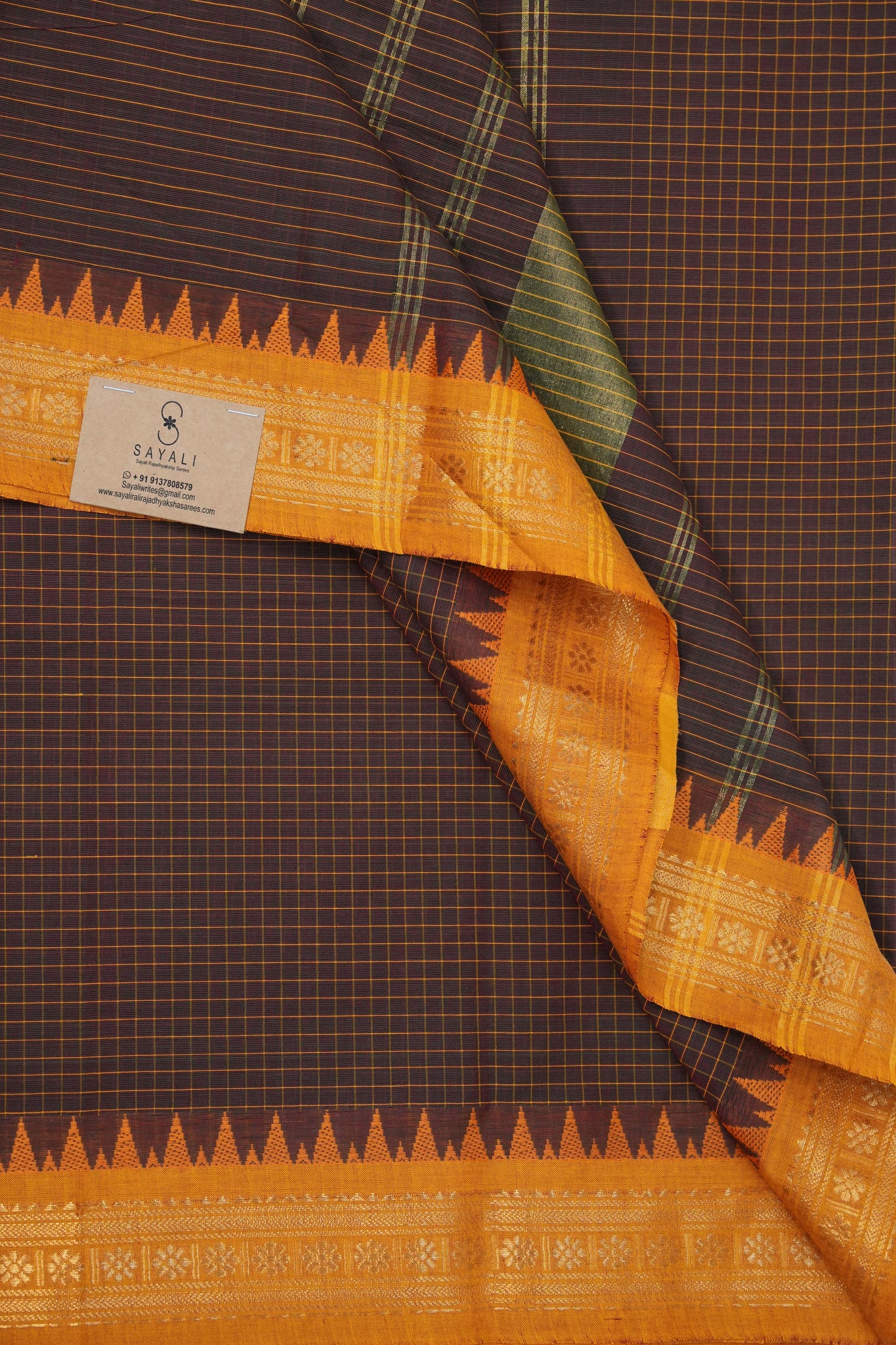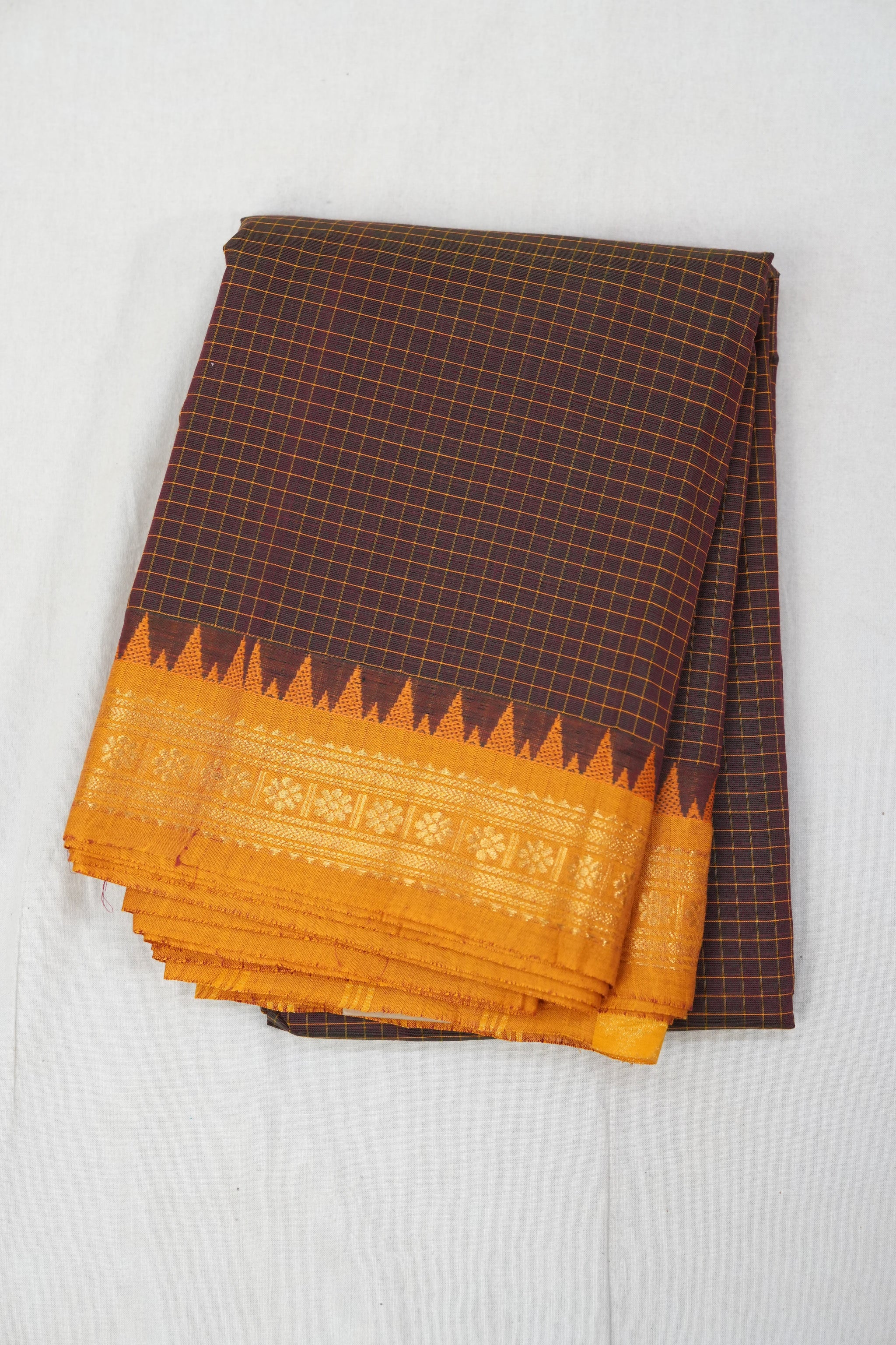 Work -The saree is in a maroon color with all over small checks in body and contrast yellow border with gold zari and temple. The border is highlighted with gold woven patterns for contrast.