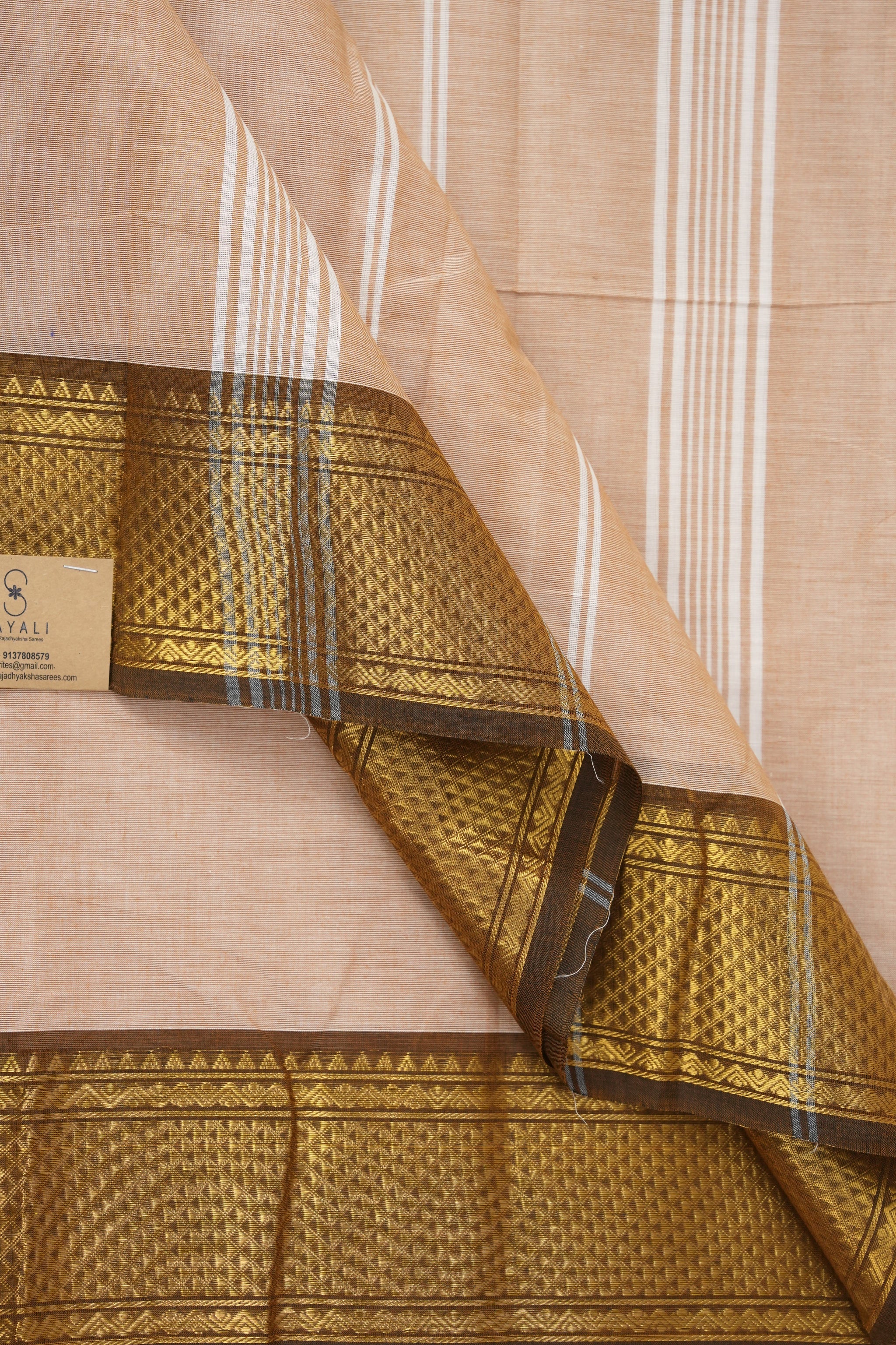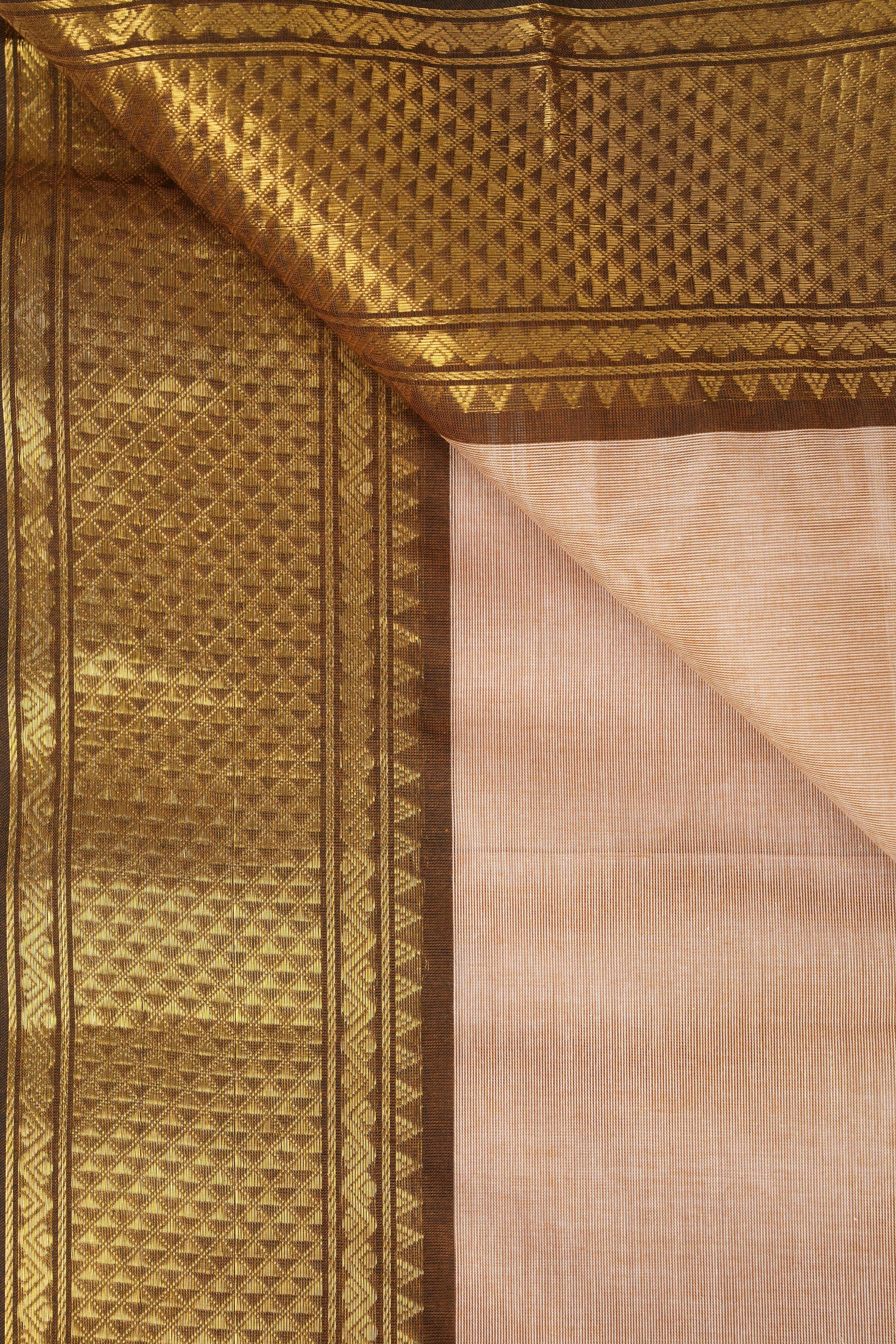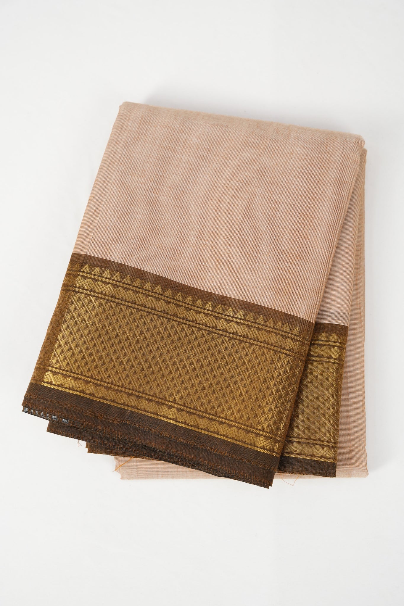 Work -The saree is in a beige color with plain body and contrast brown border with beautiful gold zari in both side. The border is highlighted with woven patterns.