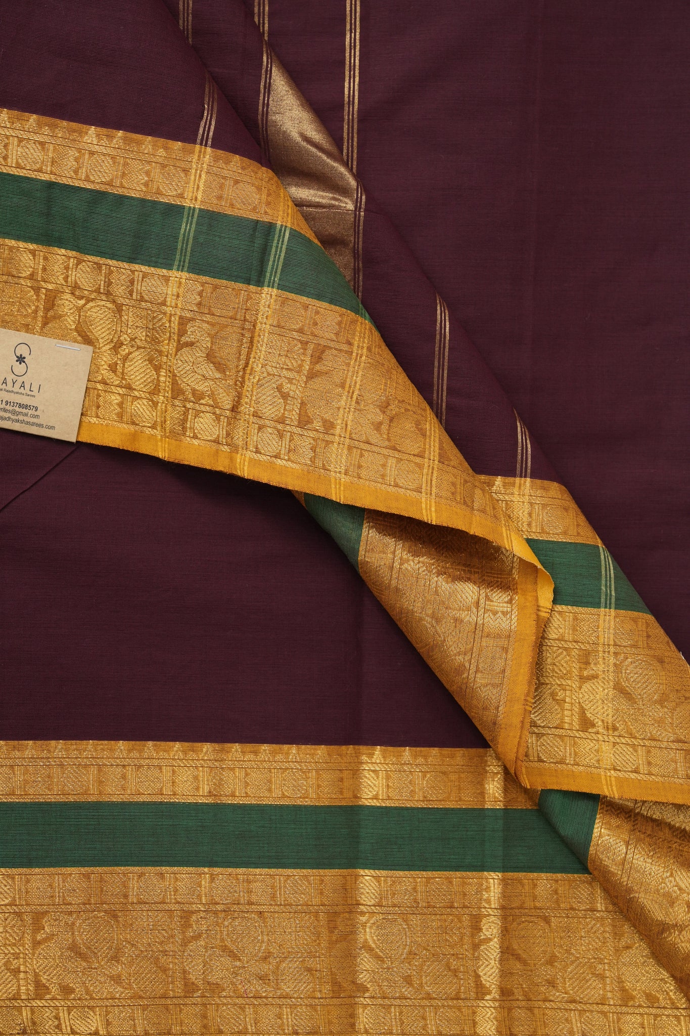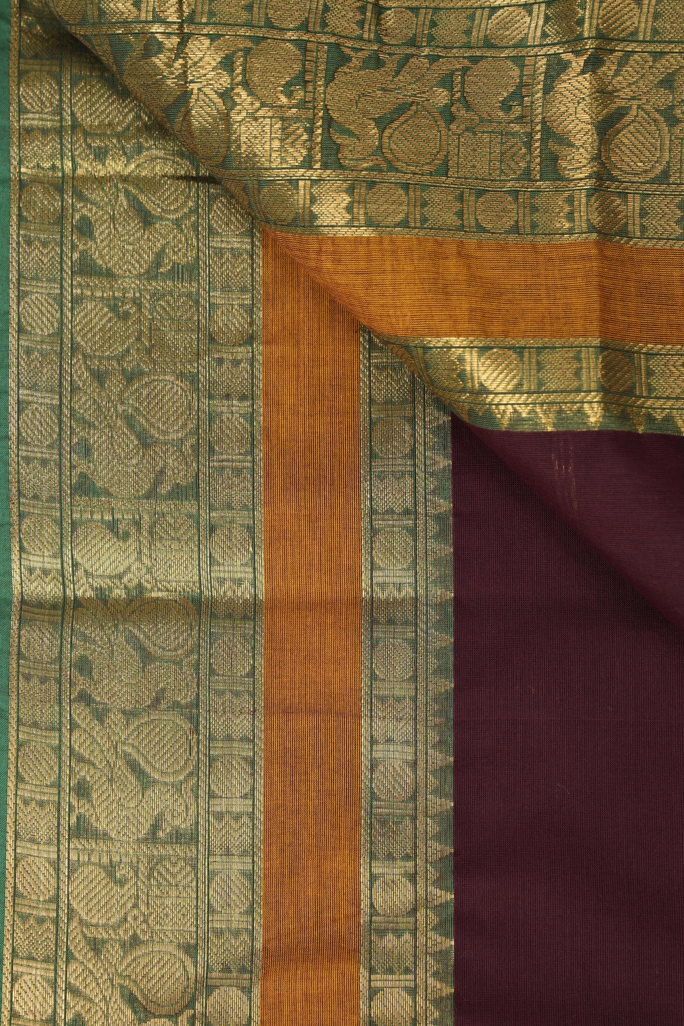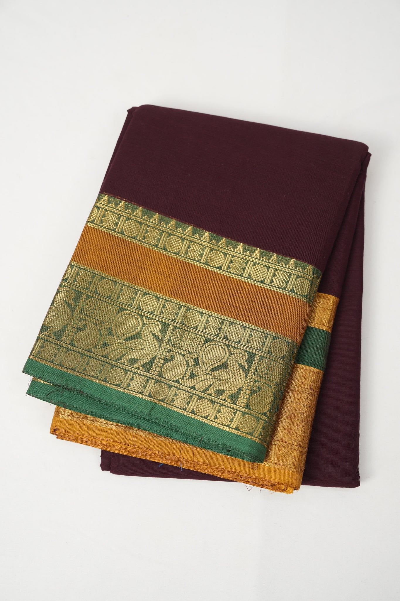 Work -The saree is in a wine color with plain body and contrast ganga jamuna border with gold zari. The border is highlighted with woven patterns.