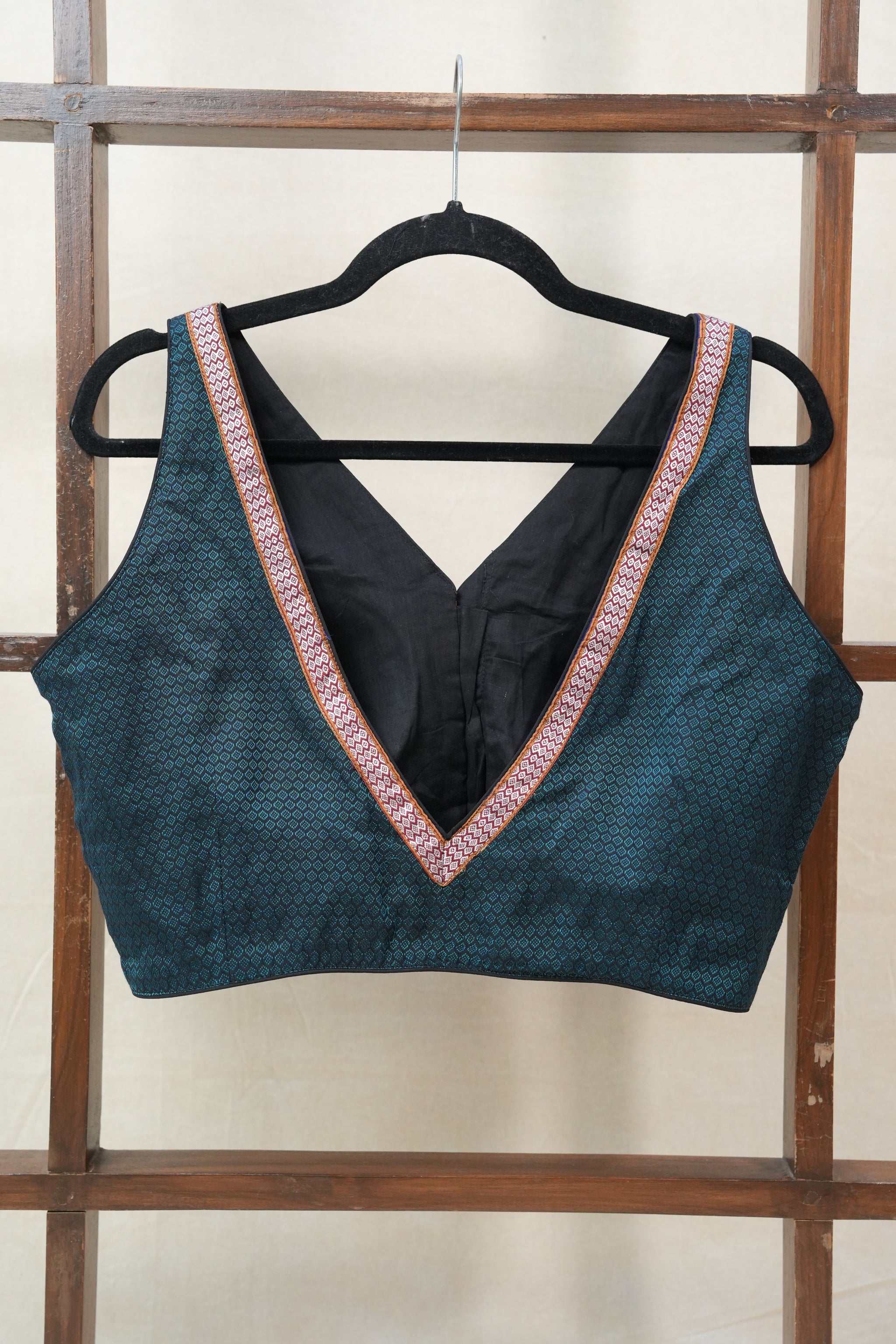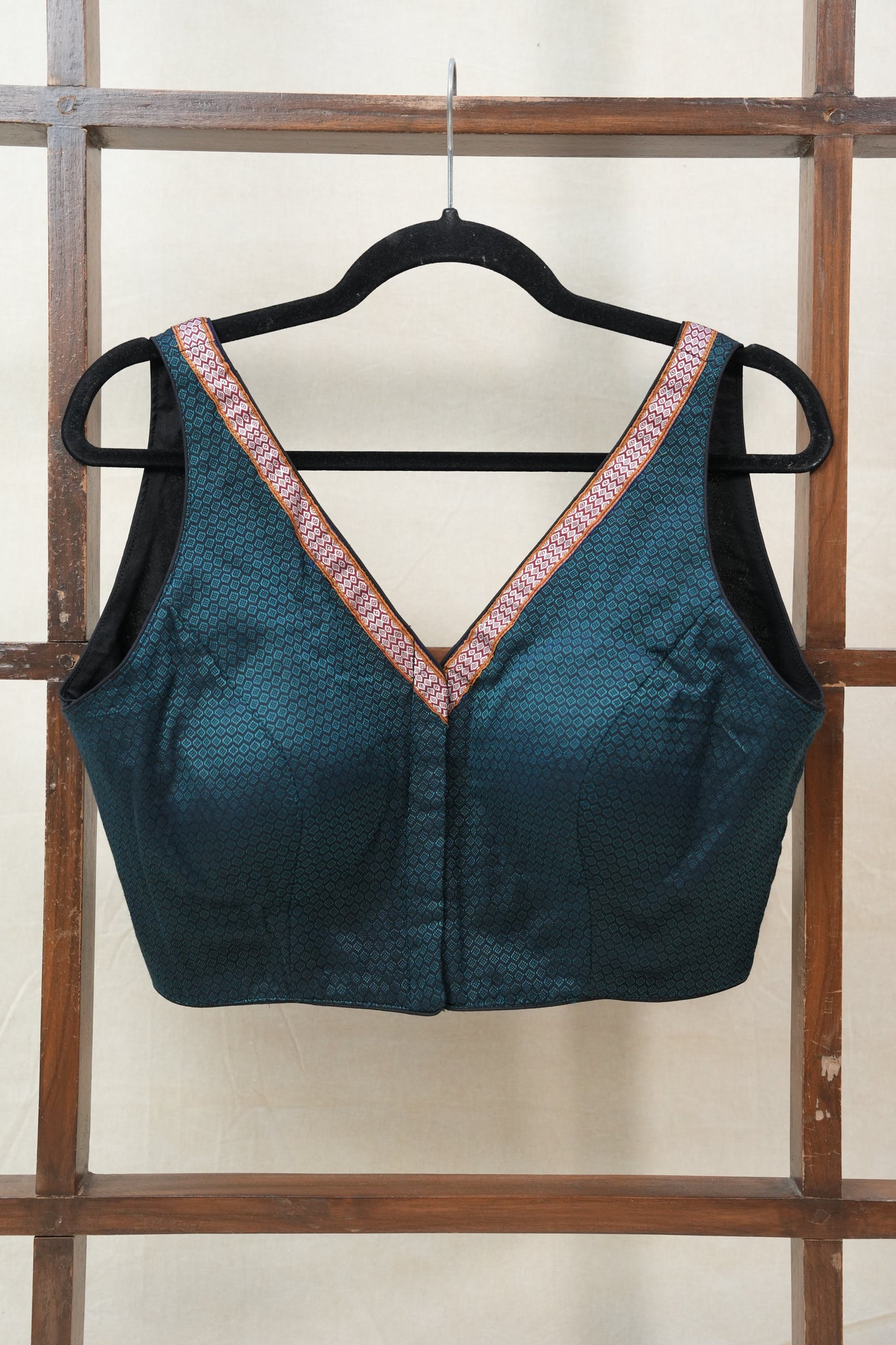 Rama green khun blouse with v neck front and back, front open with zip, with pads, with cotton lining, princess cut with 1 inches margin inside. small border and sleeveless blouse.