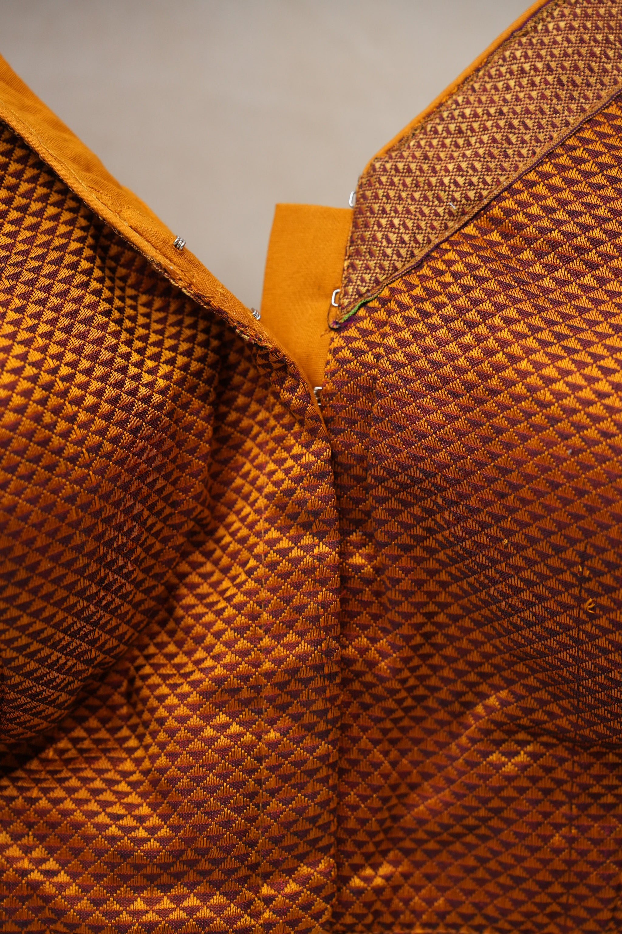 Rust orange khun blouse with v neck front and back, front open with zip, with pads, with cotton lining, princess cut with 1 inches margin inside. small border and sleeveless blouse.