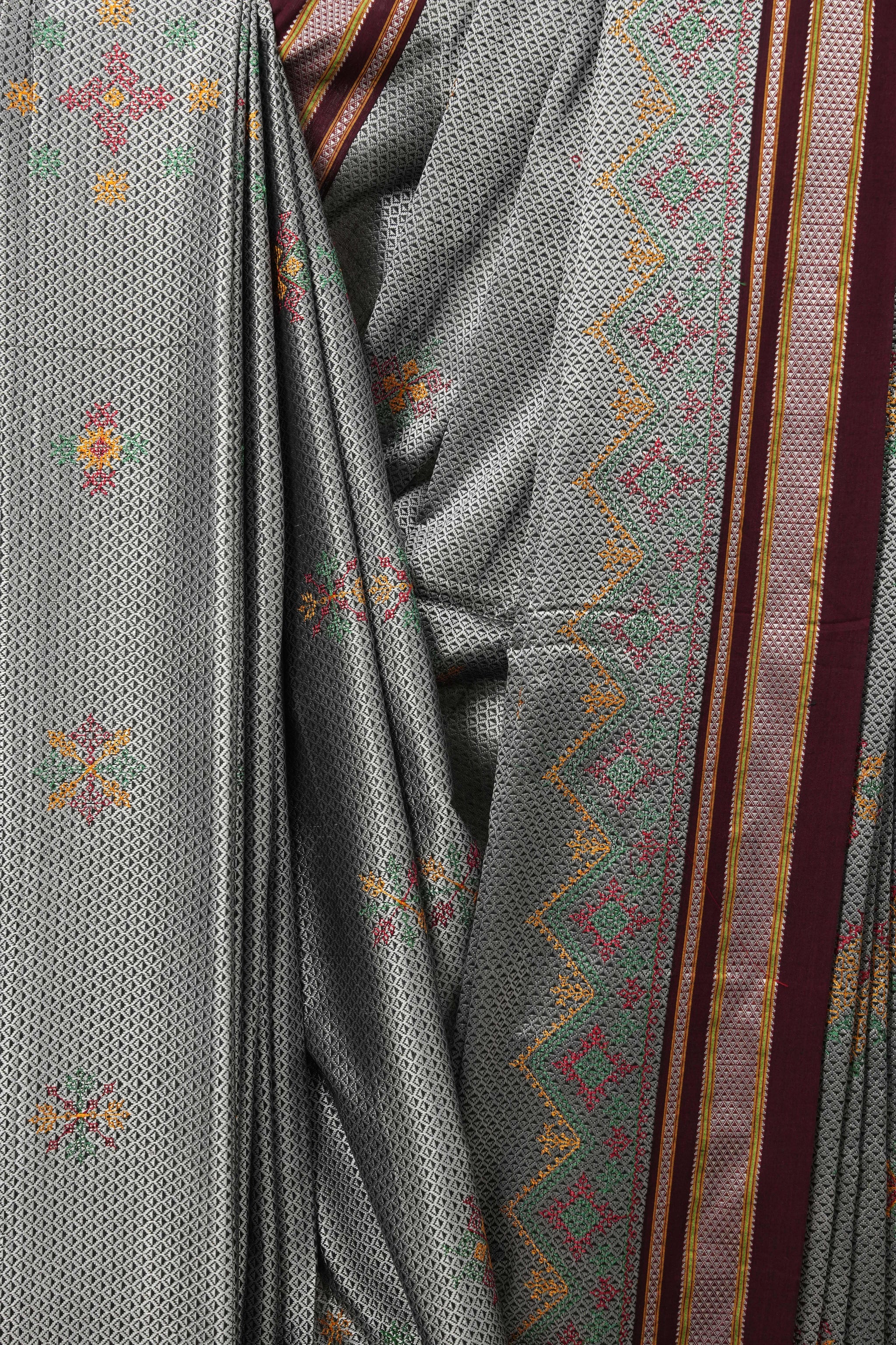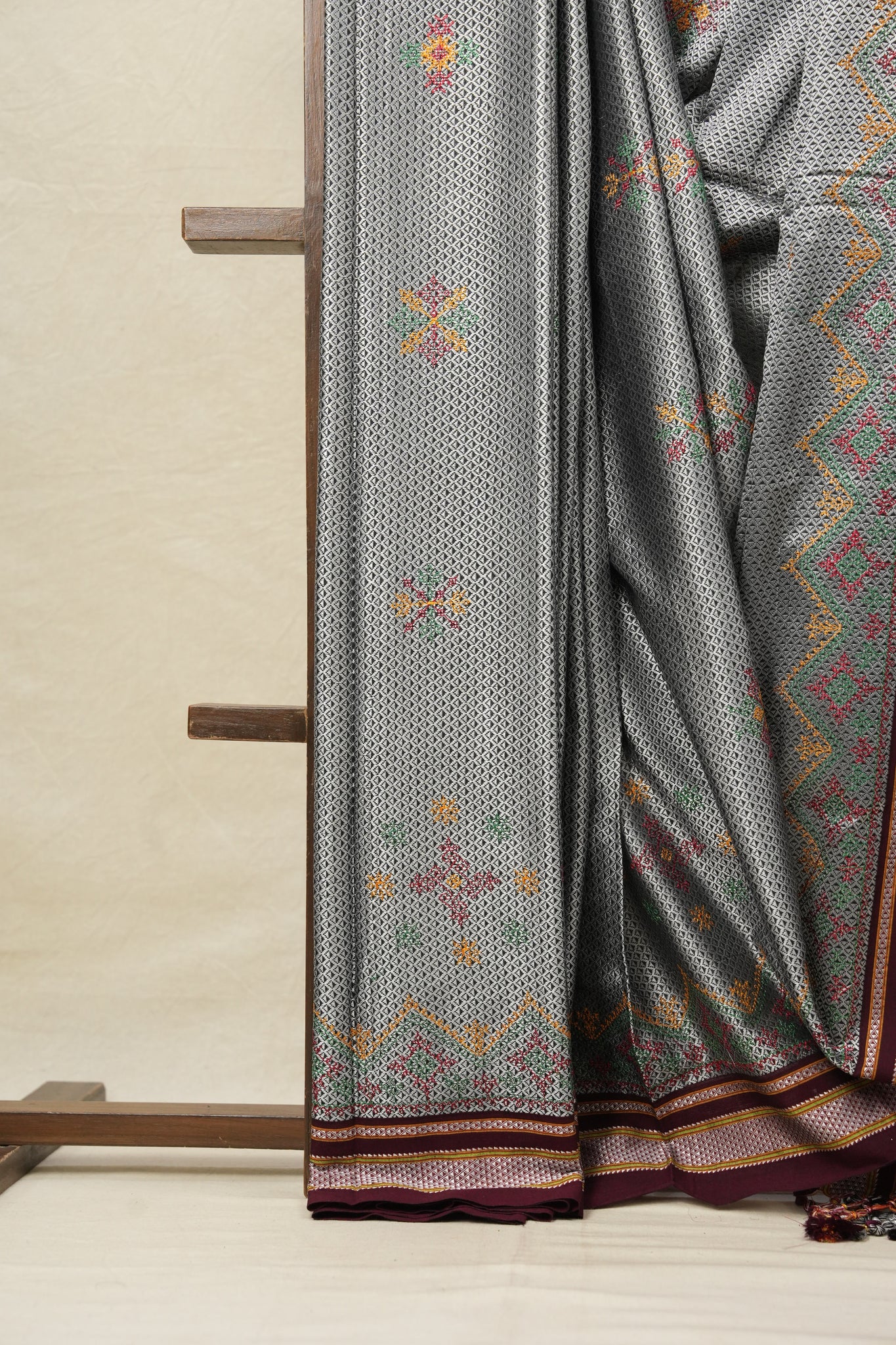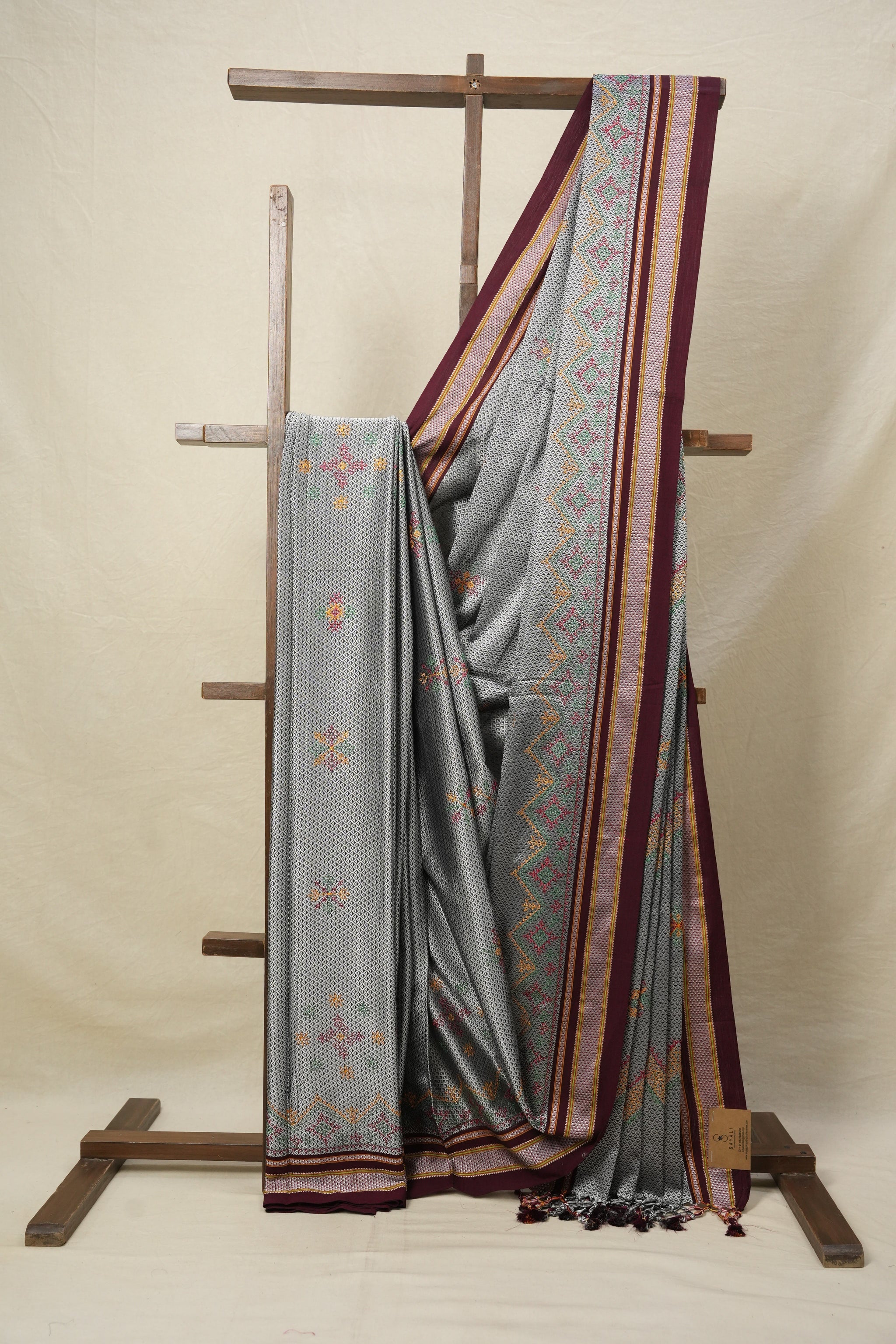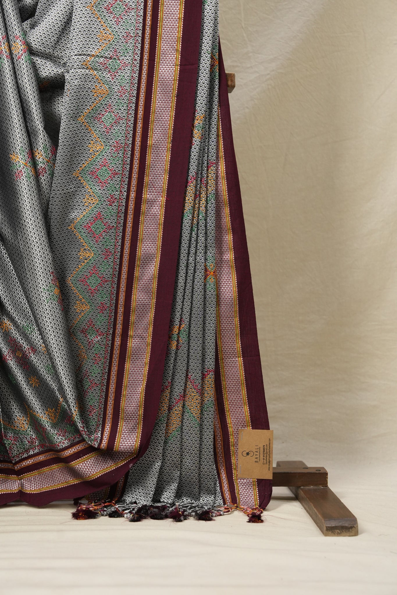 Work - Kasuti Khun saree adorned with intricate machine-embroidered motifs on a grey base, complemented by a zig-zag border and tasselled pallu.