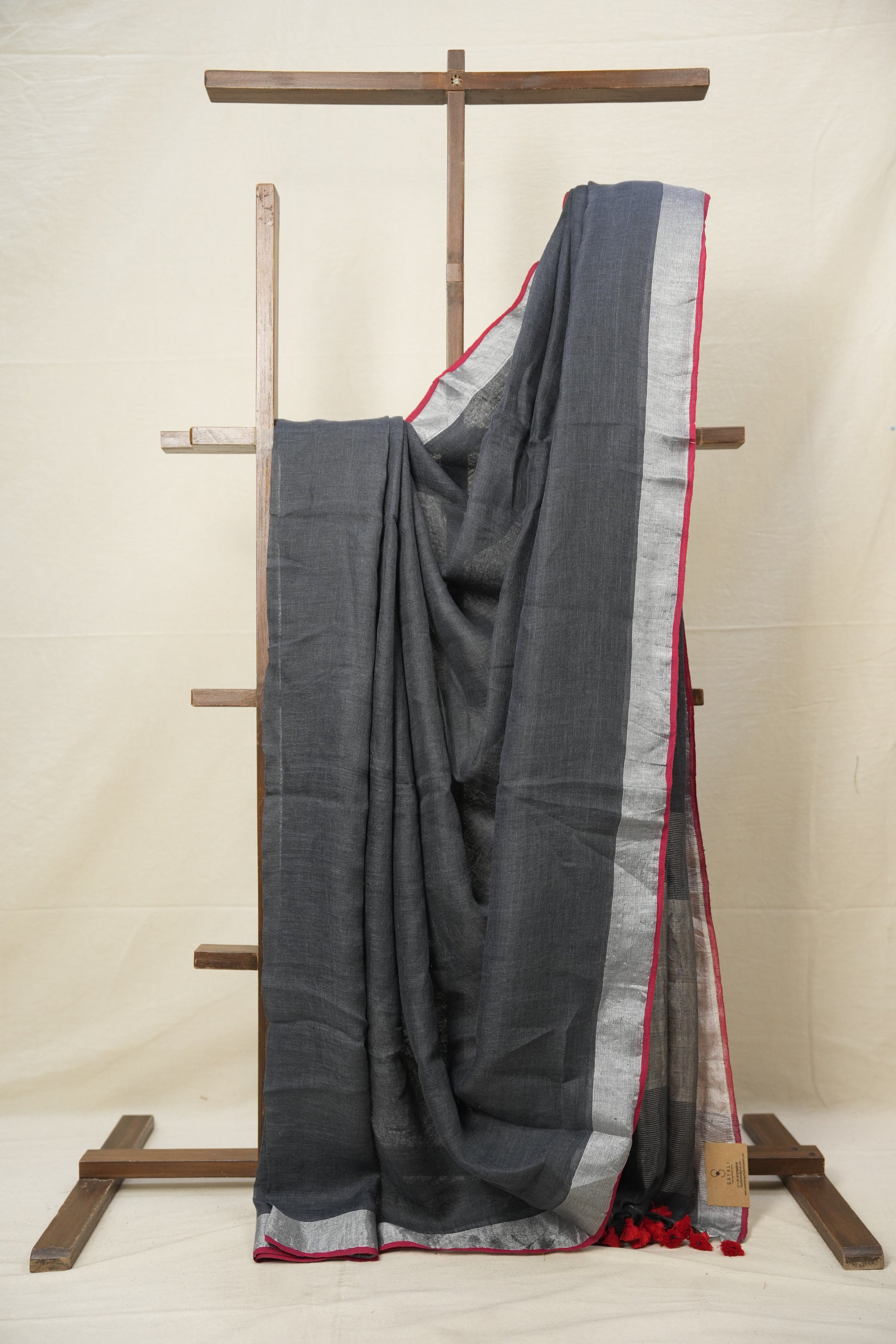 Grey Plain Linen Saree With Red Tassels - SRGPLS331