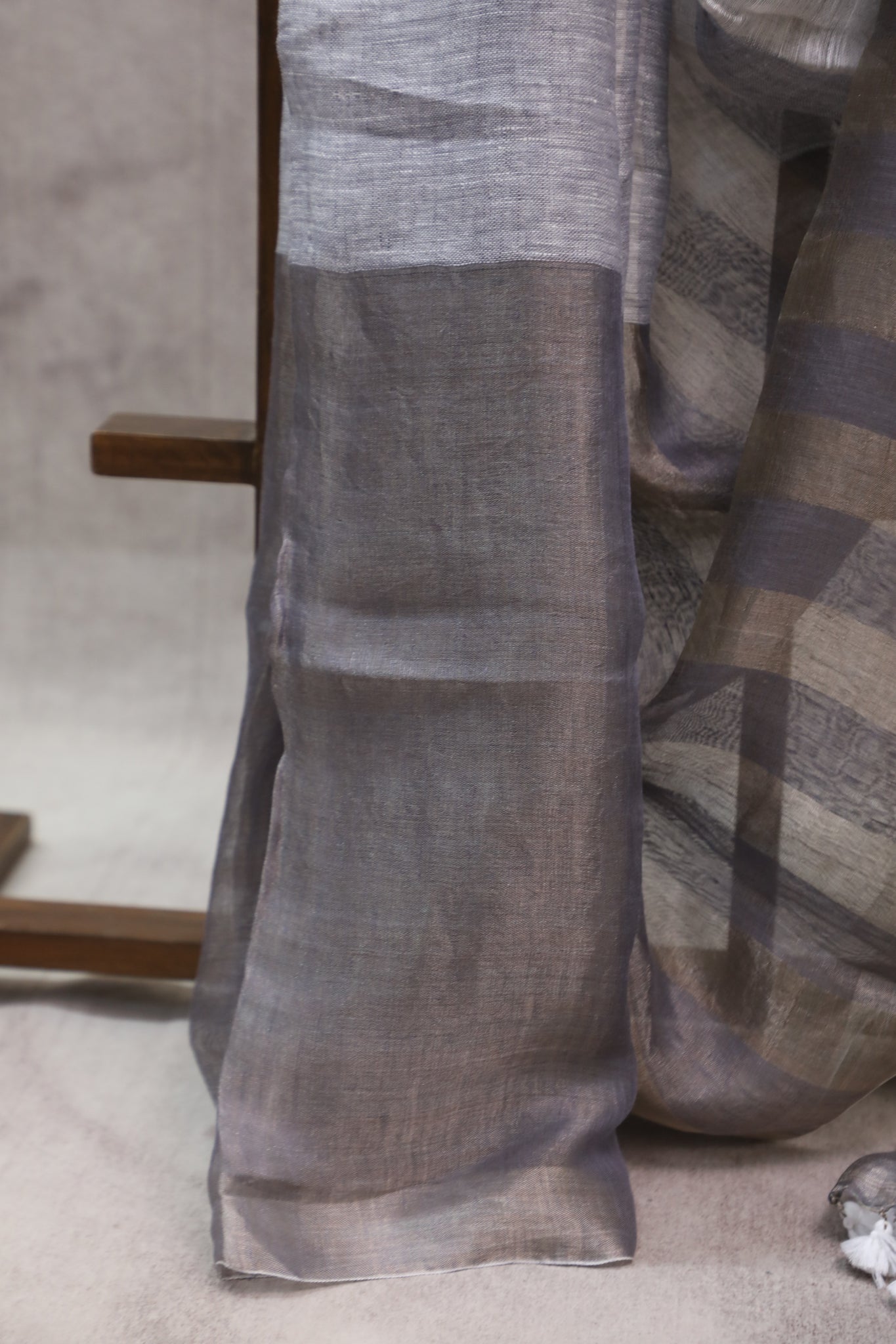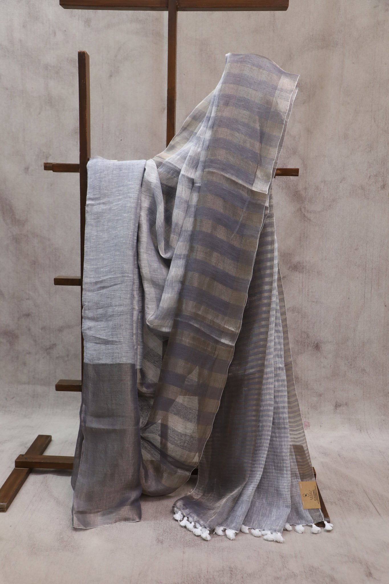 Handloom greyish blue plain linen saree with silver border. All over stripe design all over body with white tassels on pallu and running blouse piece.