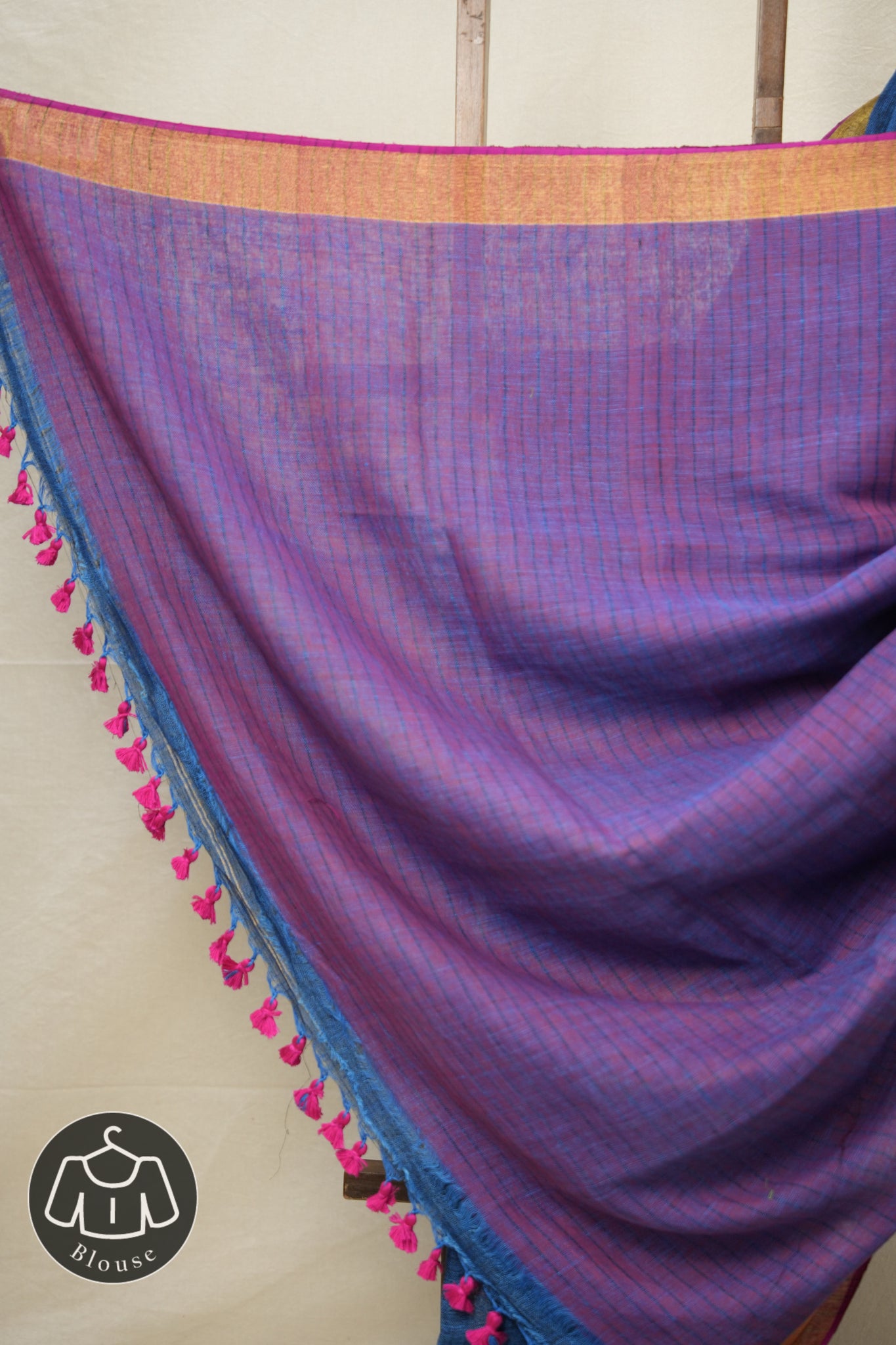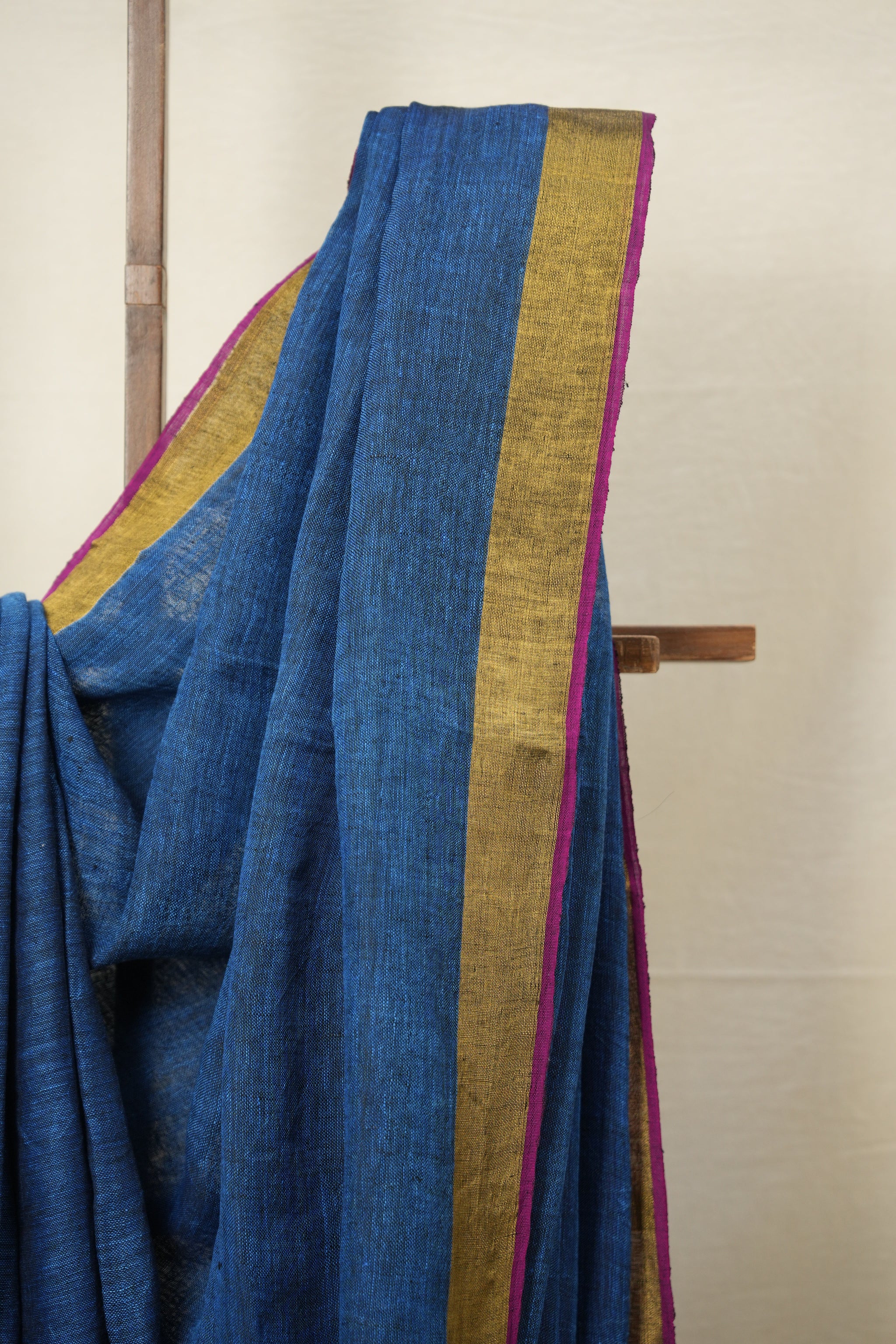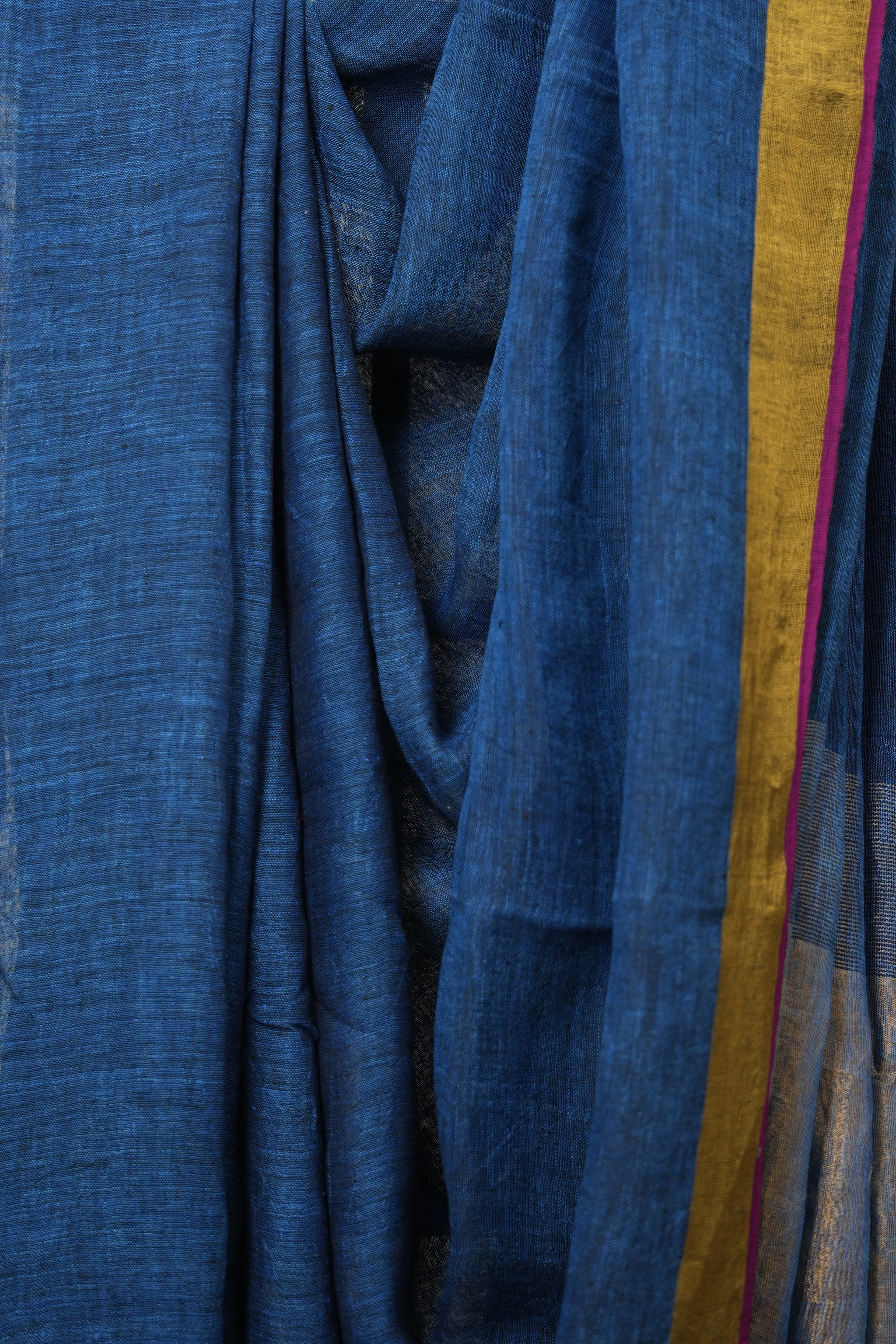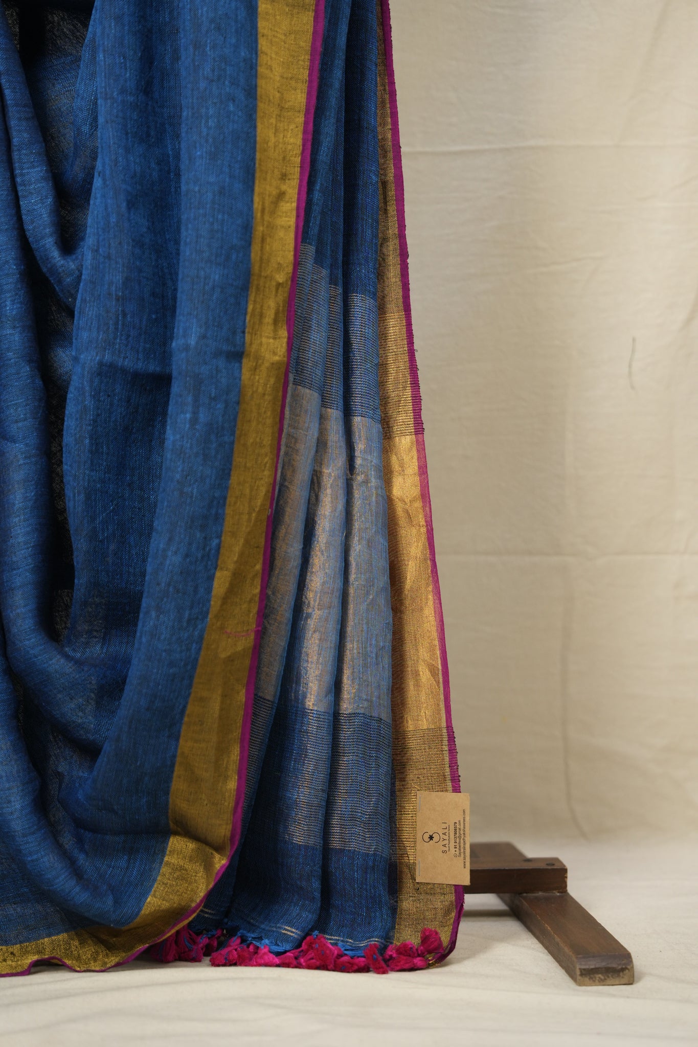 Indigo Blue Plain Linen Saree With Pink Tassels - SRIBPLS338