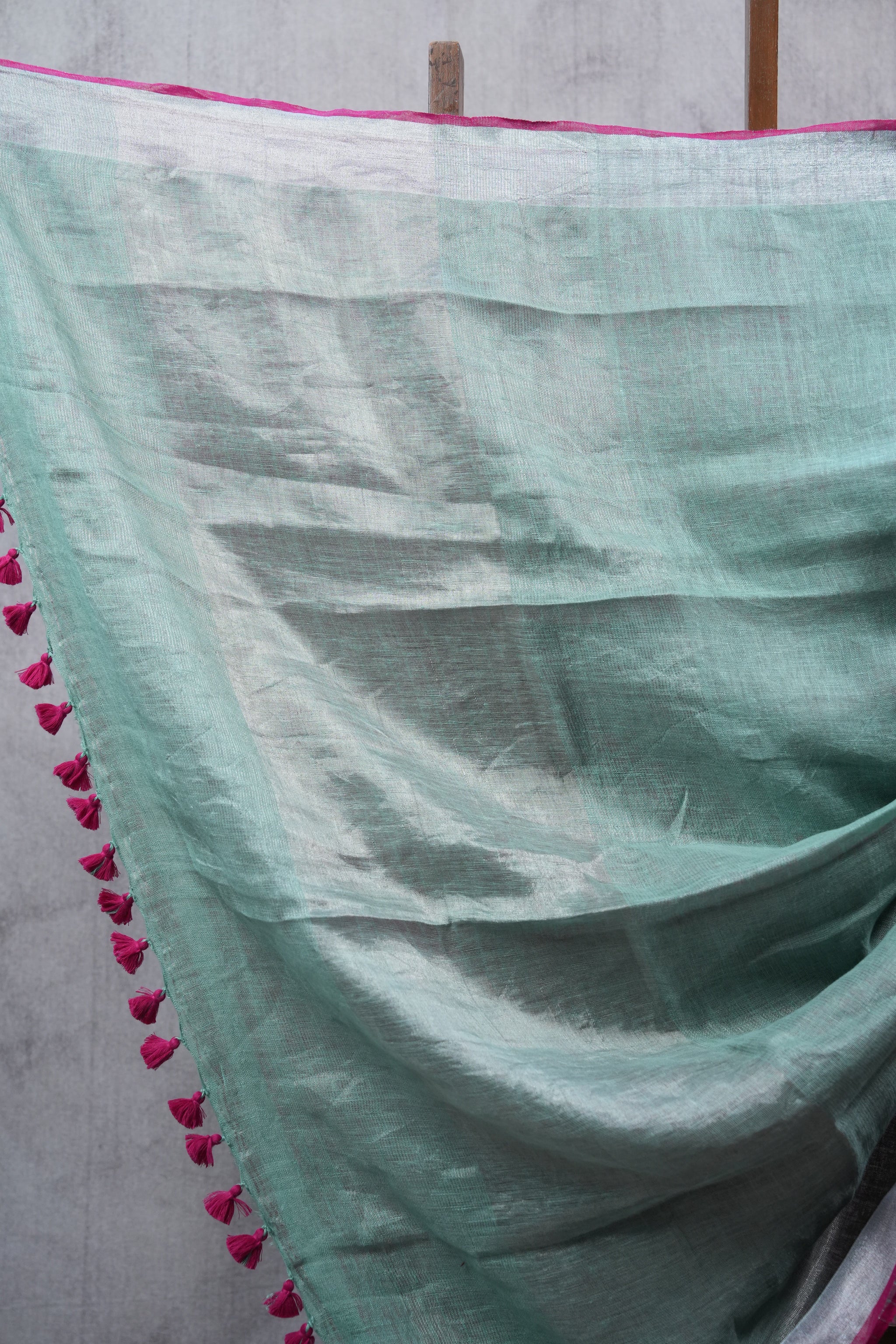 Mint Green Plain Linen Saree With Tassels - SRMGPLS259