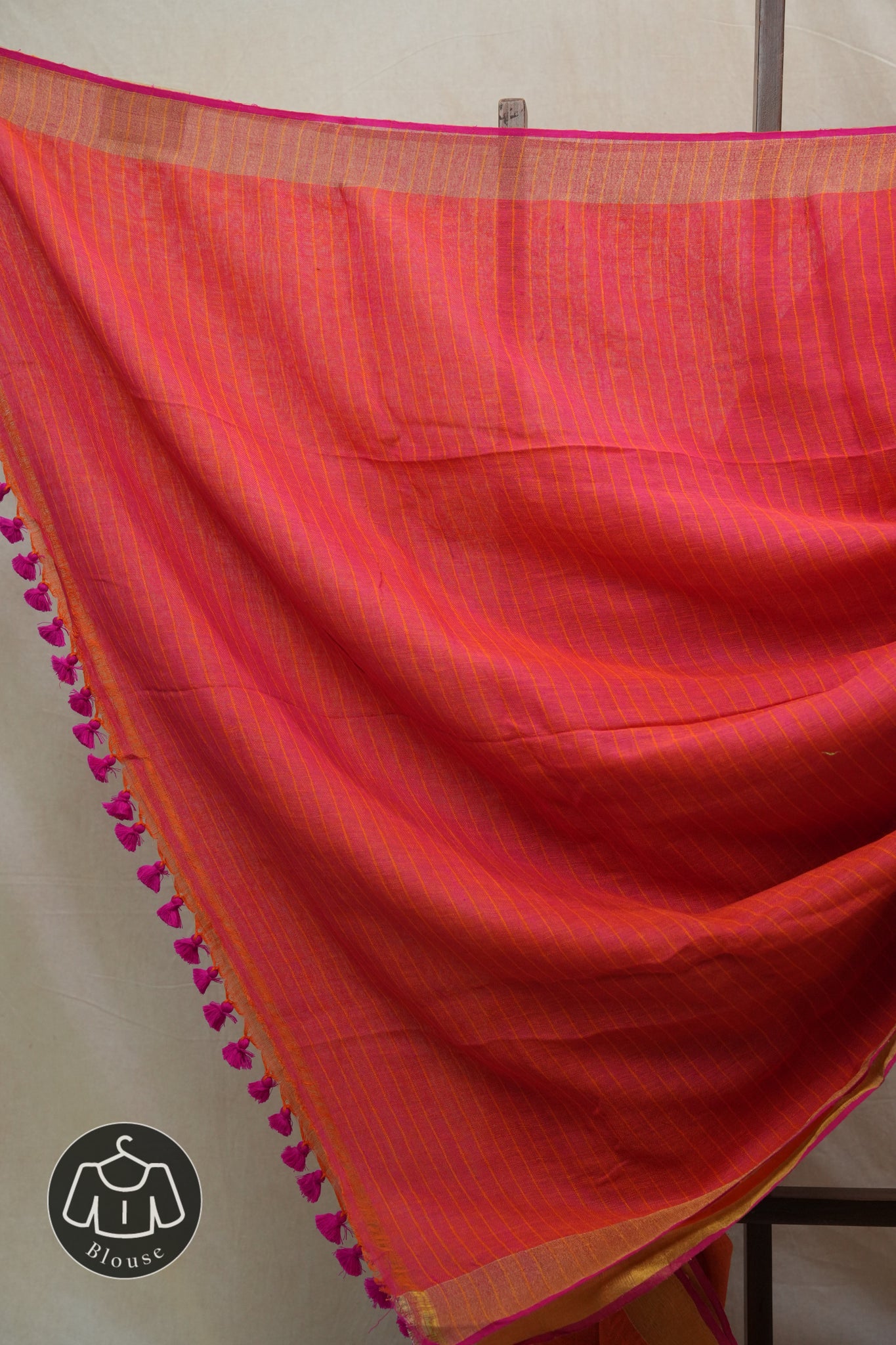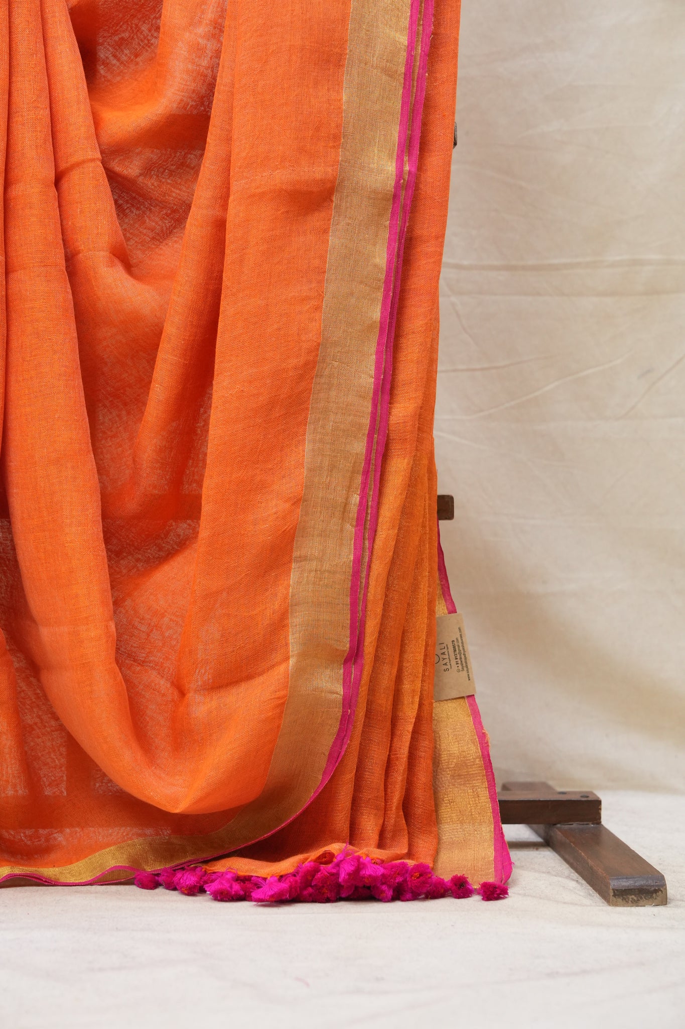 Orange Plain Linen Saree With Pink Tassels - SROPLS302
