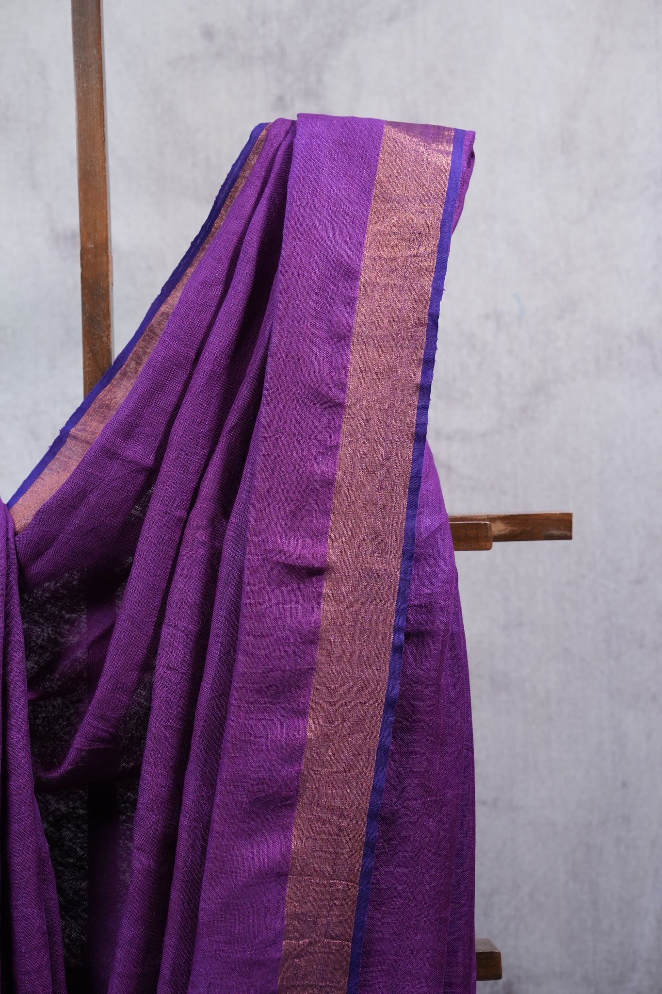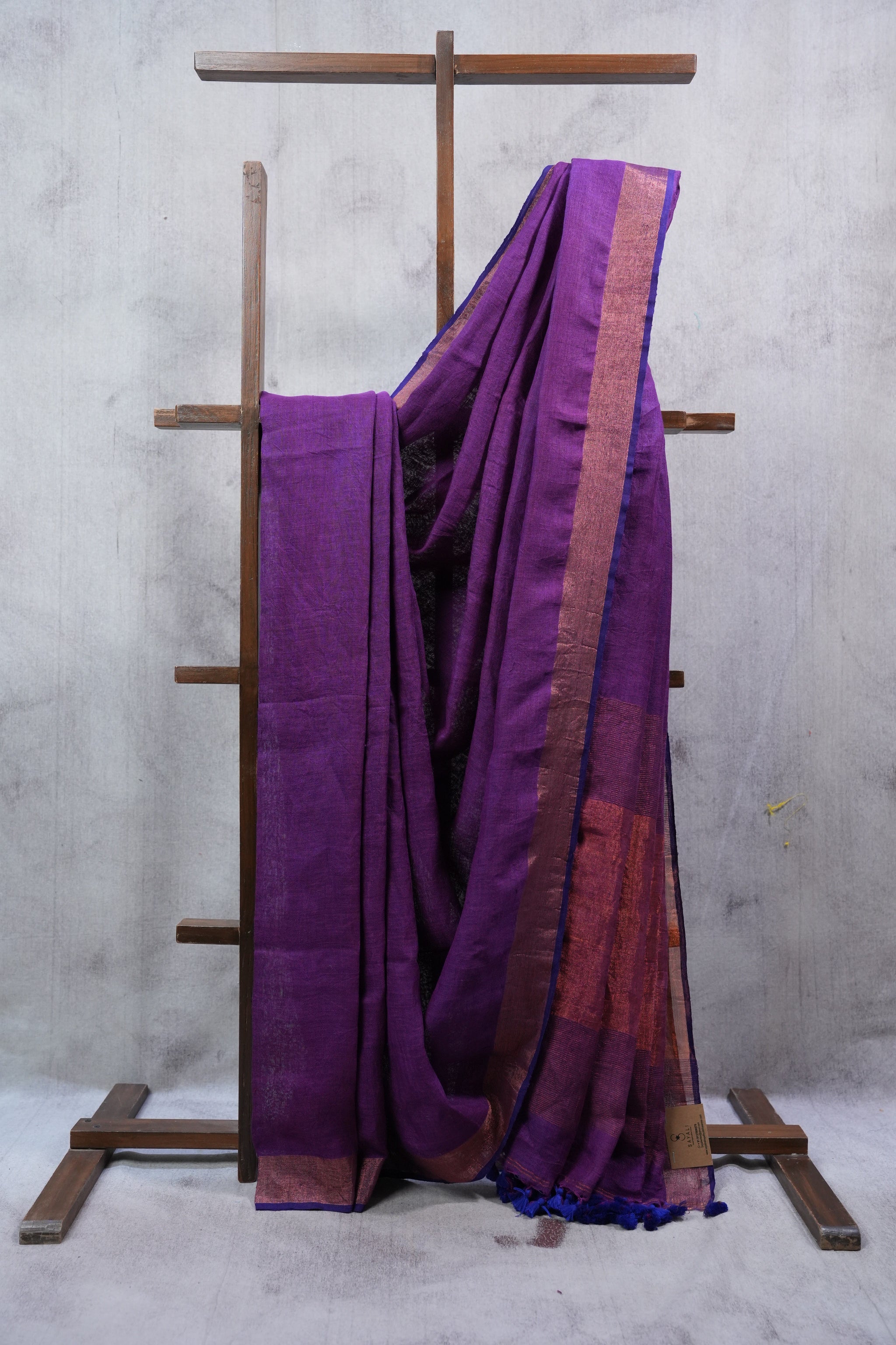 Work - This is a plain linen saree in purple with a contrasting golden zari border and pallu, finished with hand-tied tassels for a subtle yet elegant look.