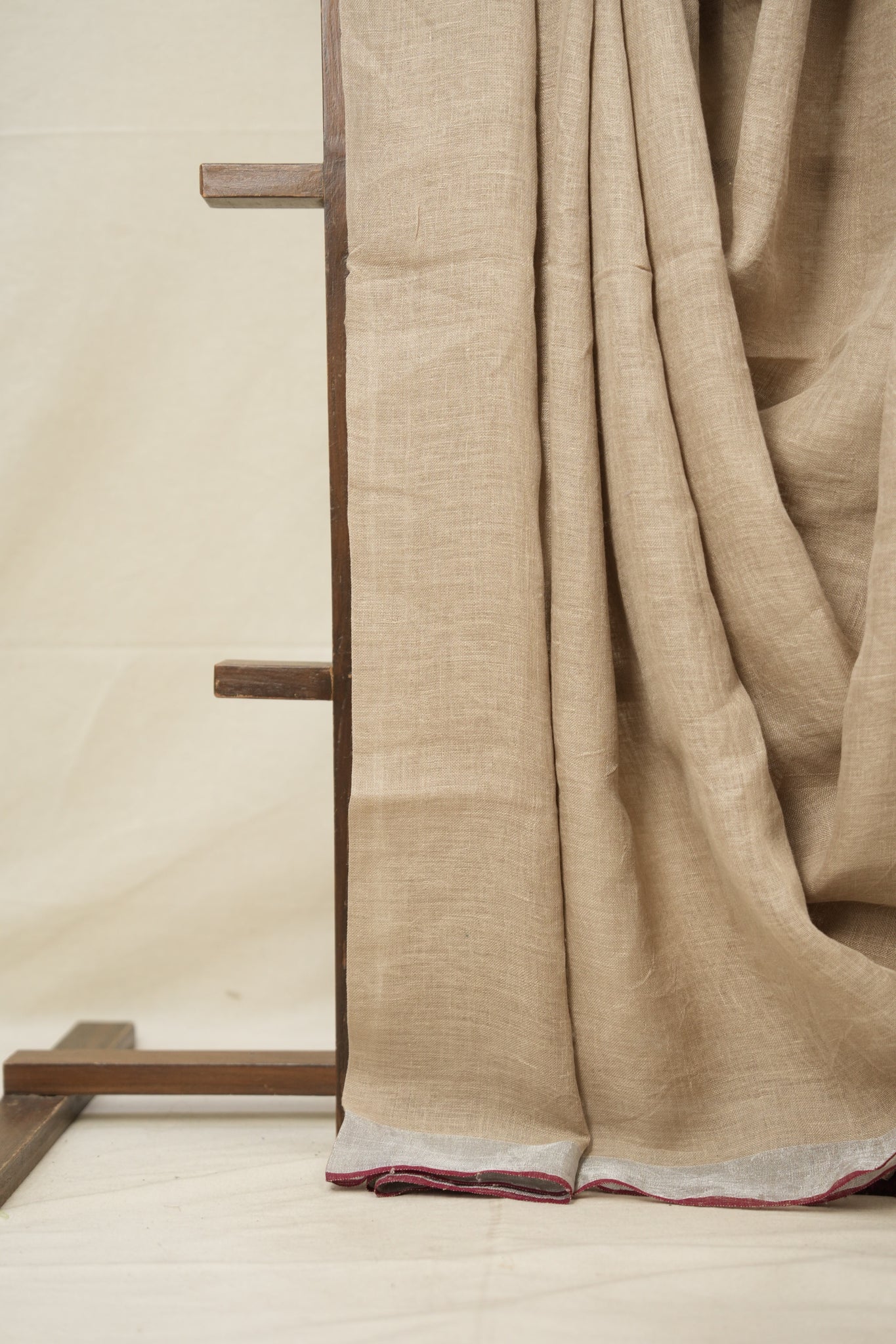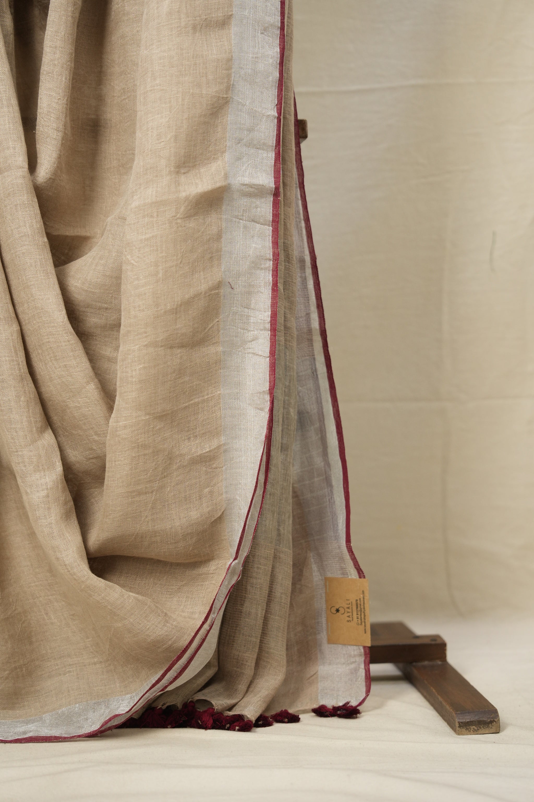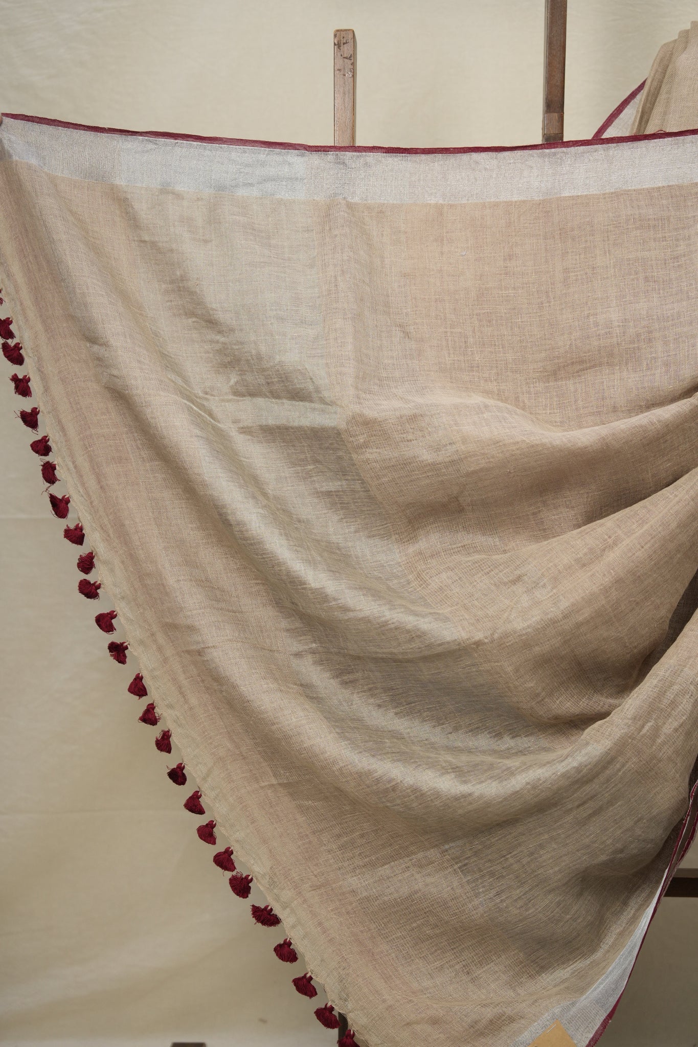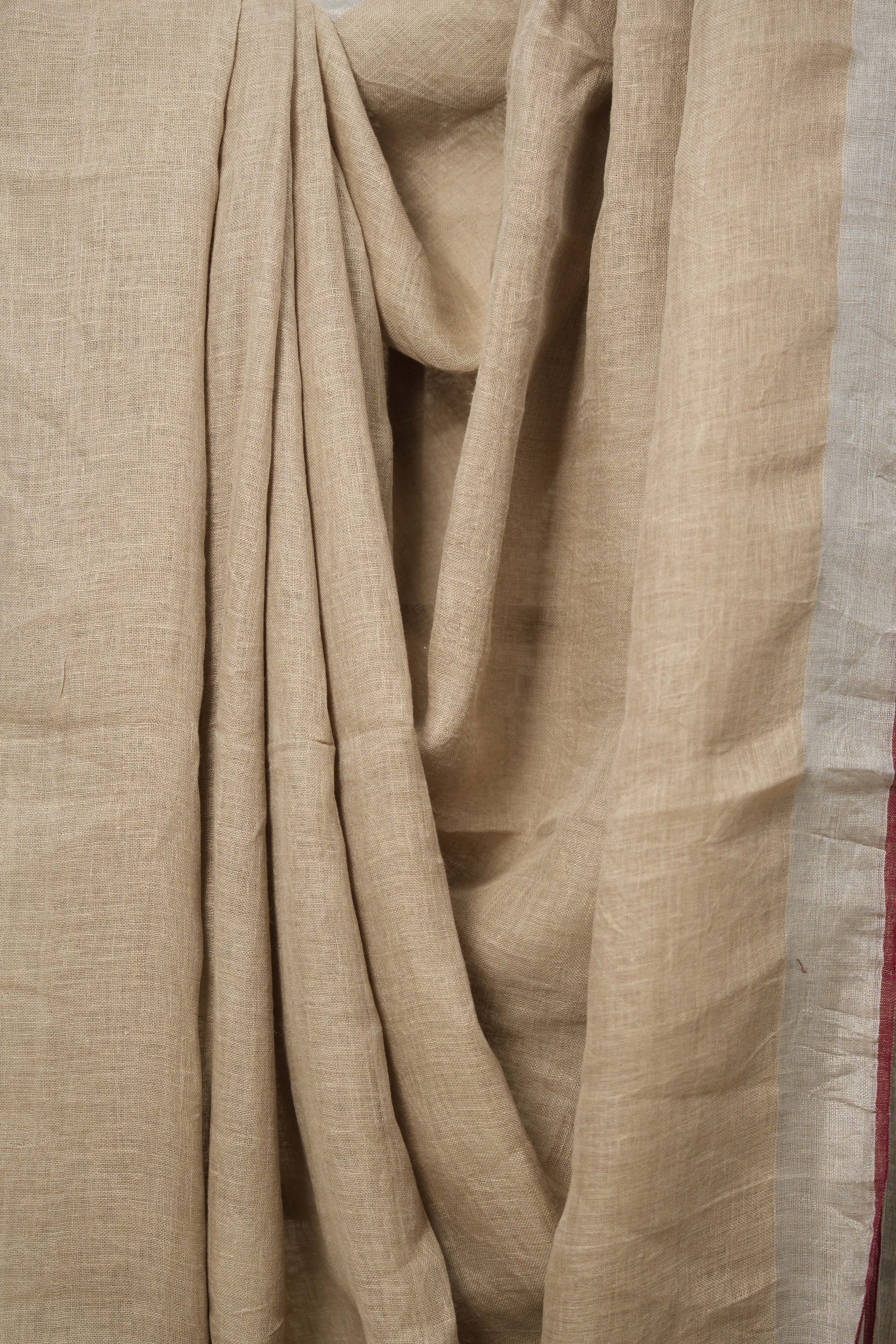 Wheat Gold Plain Linen Saree With Maroon Tassels - SRWGPLS332
