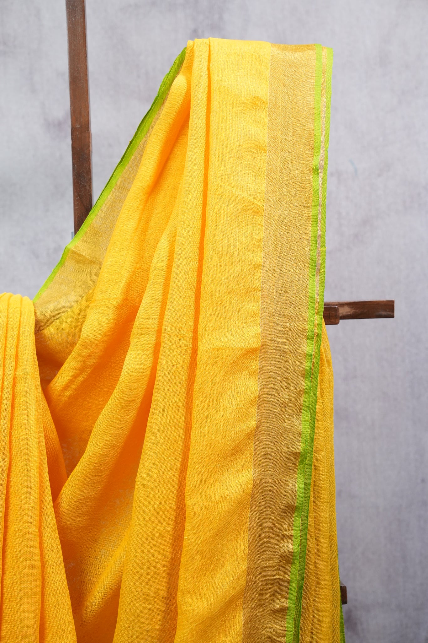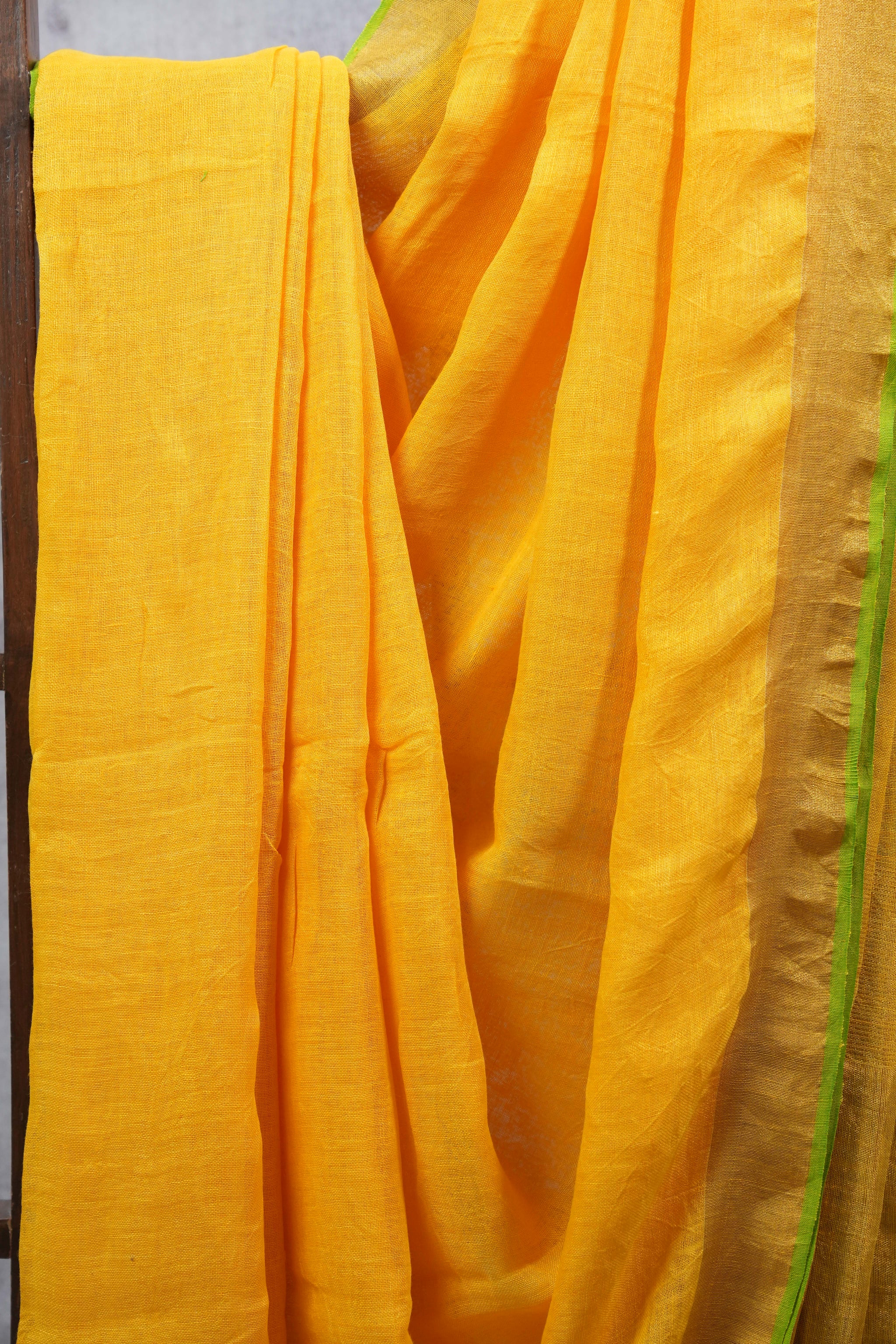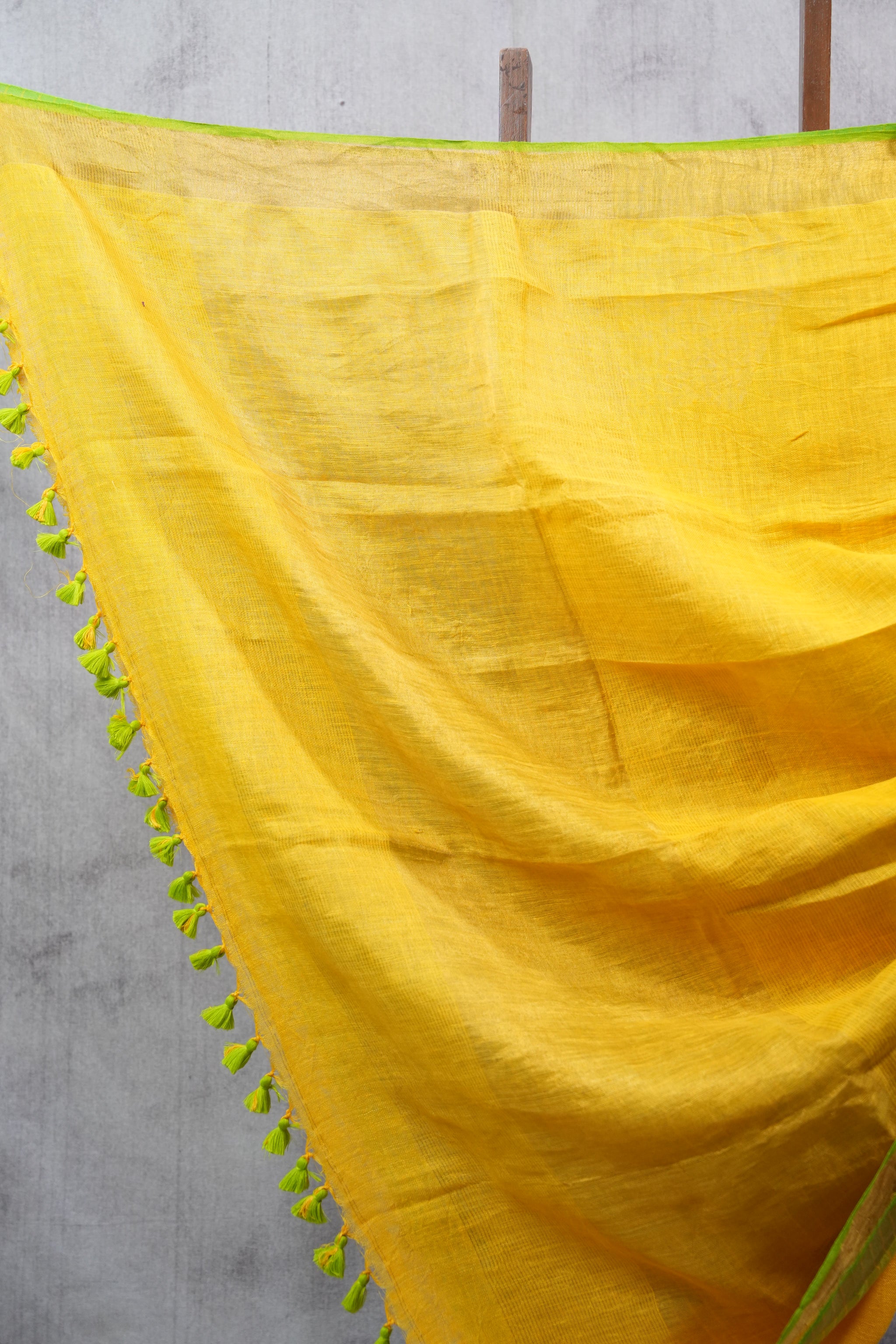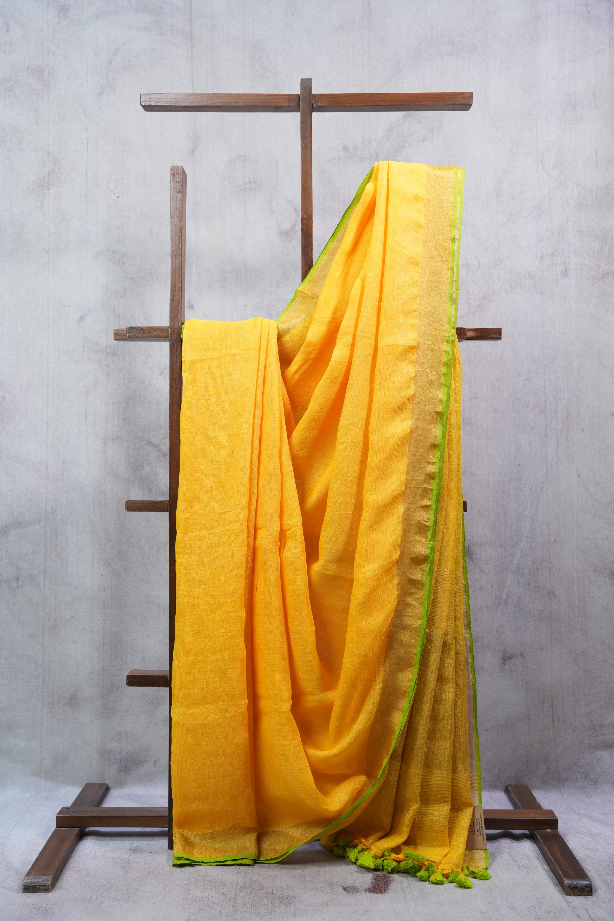 Work - This is a plain linen saree in yellow with a contrasting golden zari border and pallu, finished with hand-tied tassels for a subtle yet elegant look.