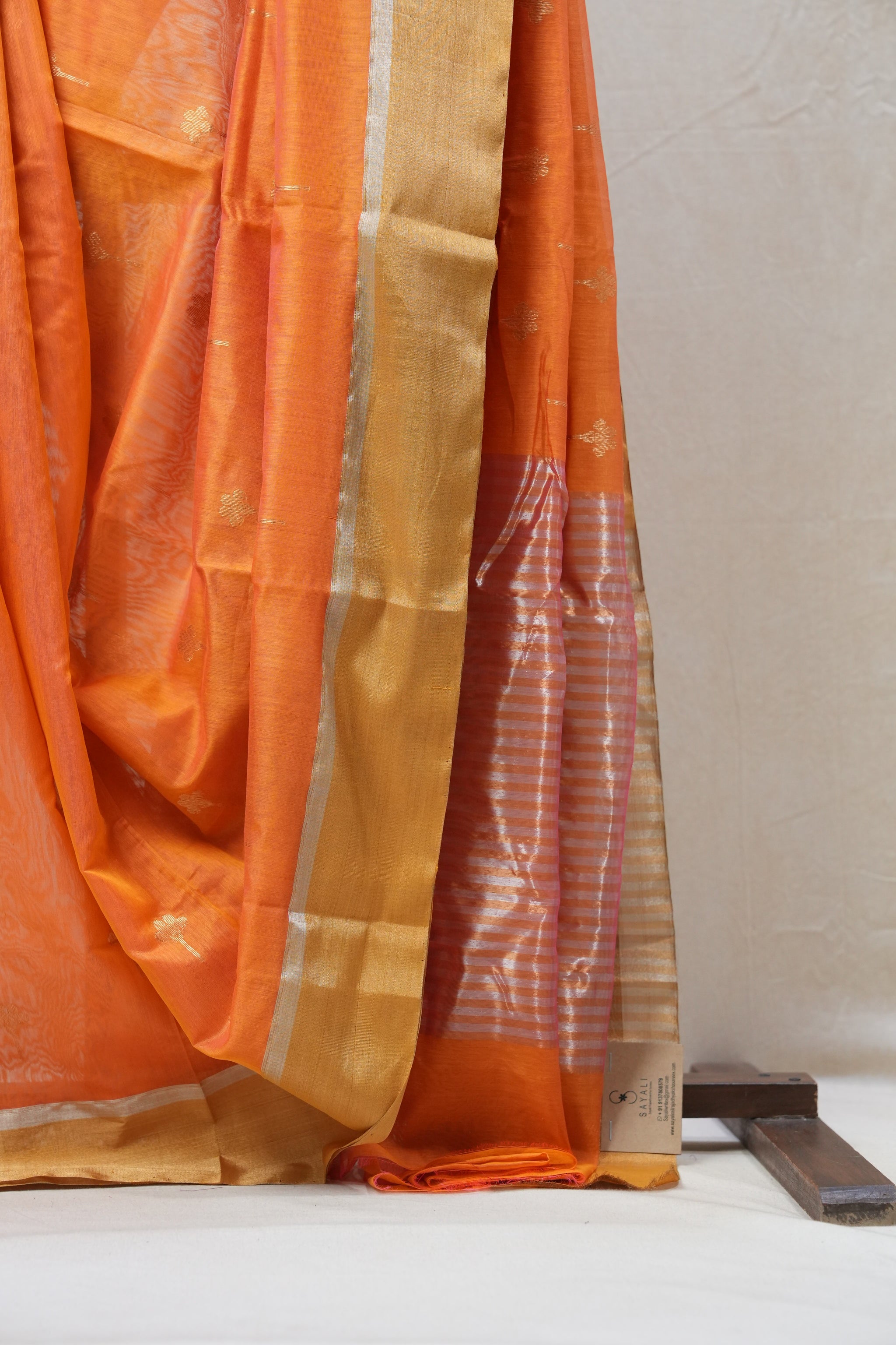 Work - Chanderi cotton silk saree with orange body, gold buti motifs, and elegant zari border.