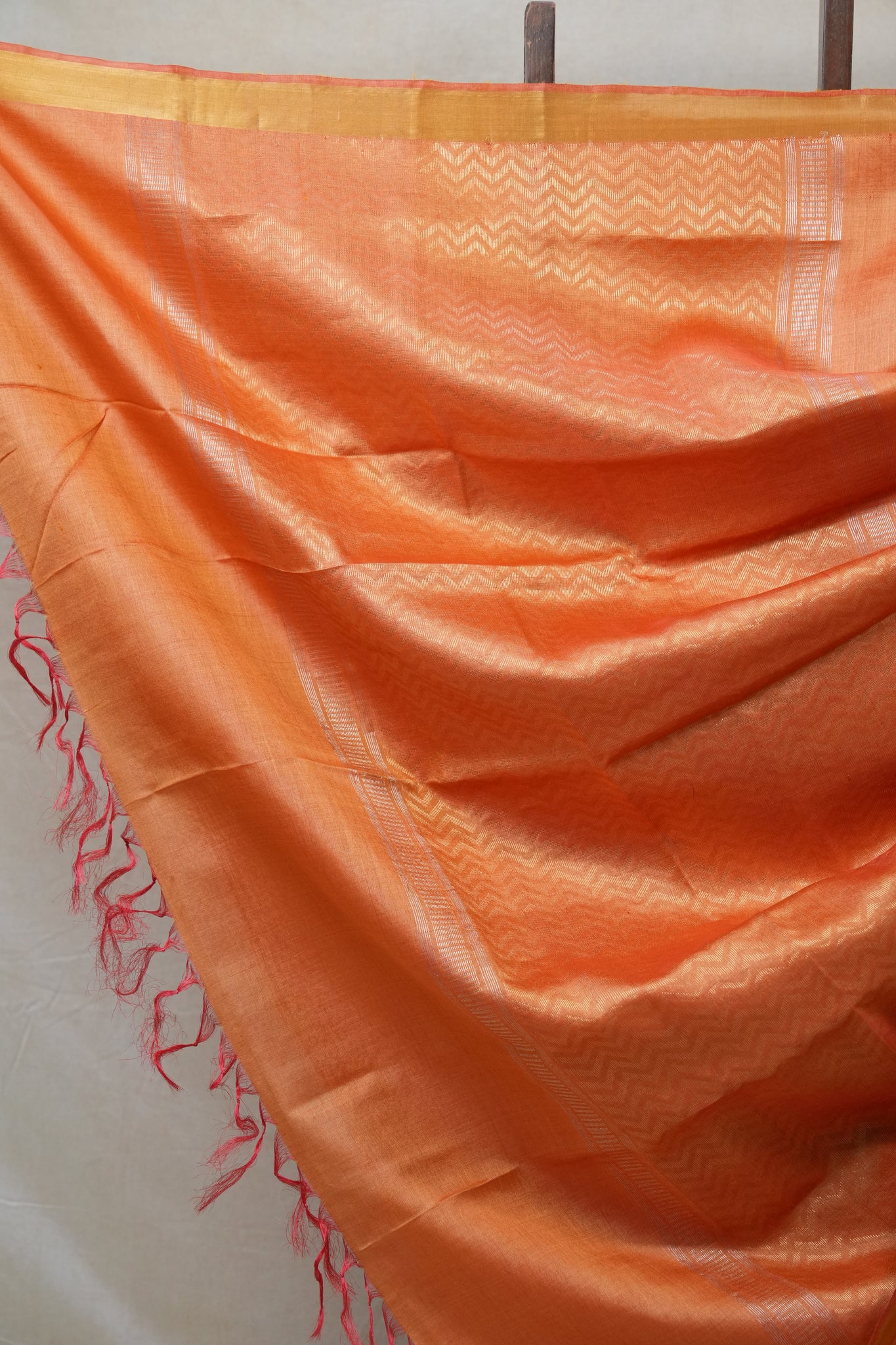 Work - This orange saree features small woven motifs across the body, complemented by a golden zari border with subtle geometric detailing.
