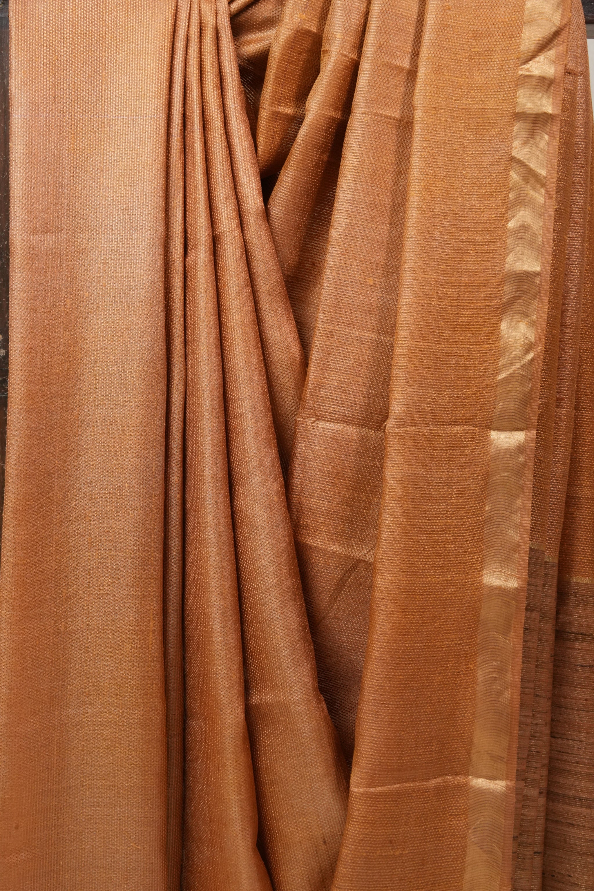 Work - This is a orange tussar saree with a self-woven geometric or striped pattern and a subtle, ornate border.