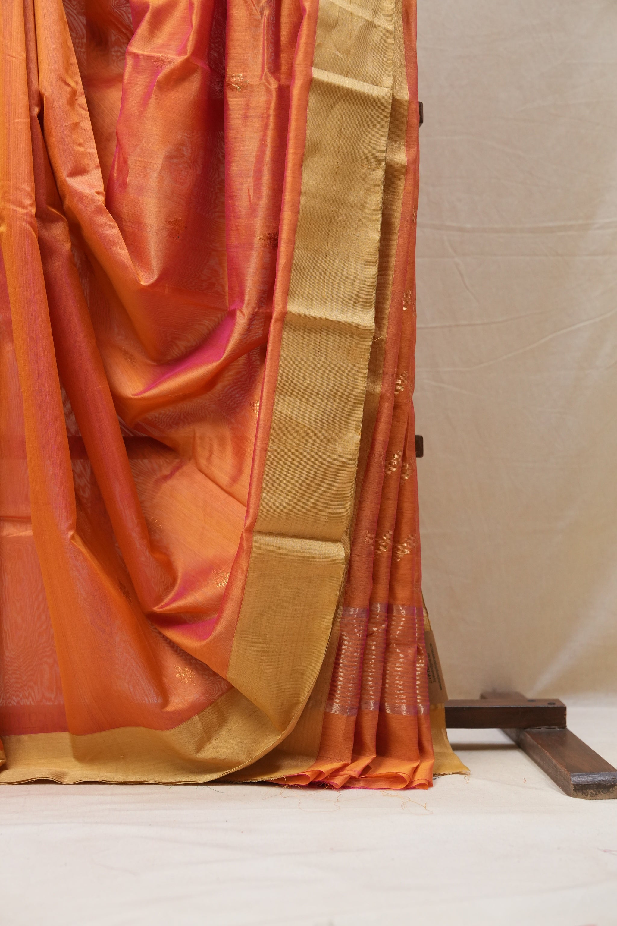Work - Chanderi cotton silk saree with two tone orange body, gold buti motifs, and elegant zari border.