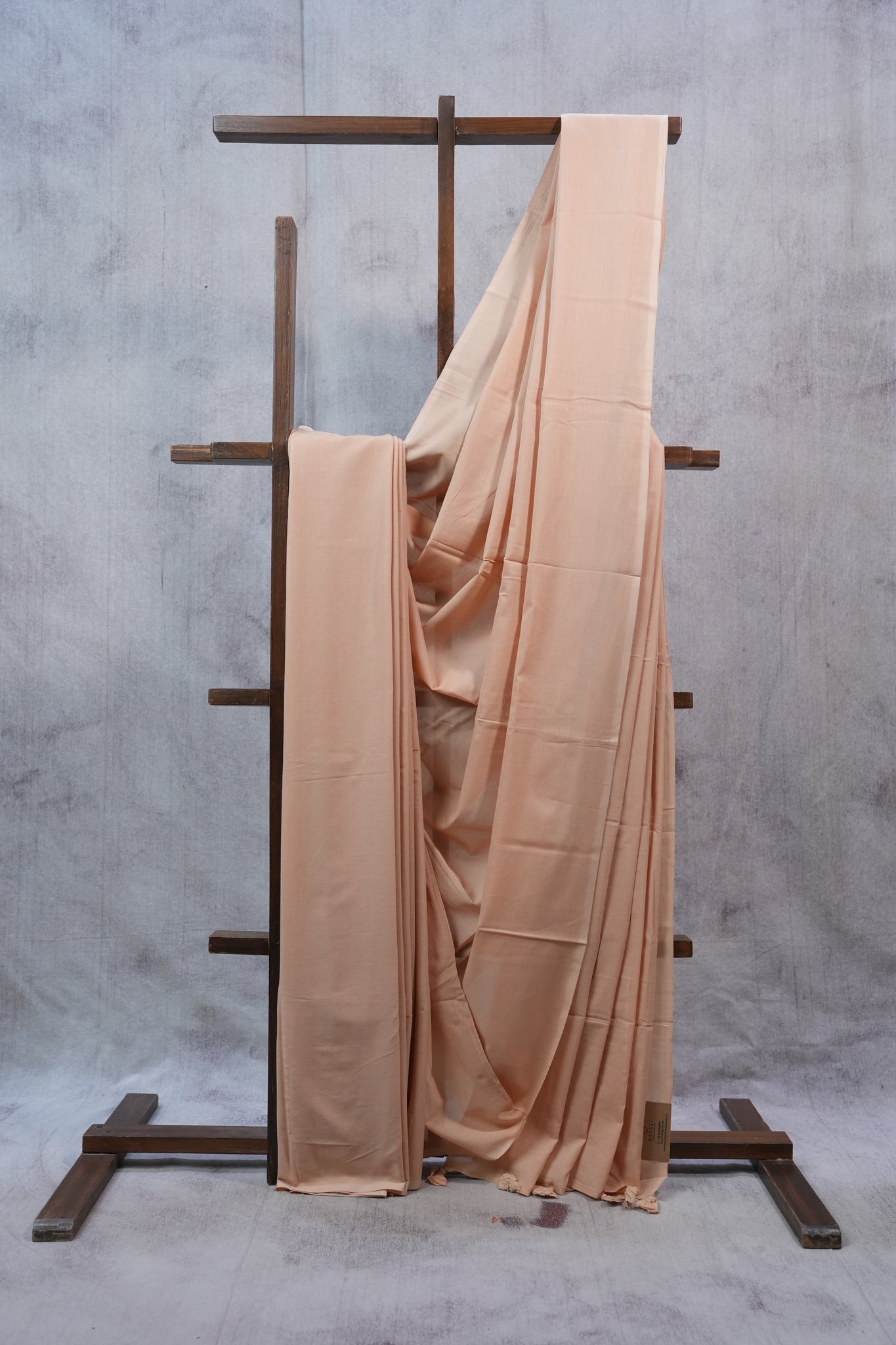 Work - This Mul Cotton Saree features a plain peach body and matching tassels.