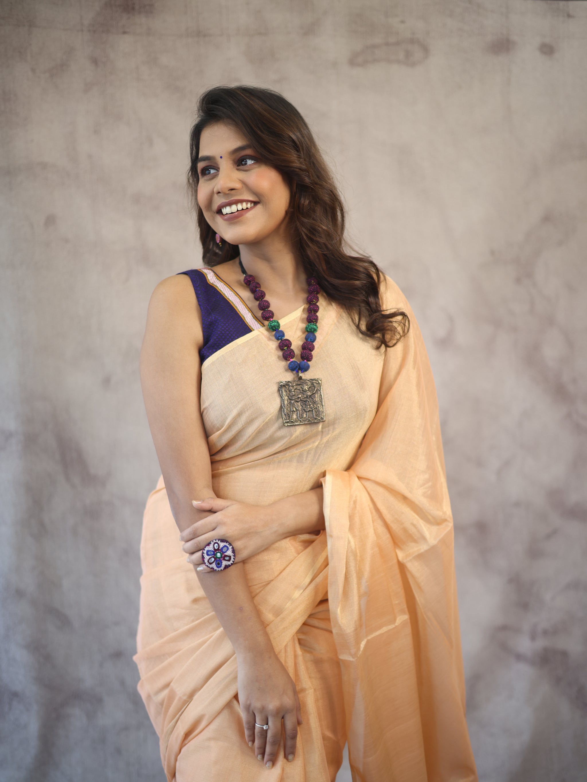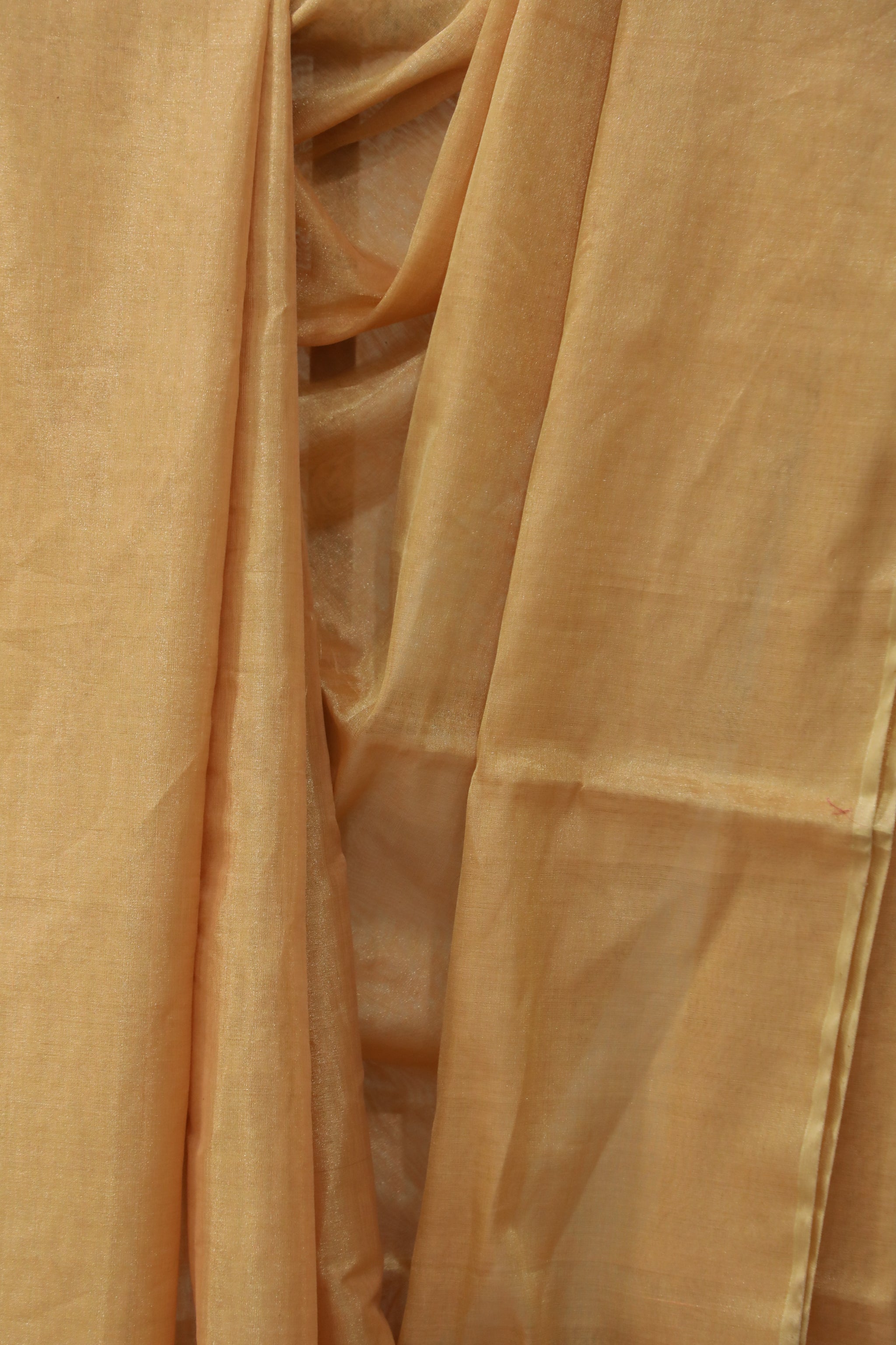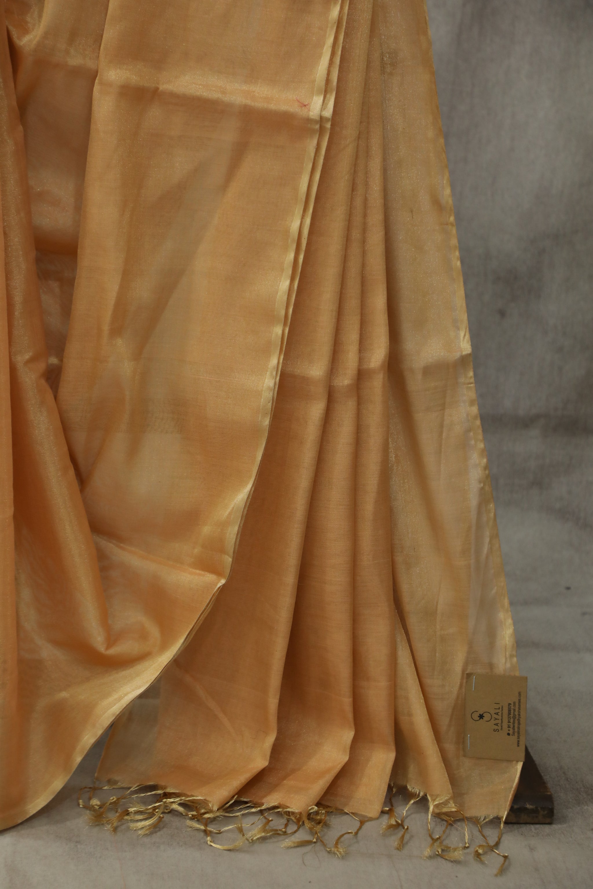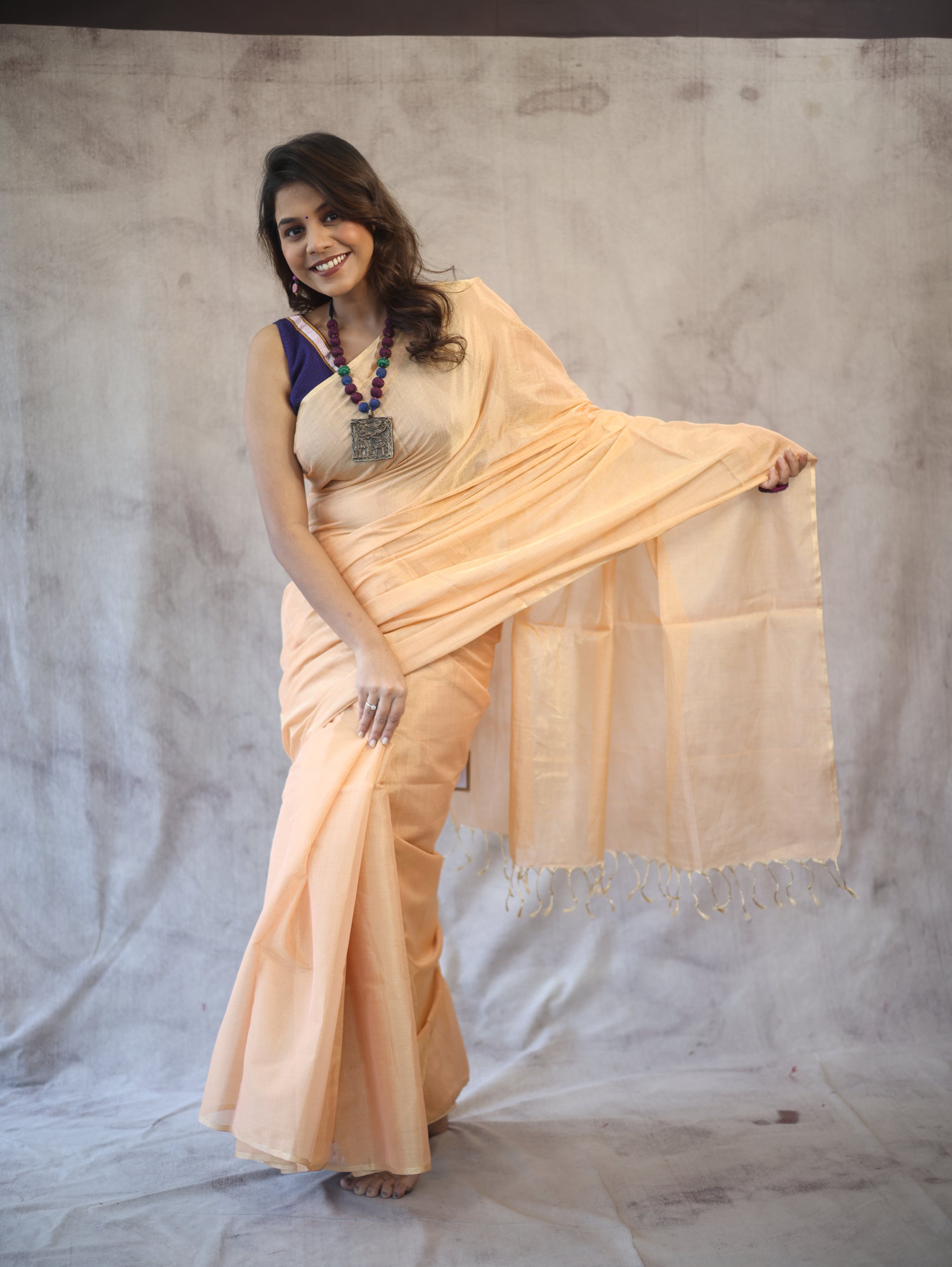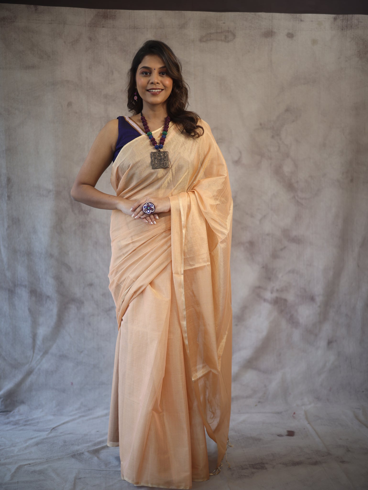 Work - The maheshwari tissue saree is a solid peach-toned fabric with a subtle shimmer and fine, self-woven horizontal lines, without prominent borders.