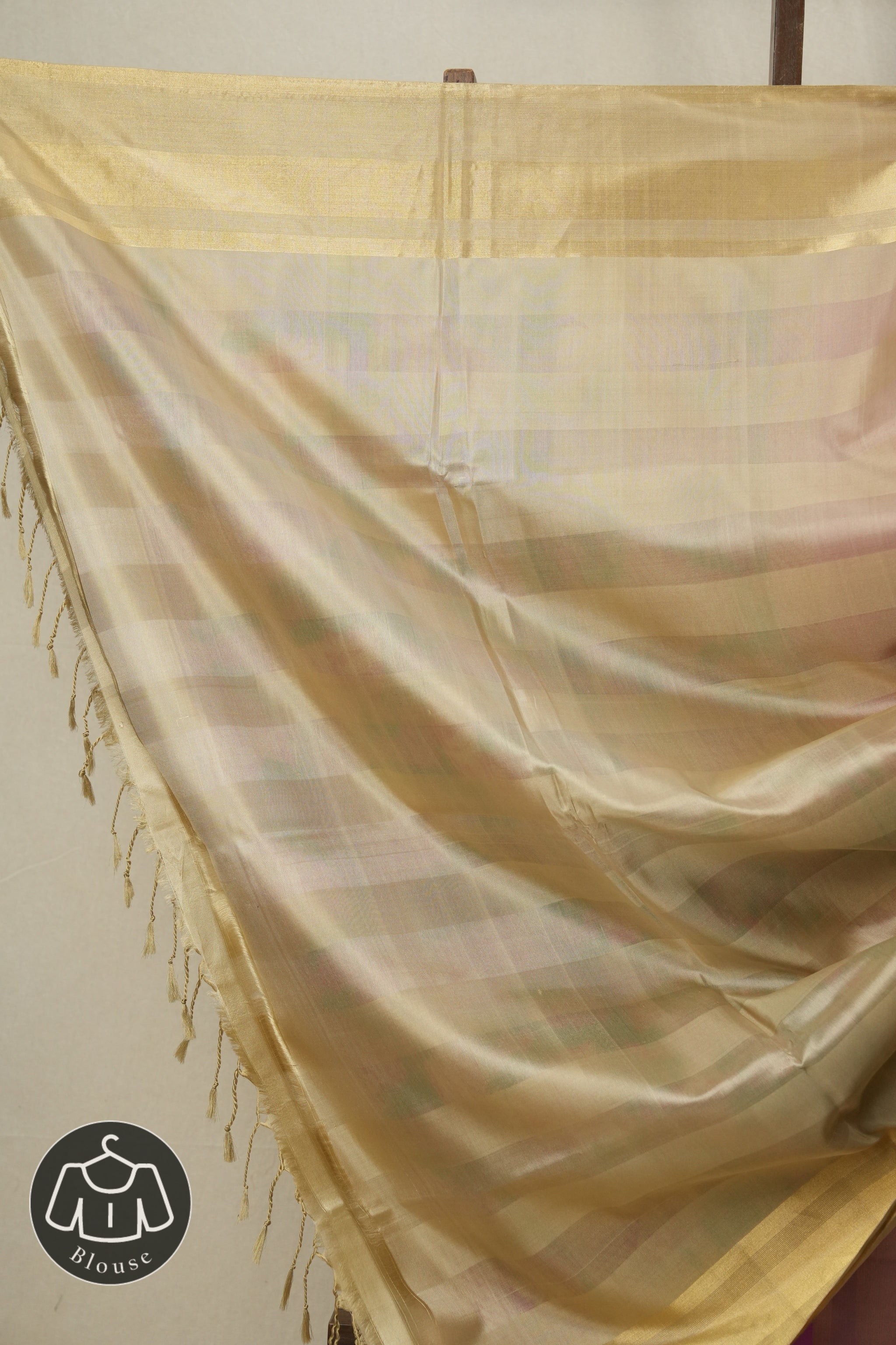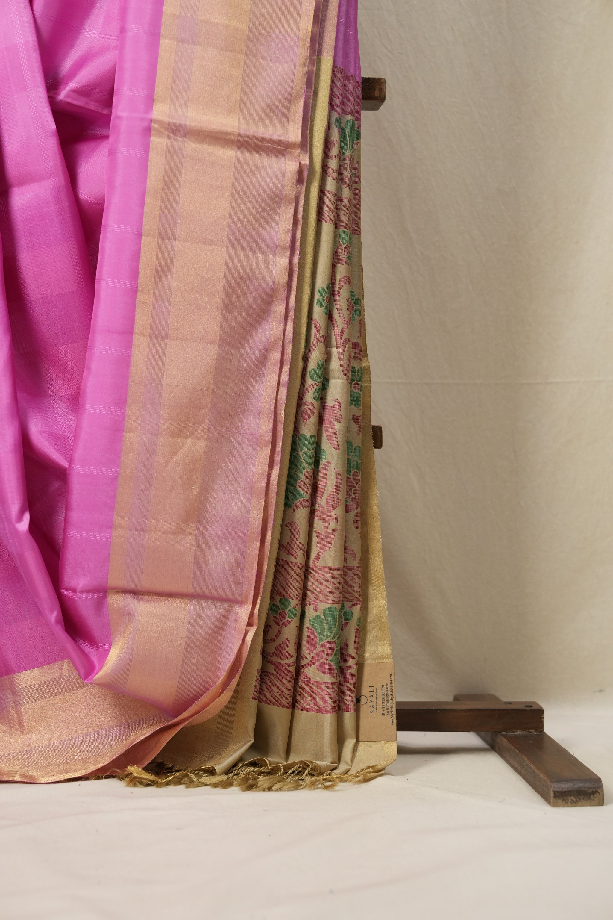 Work - This saree features floral and geometric woven patterns on the pallu (decorative end) and possibly the border.
