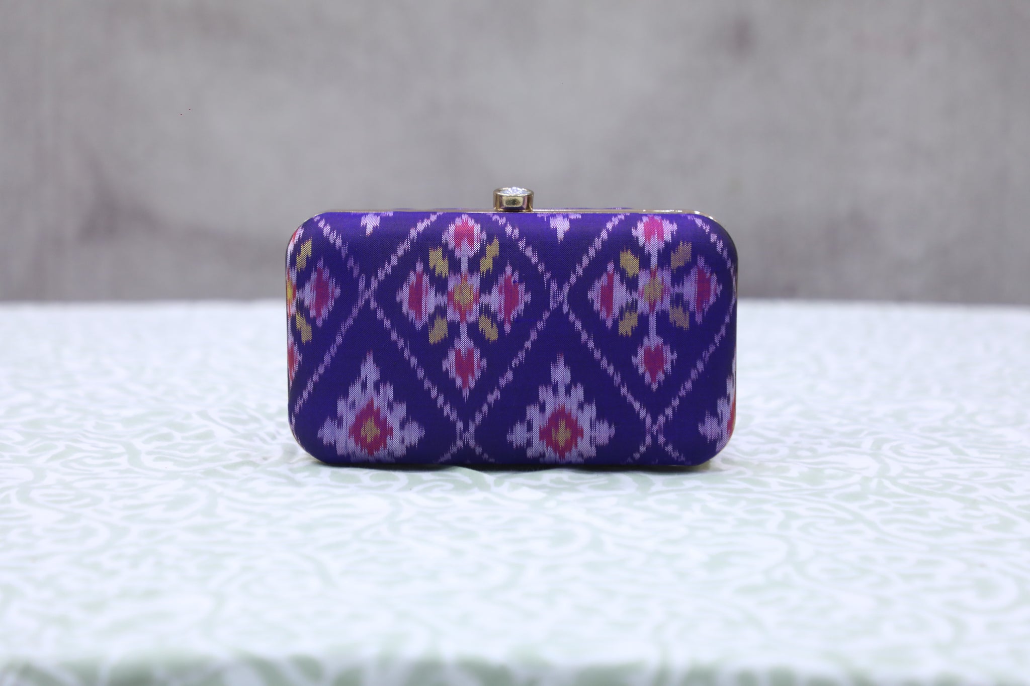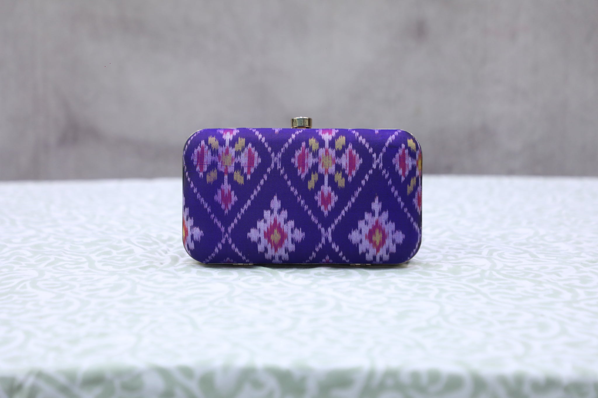 The traditional pure silk Patola textured clutch with a detachable chain strap. It has one main compartment with a click closure and another inner pocket. It is good to carry for festive, wedding occasions.