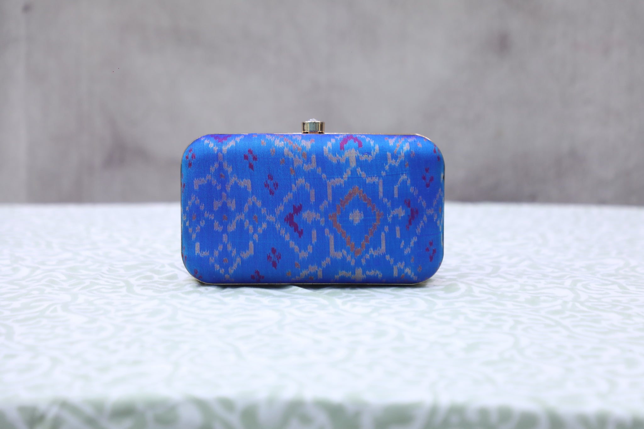 The traditional pure silk Patola textured clutch with a detachable chain strap. It has one main compartment with a click closure and another inner pocket. It is good to carry for festive, wedding occasions.