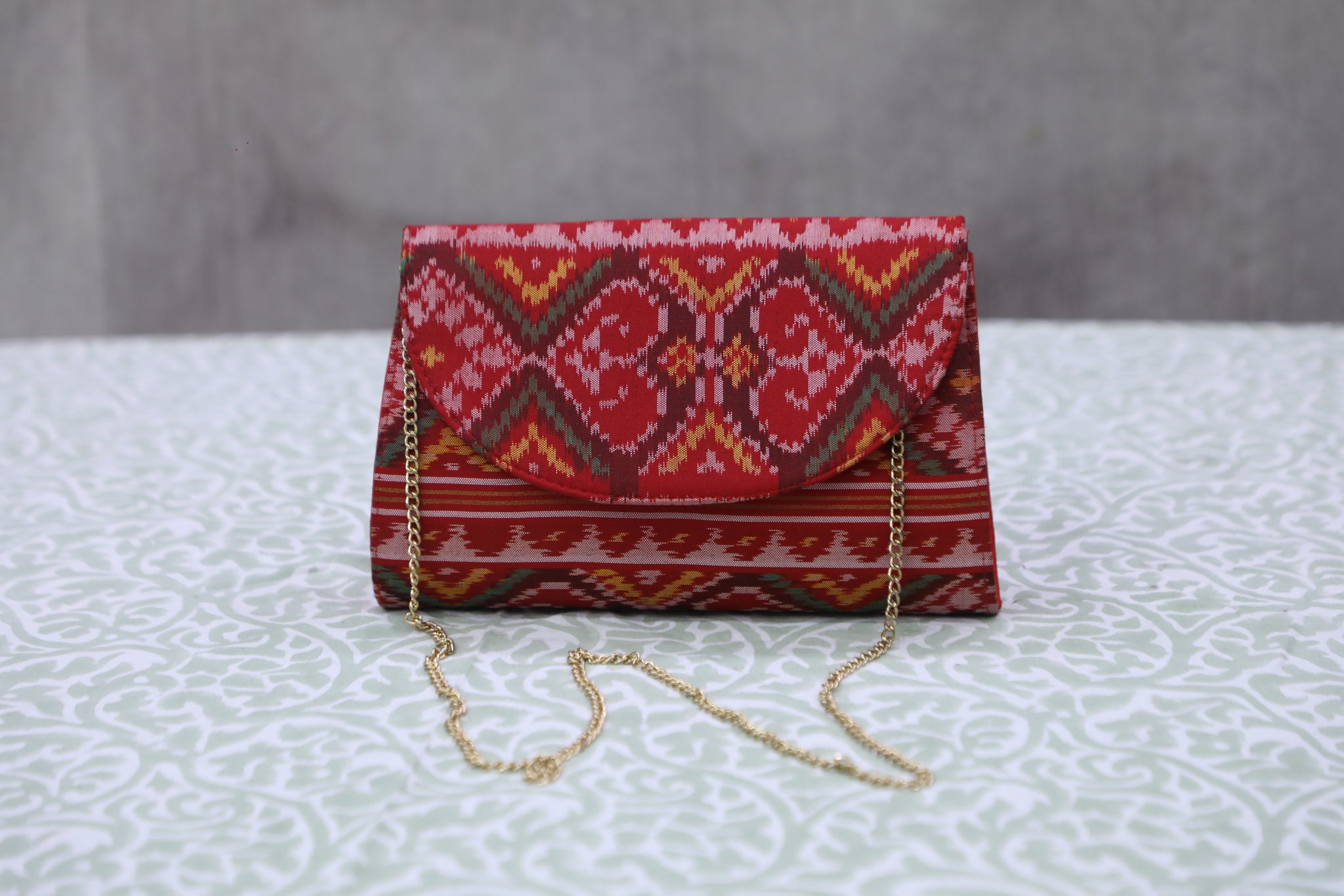 The traditional pure silk Patola textured clutch with a detachable chain strap. It has one main compartment with a click closure and another inner pocket. It is good to carry for festive, wedding occasions.