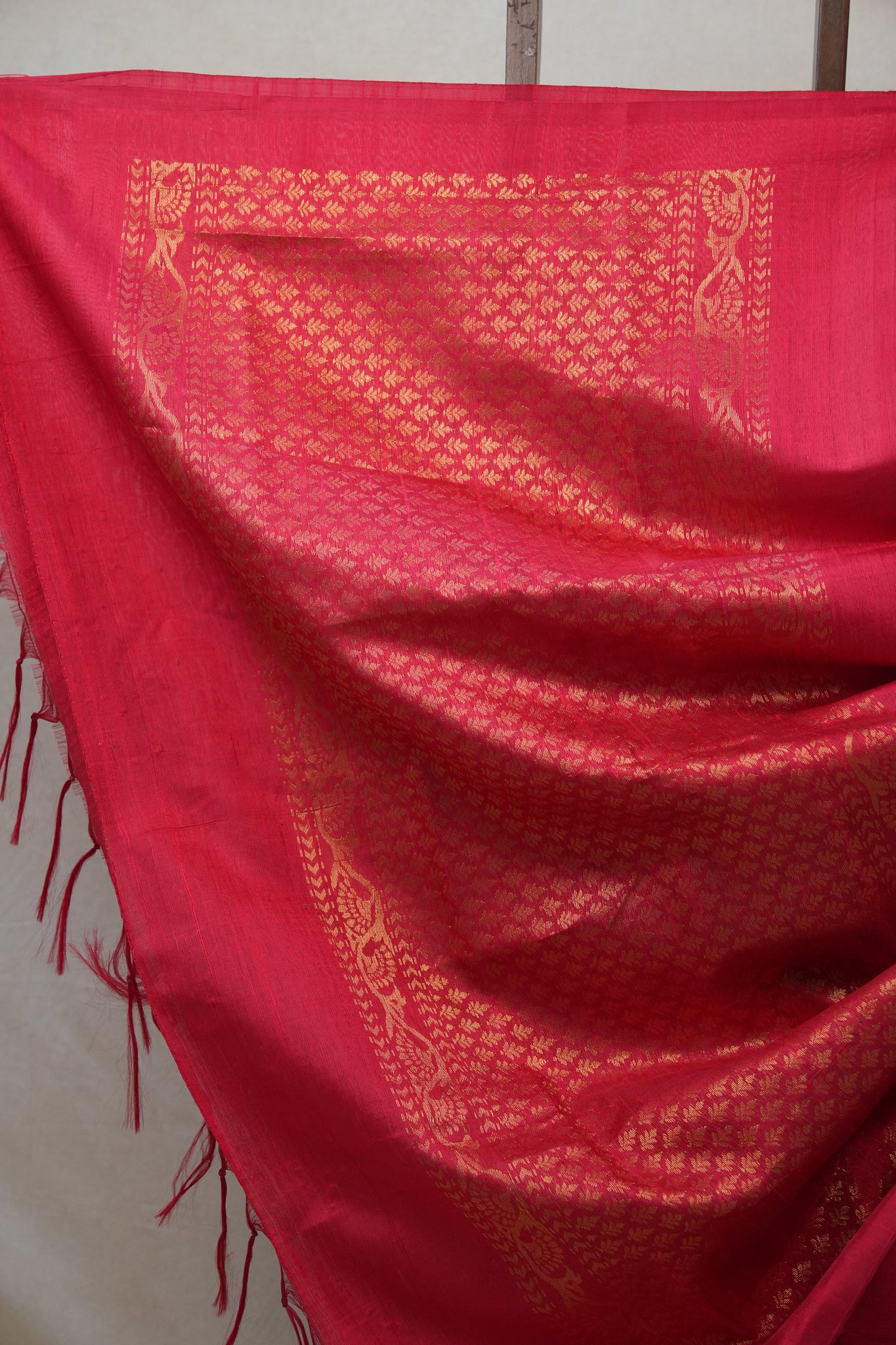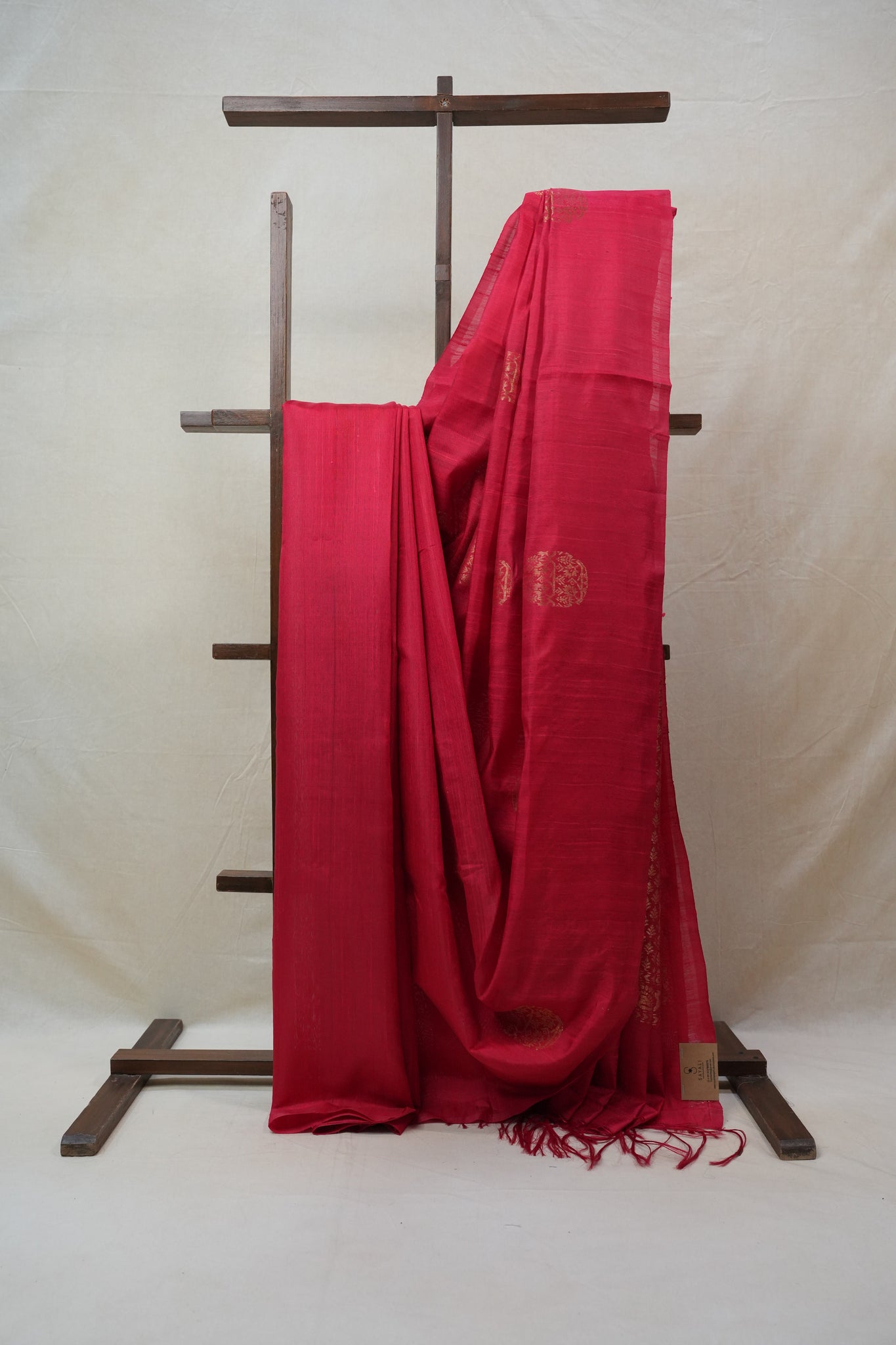 Work - Red raw silk saree with golden zari buttas on the body and an intricately woven zari pallu.