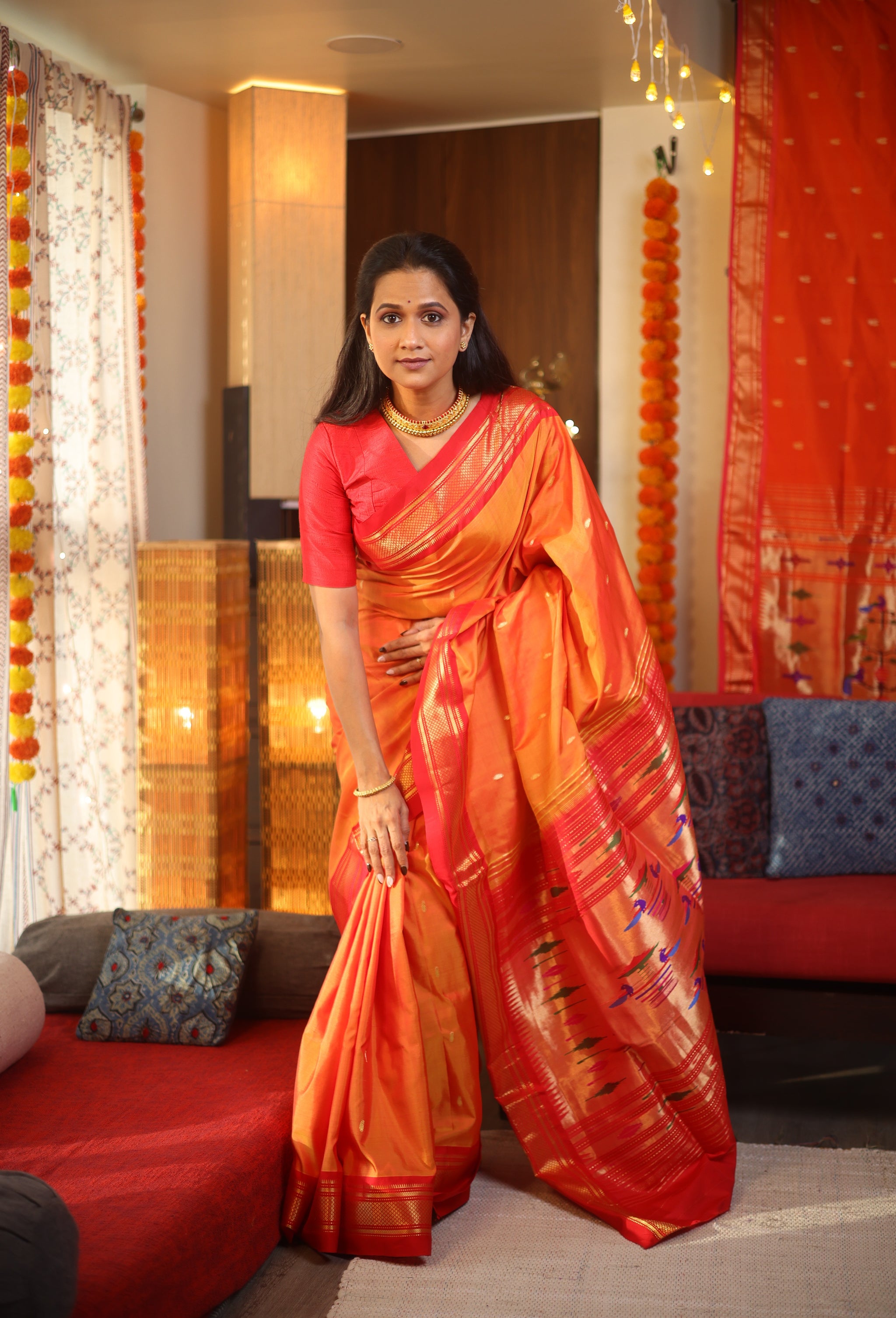 Two Tone Orange Silk Paithani Saree - SRTTOSPS60-PI