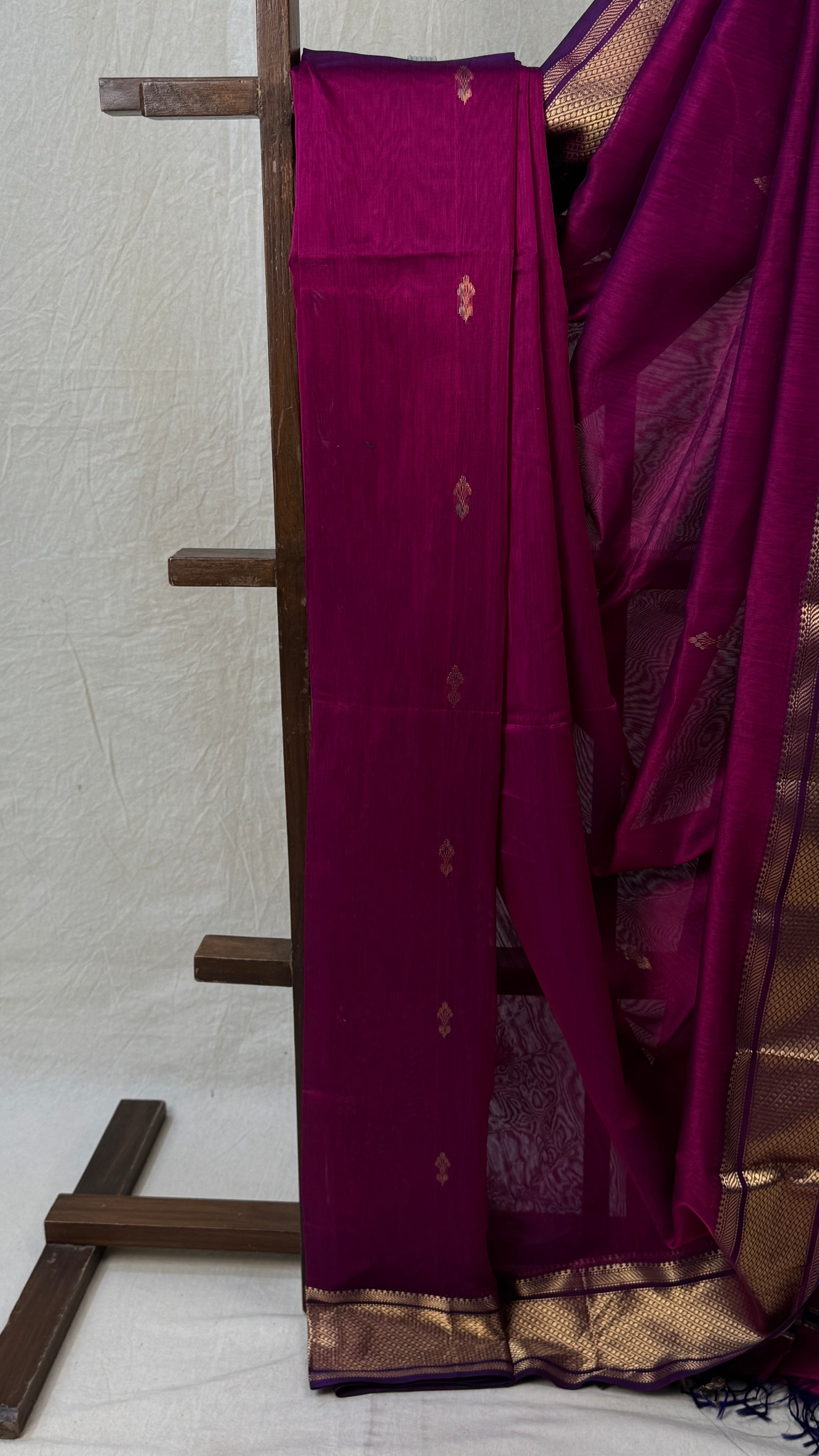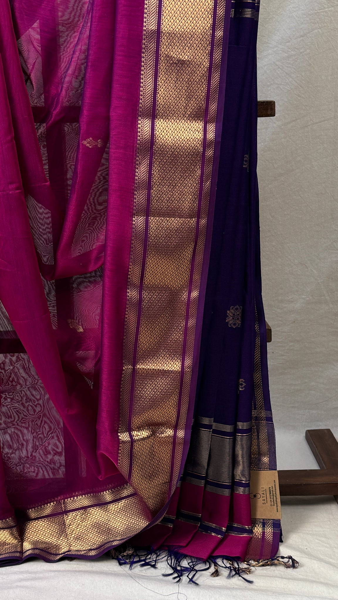 Work - This Maheshwari cotton silk saree features a golden butti with contrast gold zari border and contrast blue pallu with big butta .