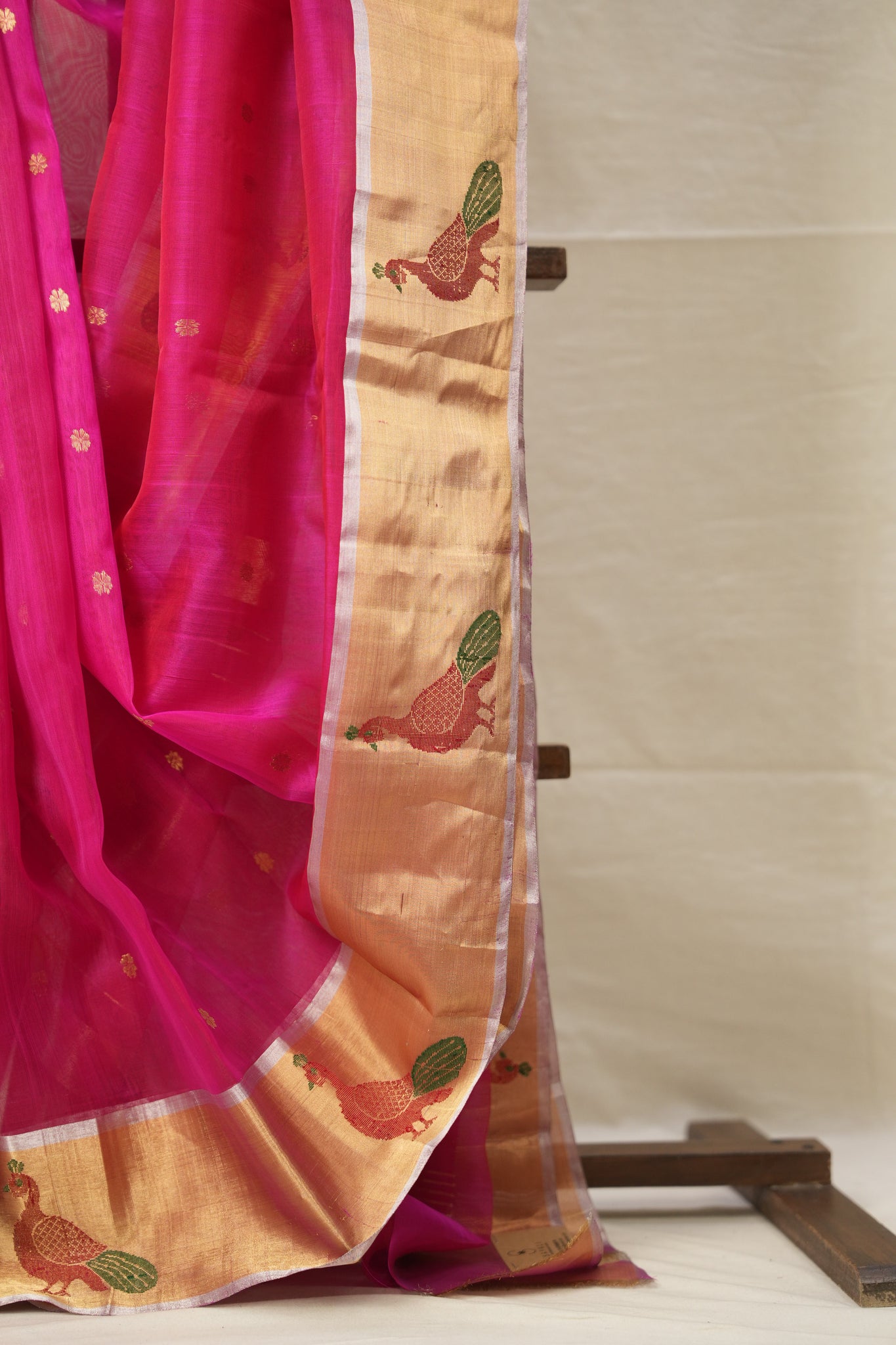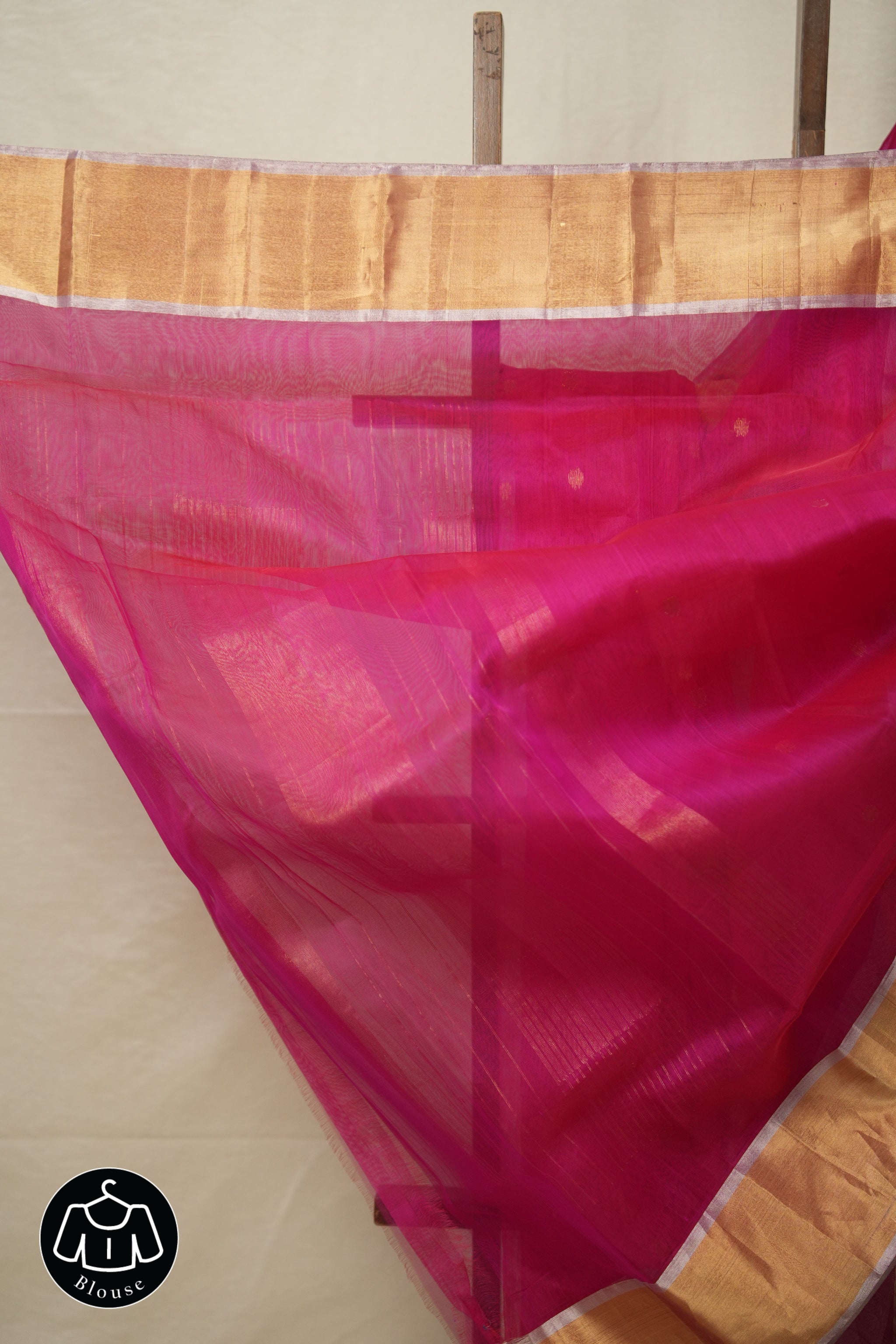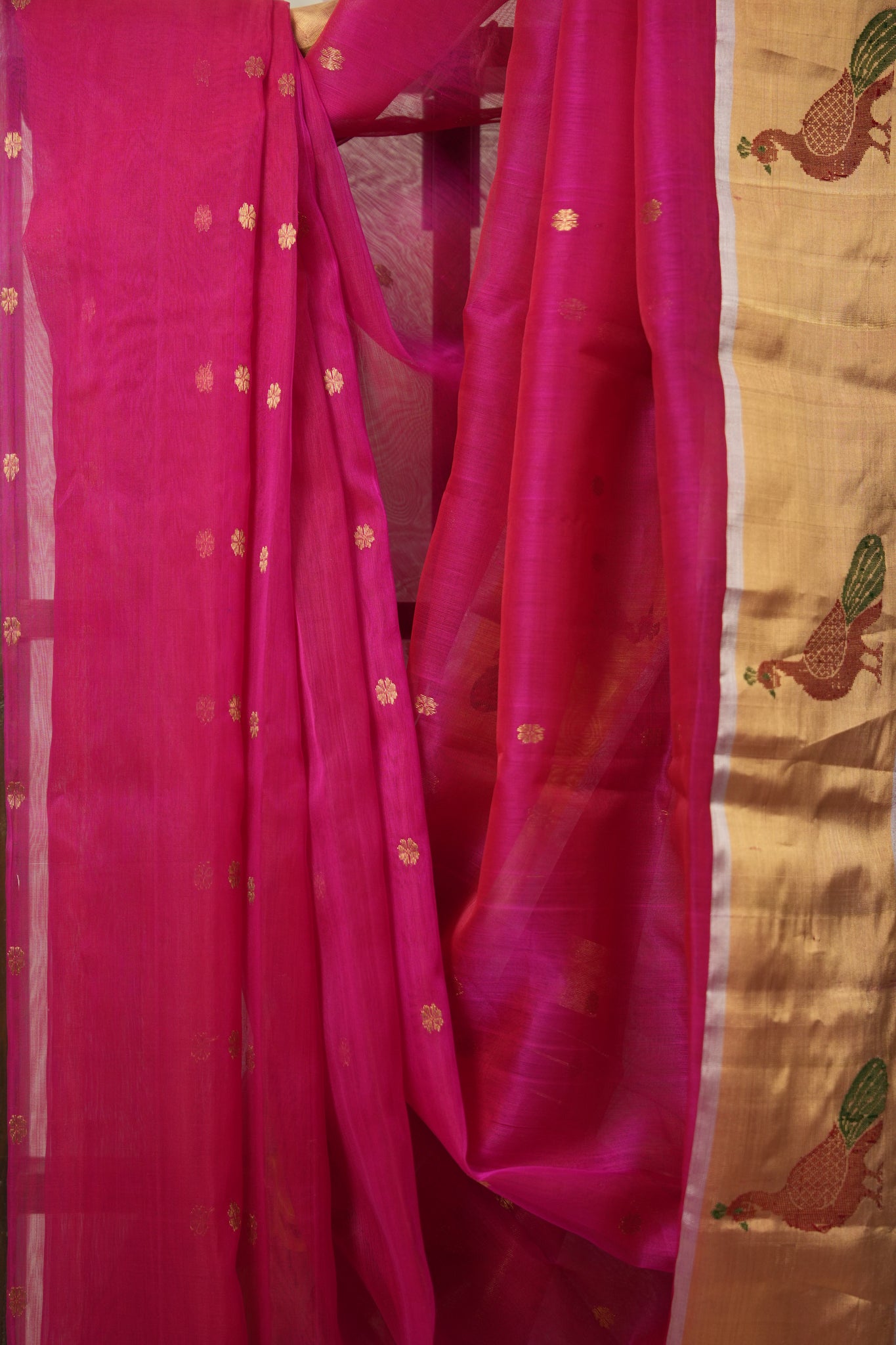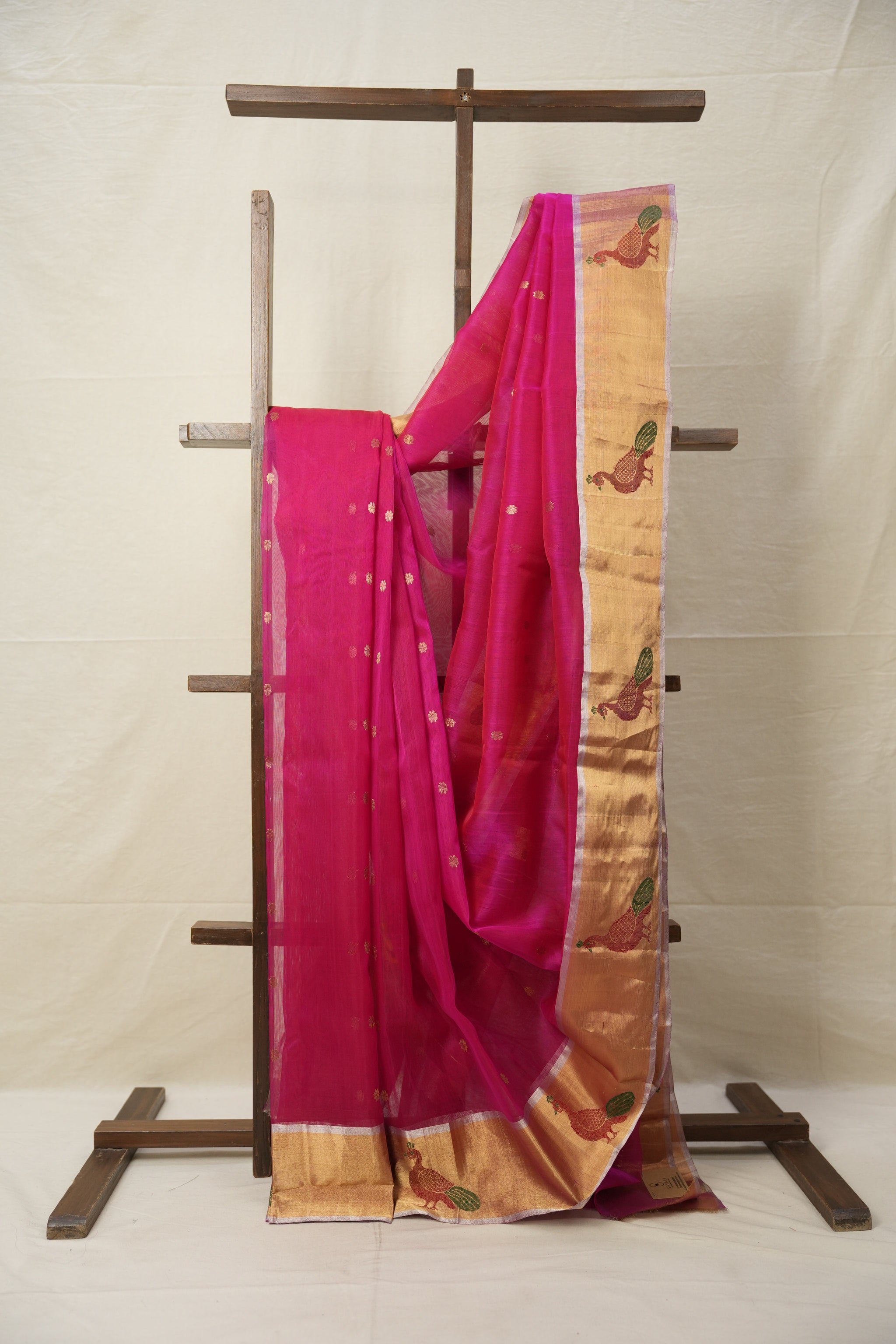 Work - Chanderi silk saree with pink body, gold buti motifs, and elegant gold zari with motifs border.