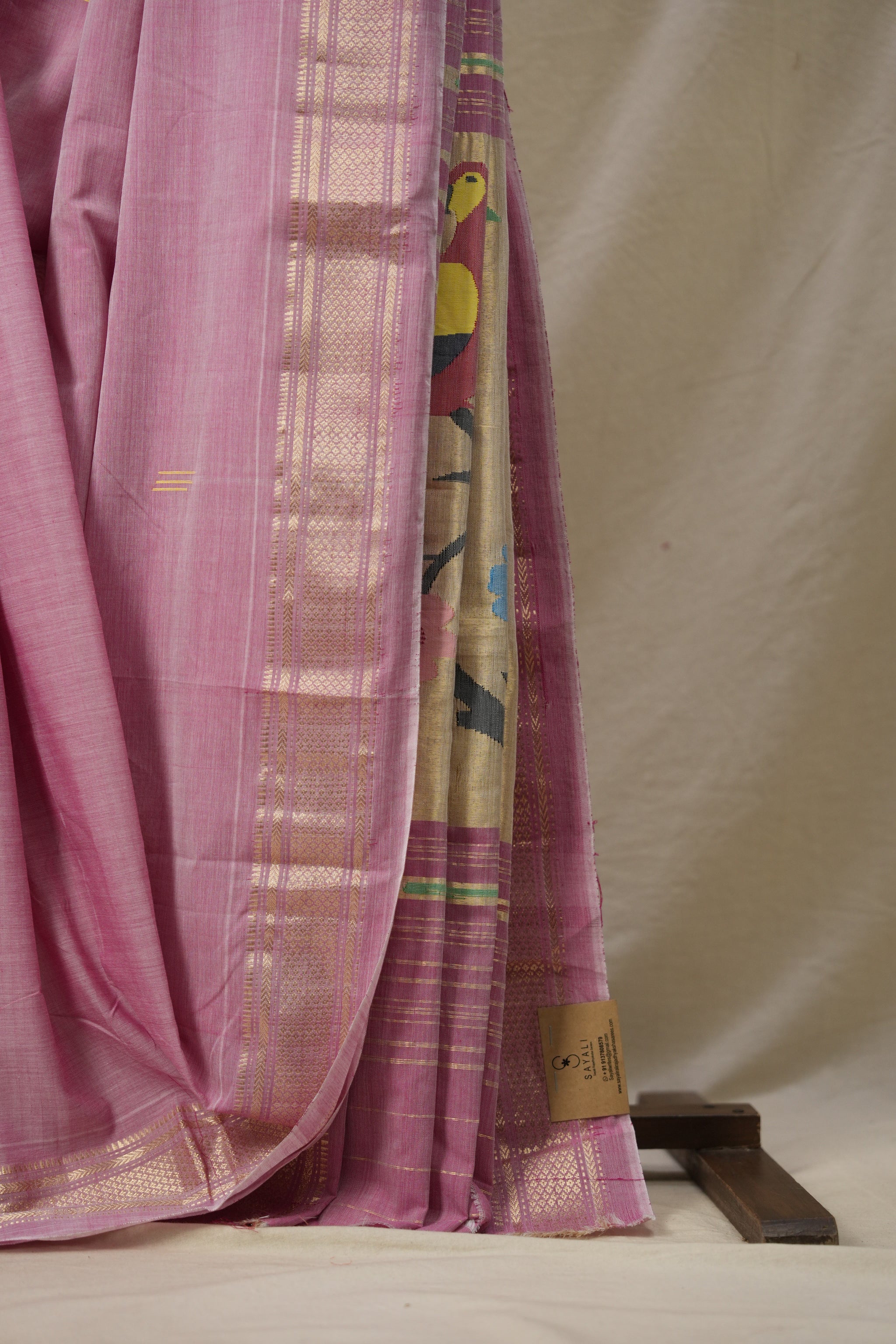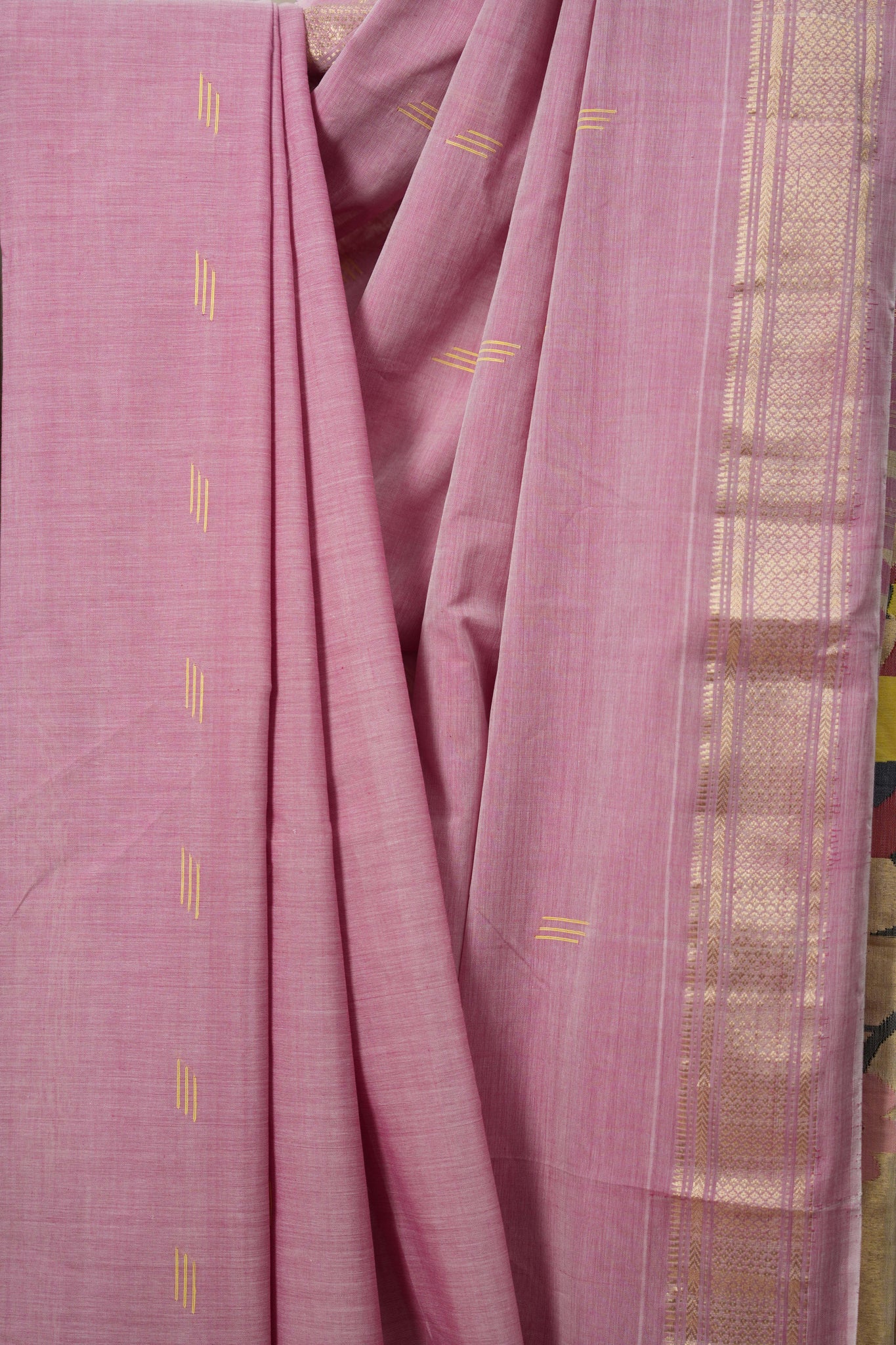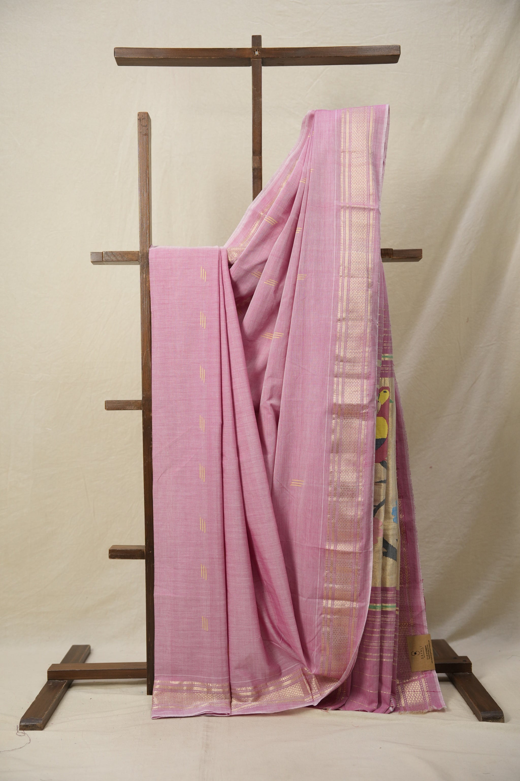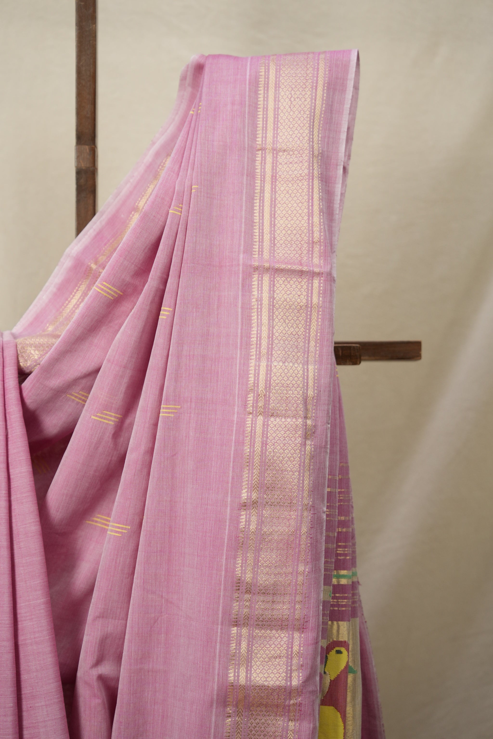 Work - Pink cotton paithani saree with golden butti and gold zari border with fancy pallu.