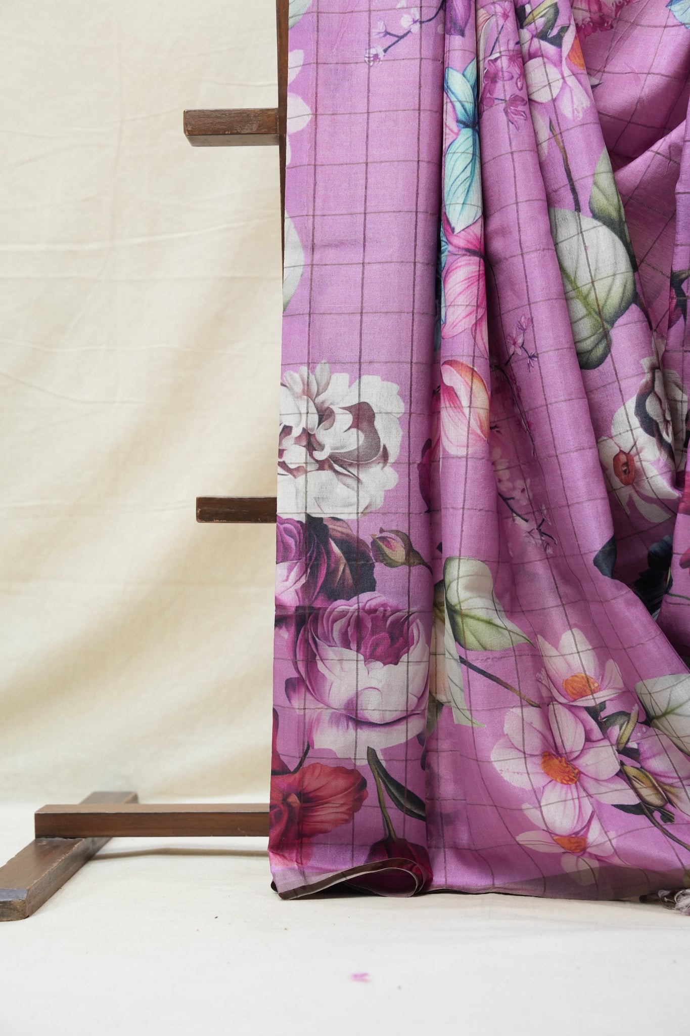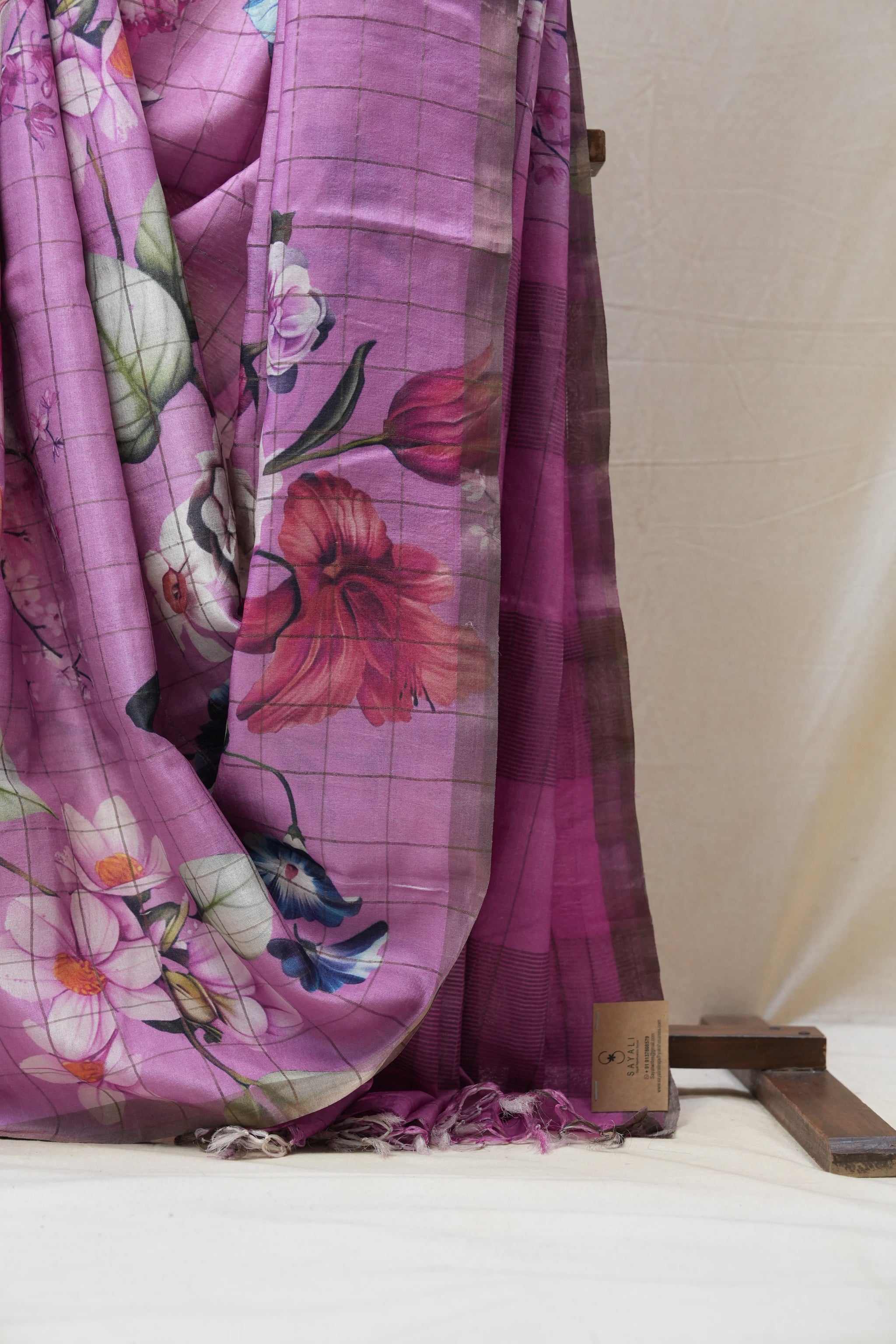Work - This is a pink Tussar saree with floral print work.