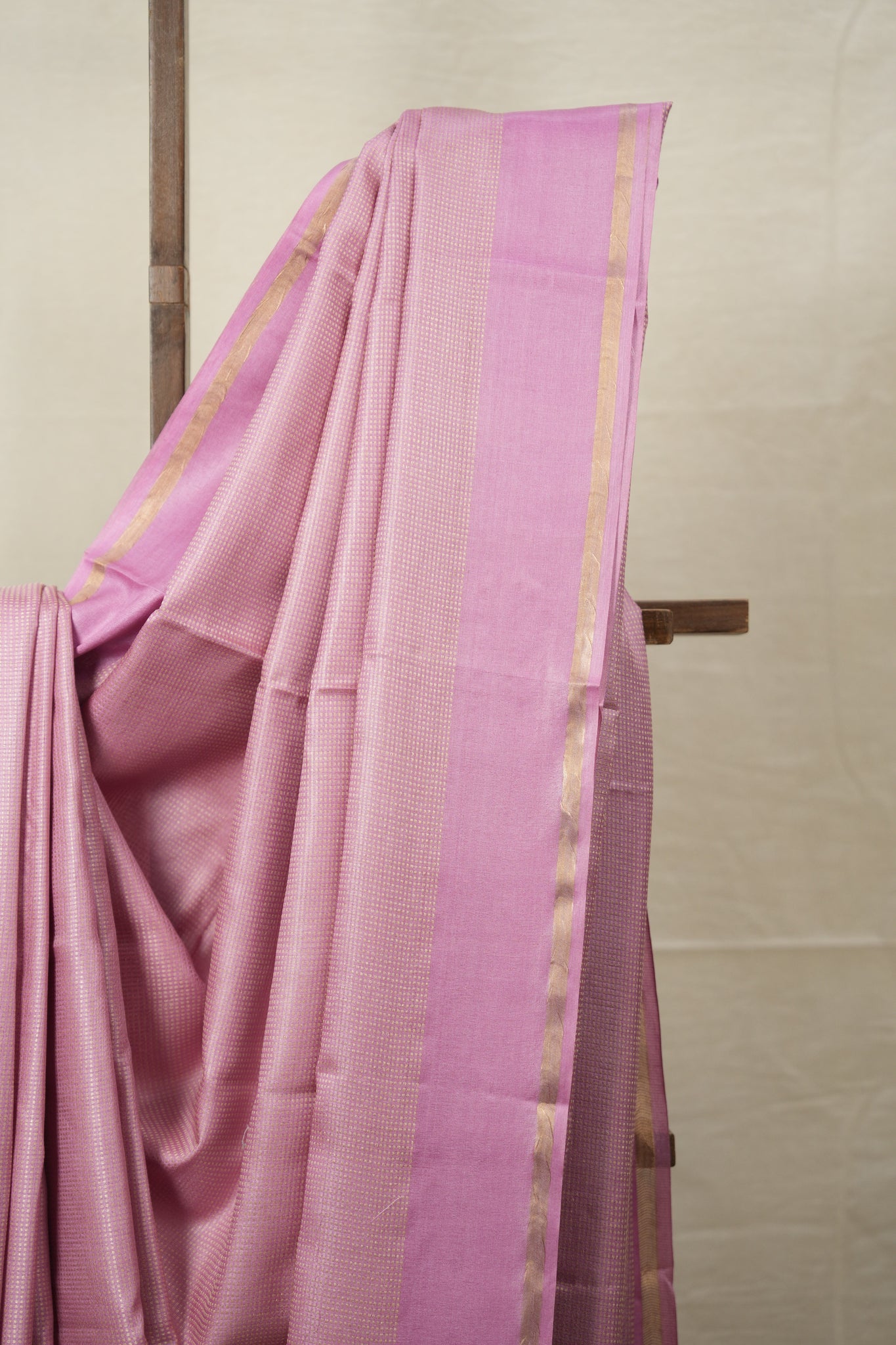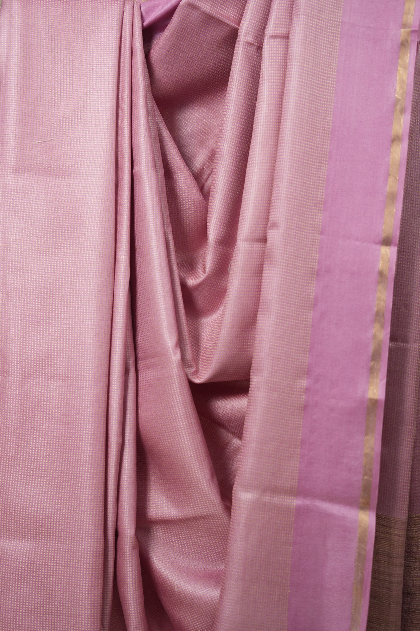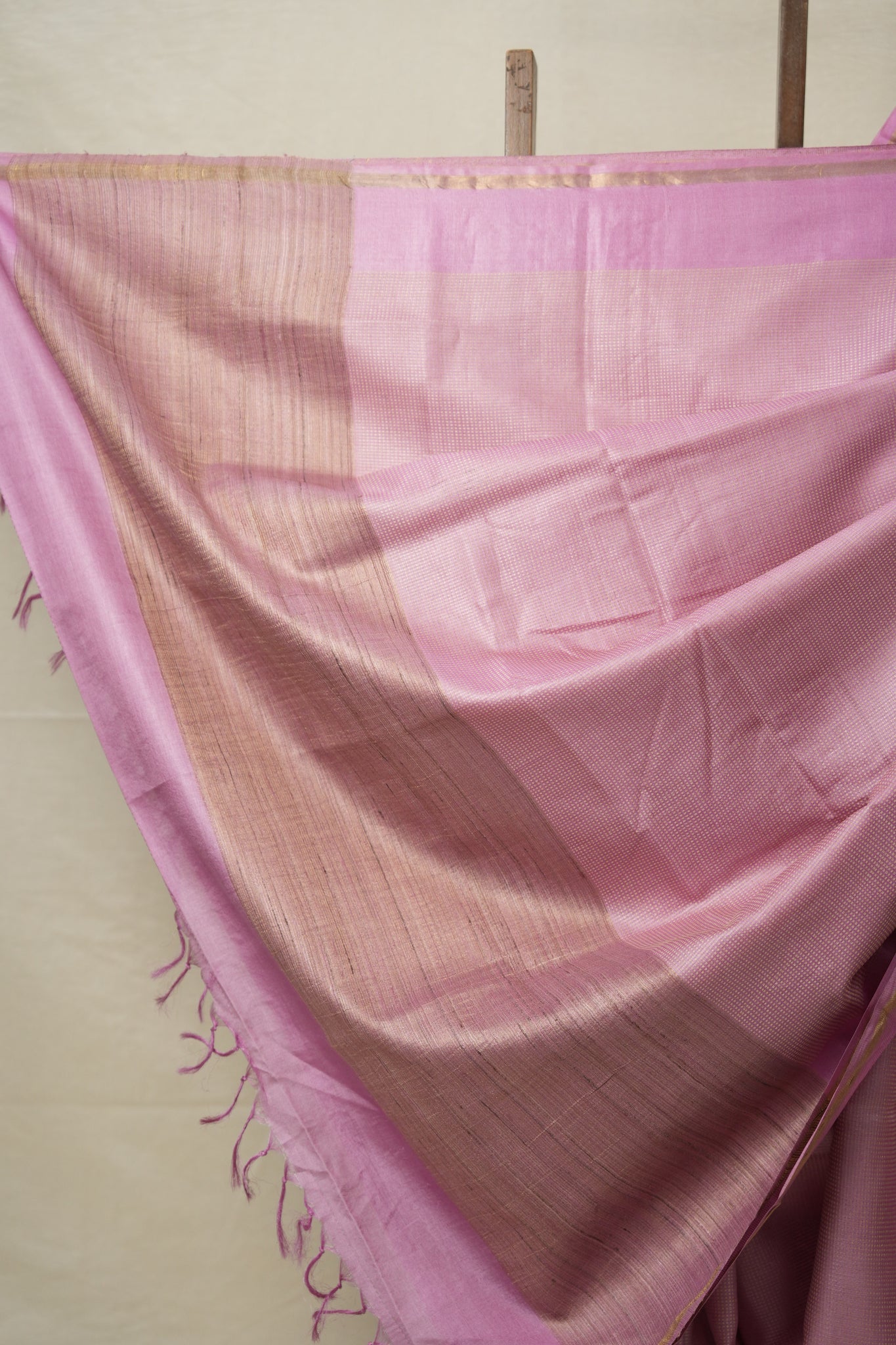 Work - This is a pink tussar saree with a self-woven or striped pattern and a subtle, ornate border.
