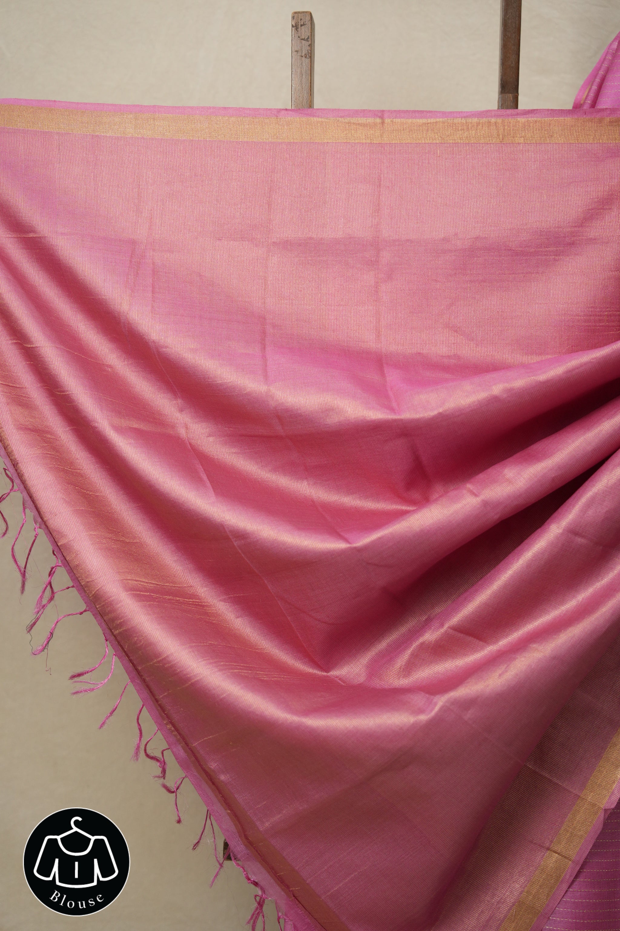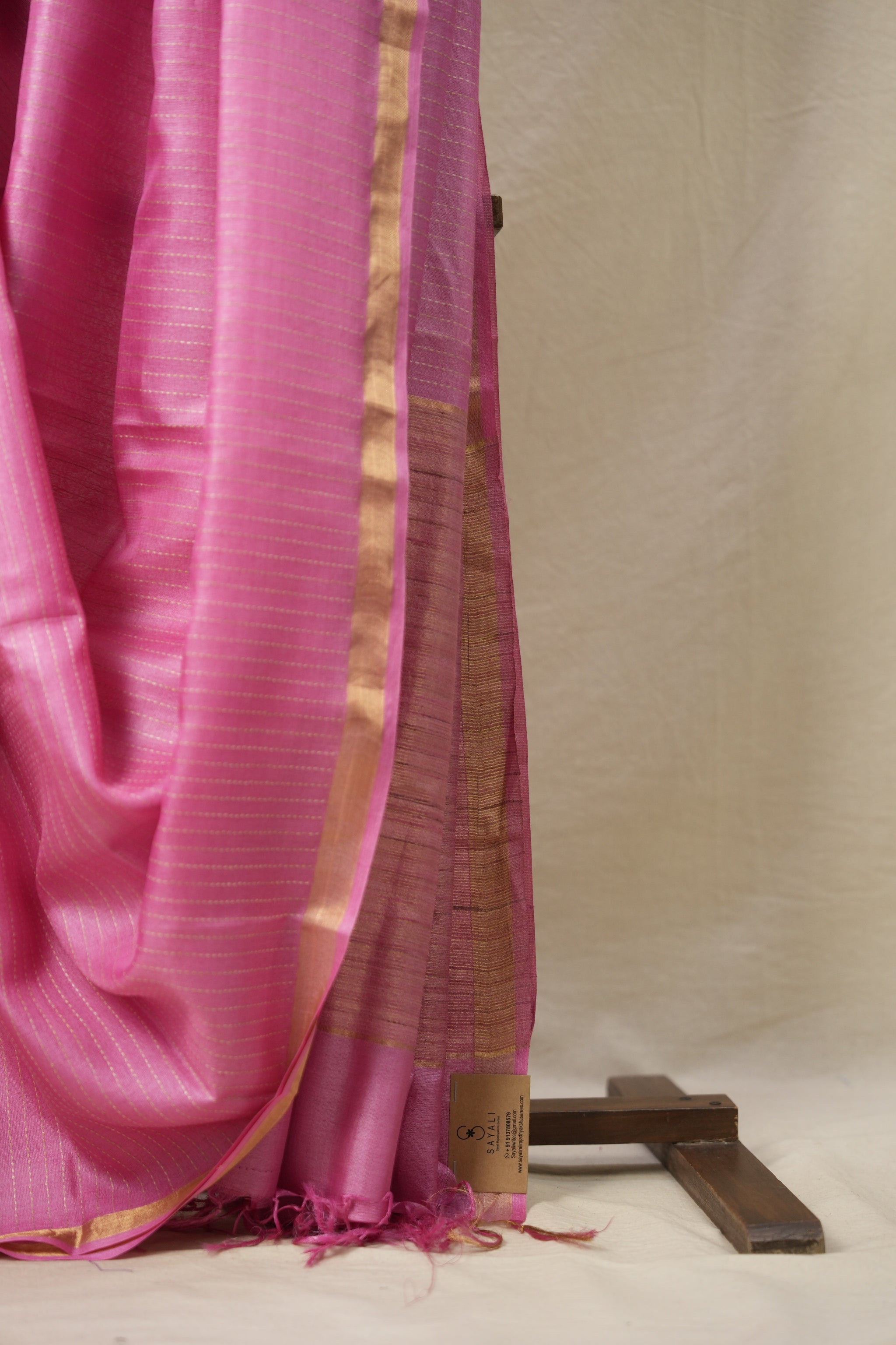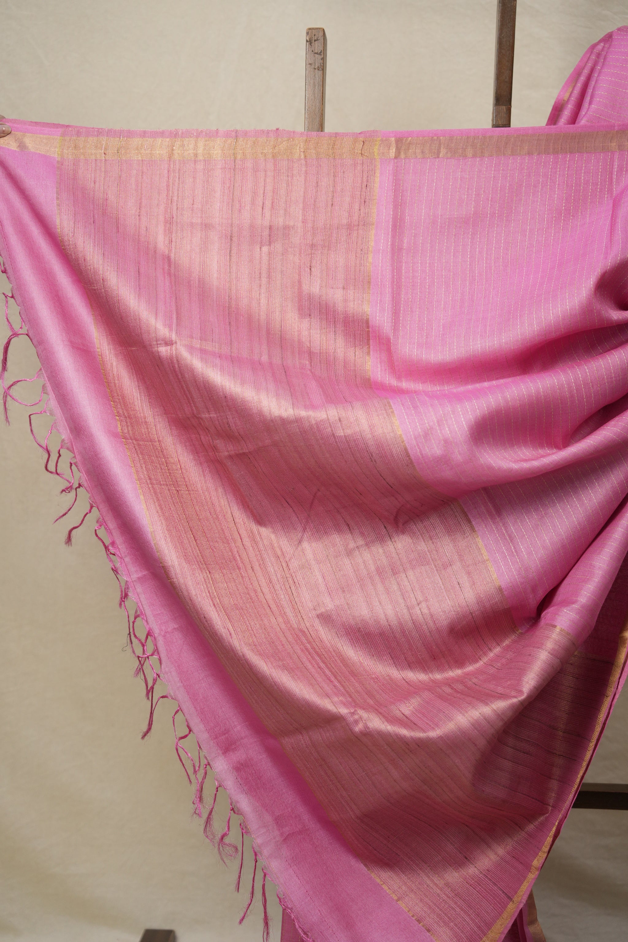 Work - This is a pink tussar saree with a self-woven or striped pattern and a subtle, ornate border.