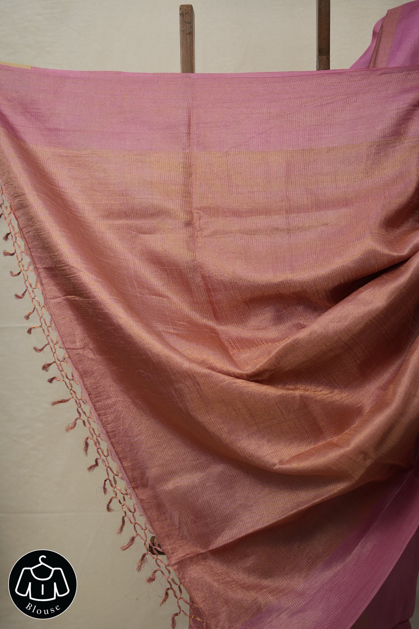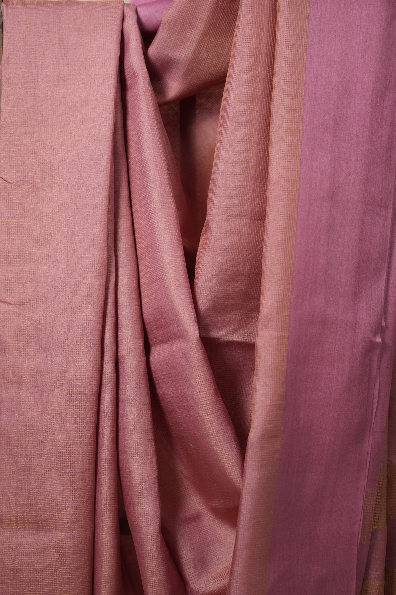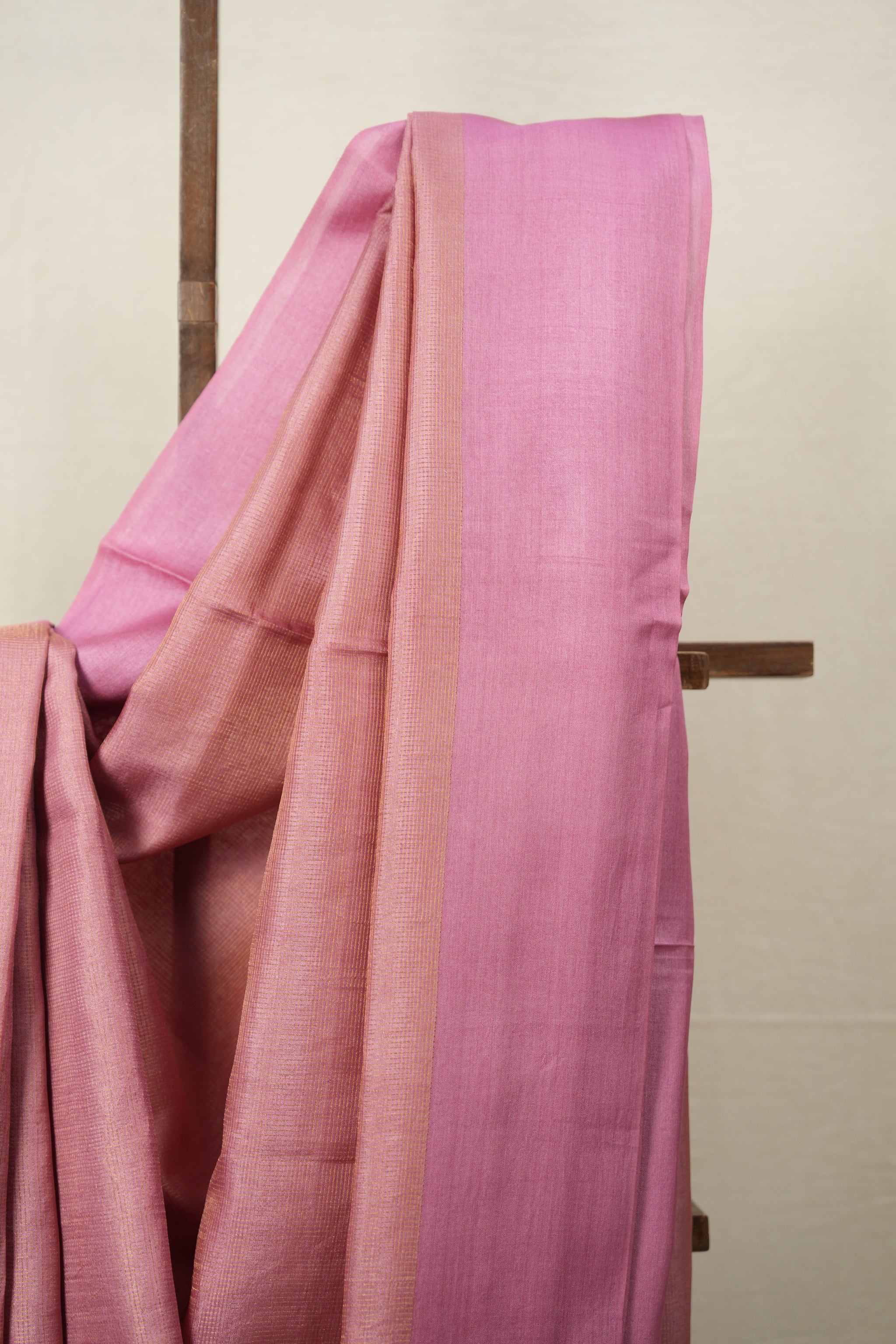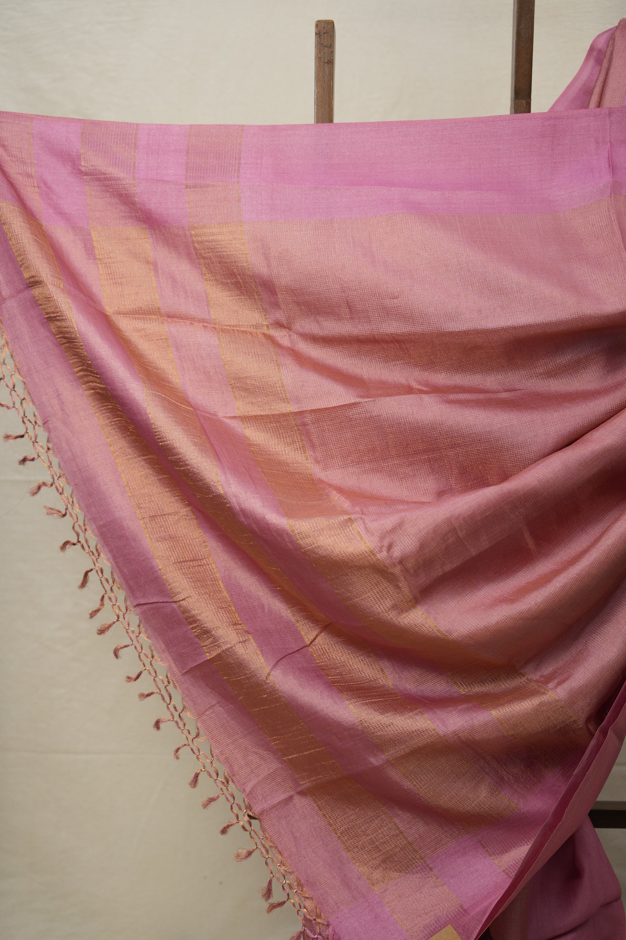 Work -  This is a pink tussar saree with a self-woven or striped pattern and a subtle, ornate border.