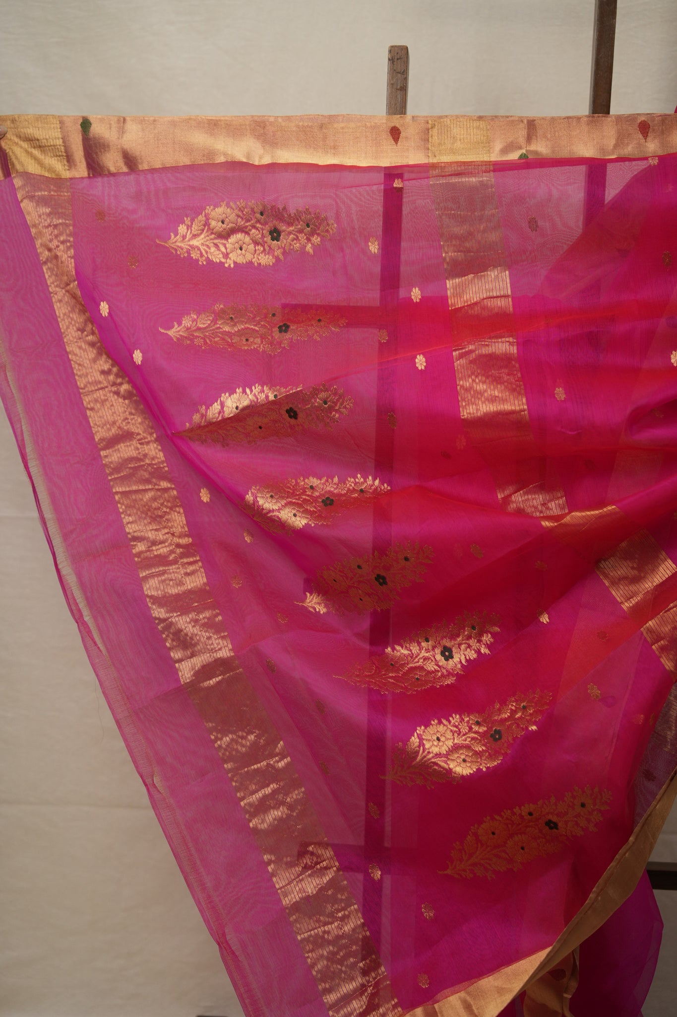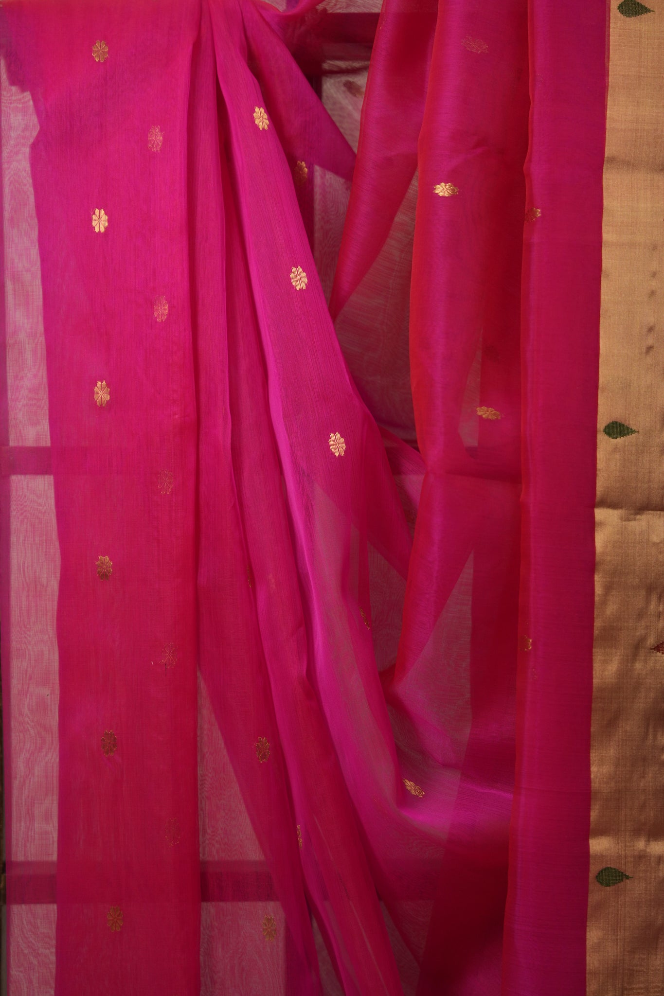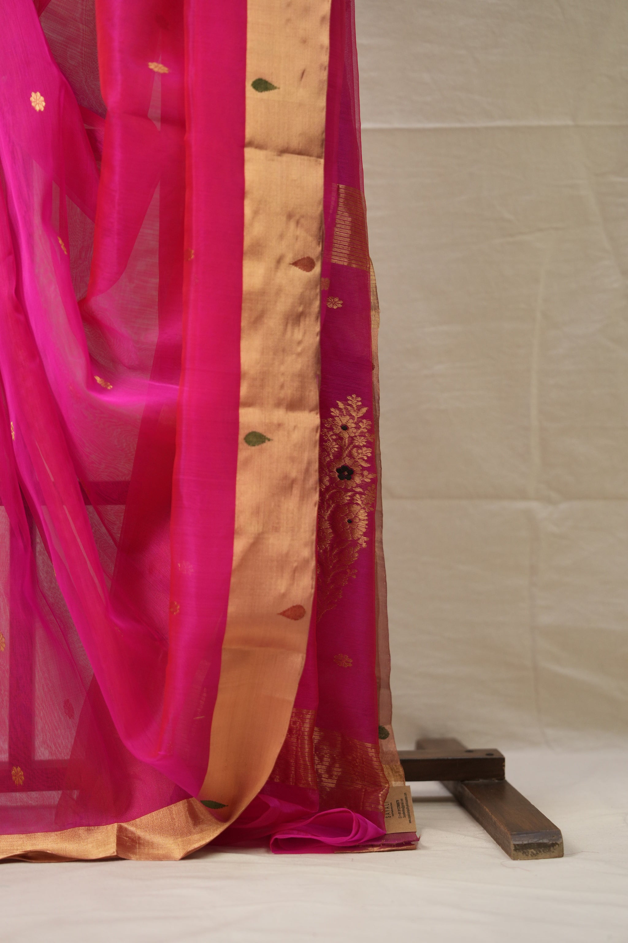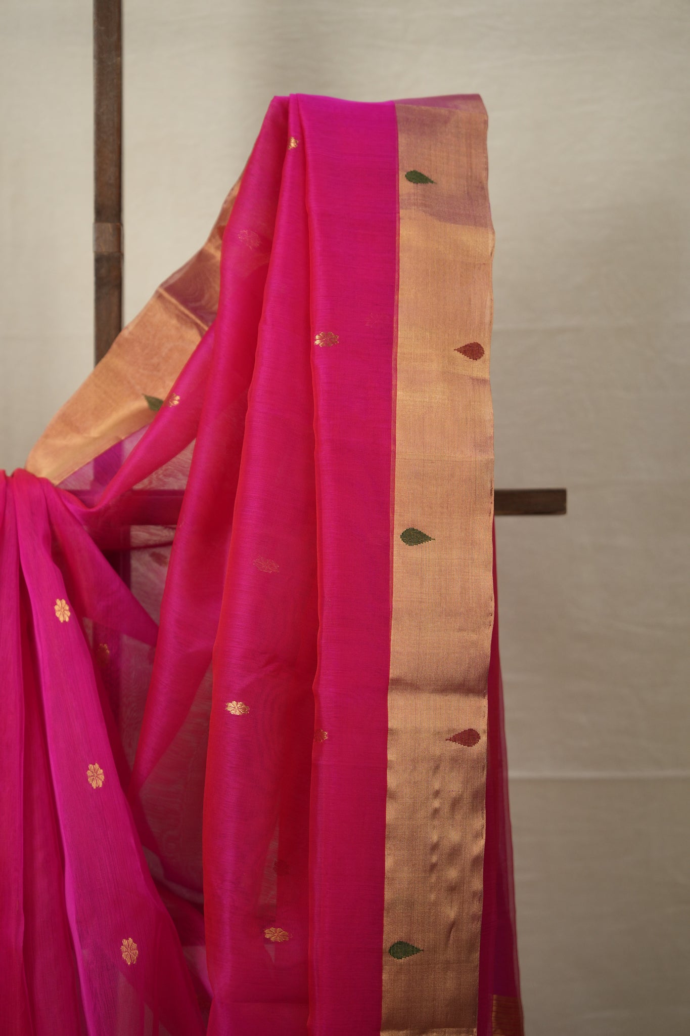 Work - Chanderi silk saree with rani pink body, gold buti motifs, and contrast elegant gold zari border.