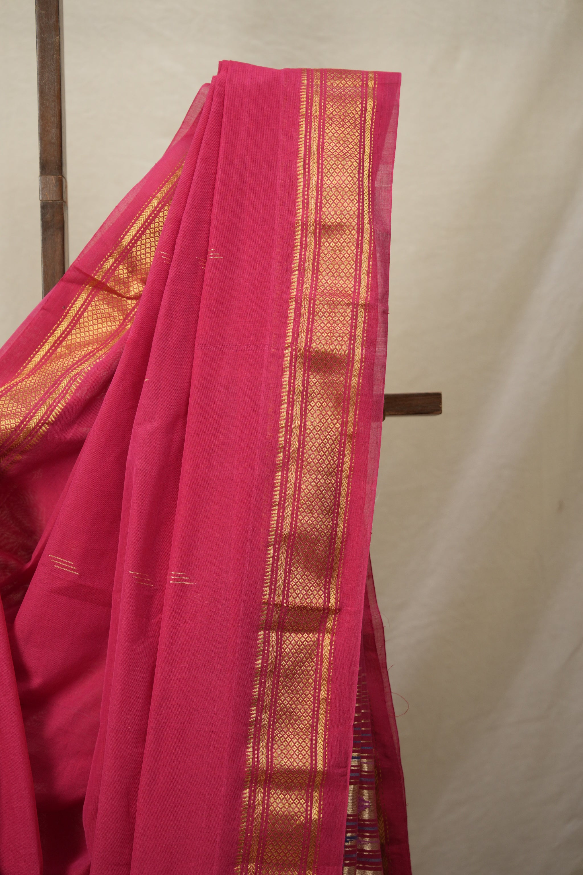 Work - Rani pink cotton paithani saree with golden butti and gold zari border with fancy pallu.