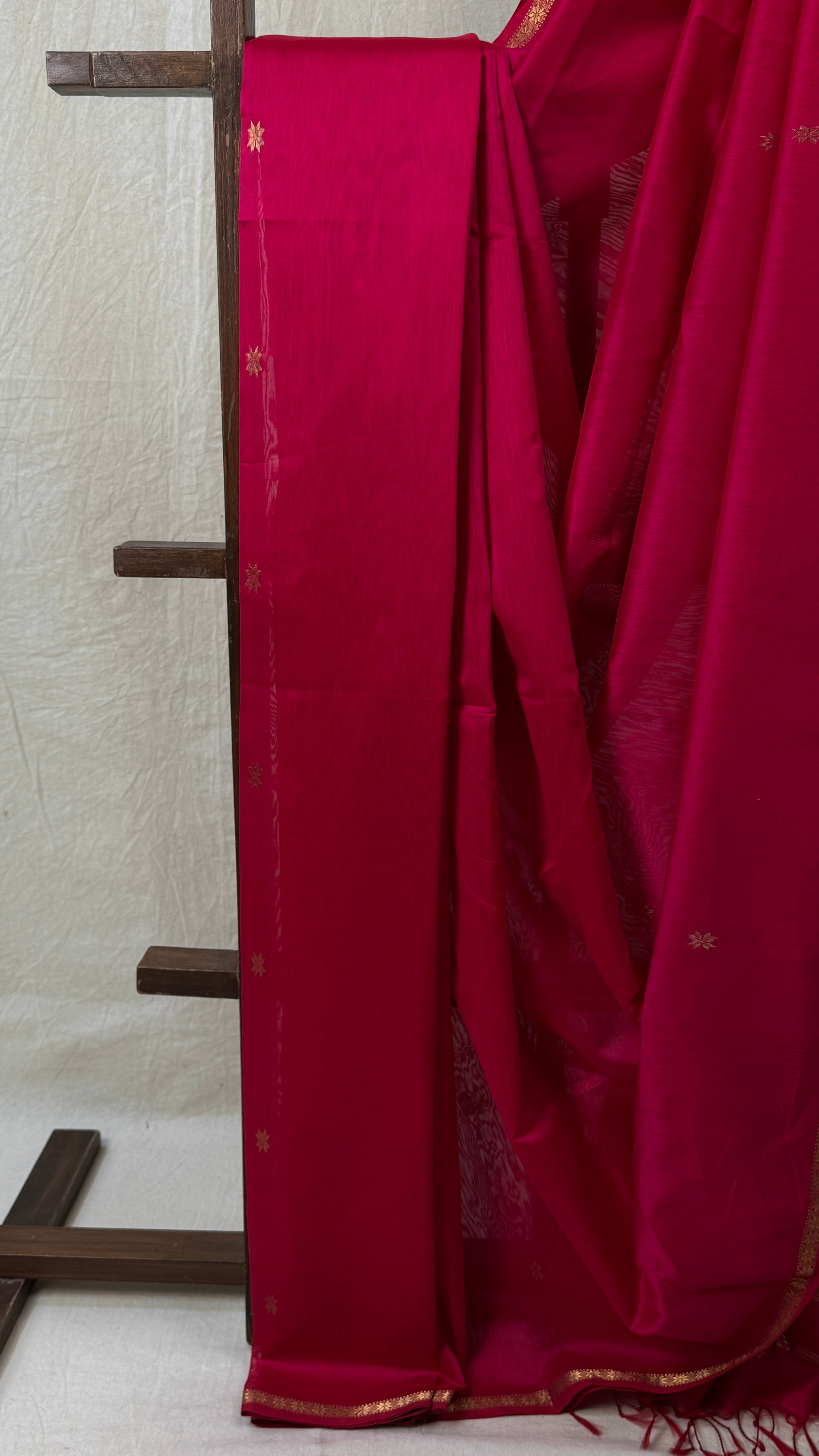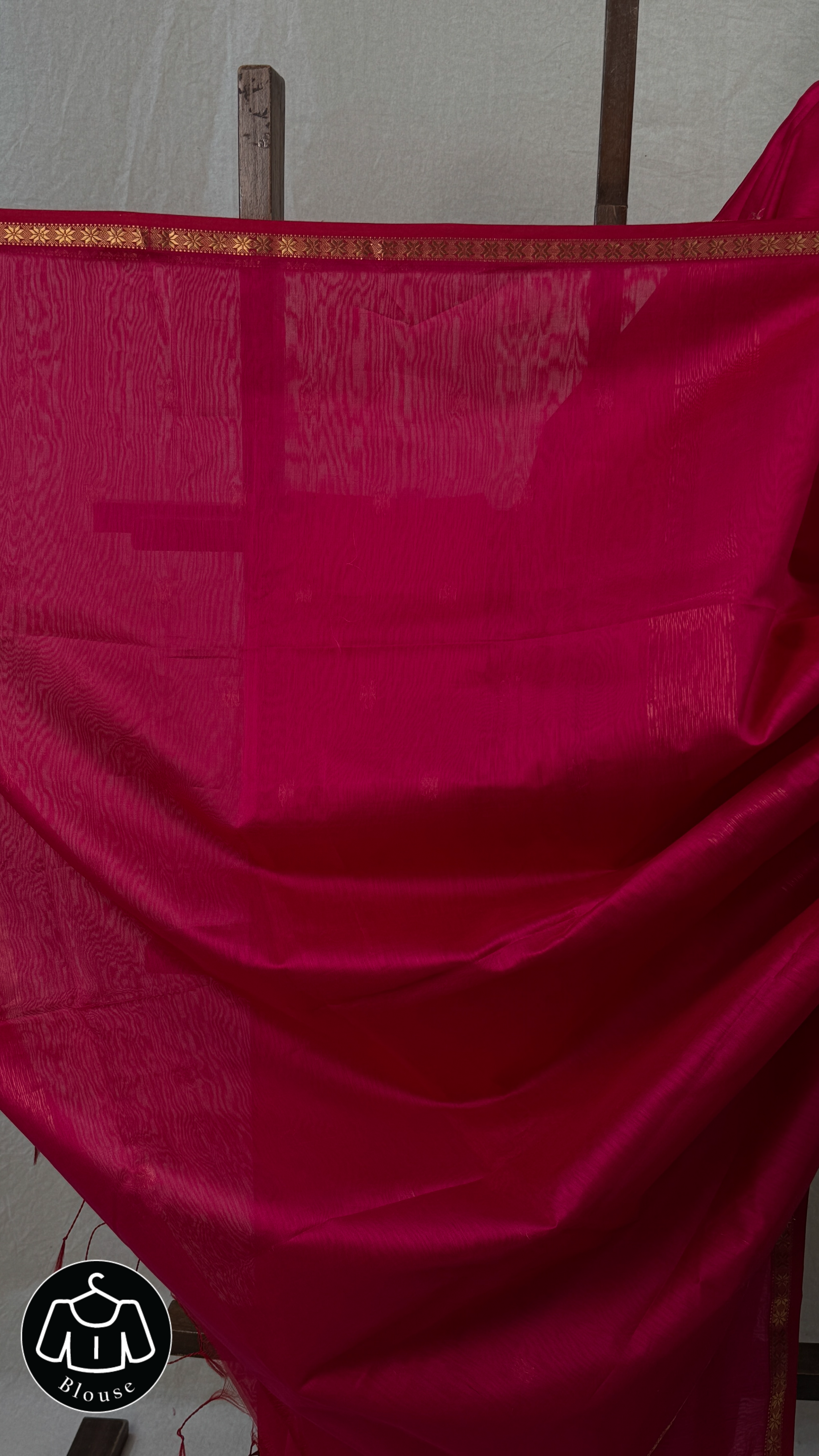 Work - This Maheshwari cotton silk saree features a golden butti with contrast zari border and pallu.