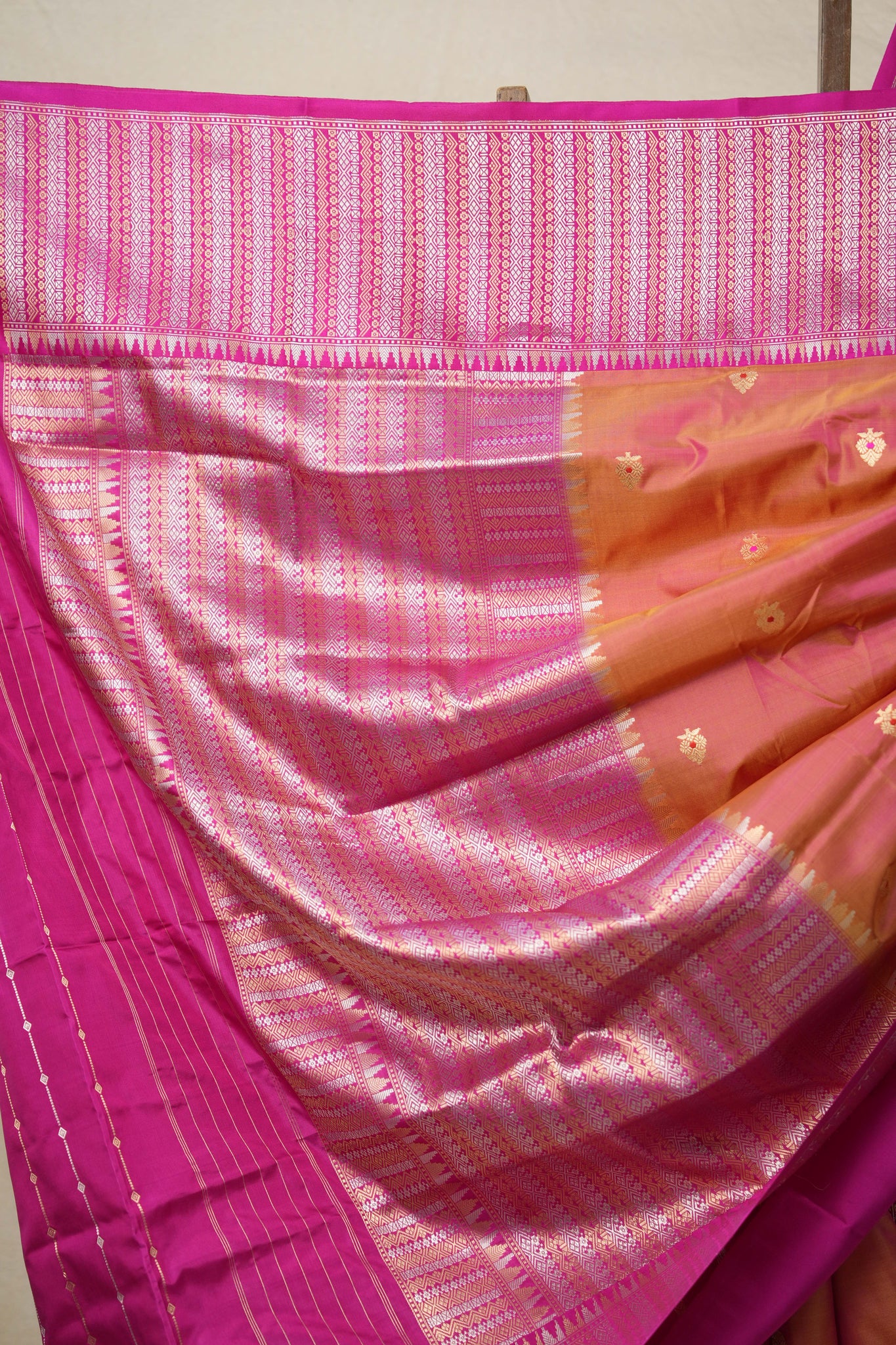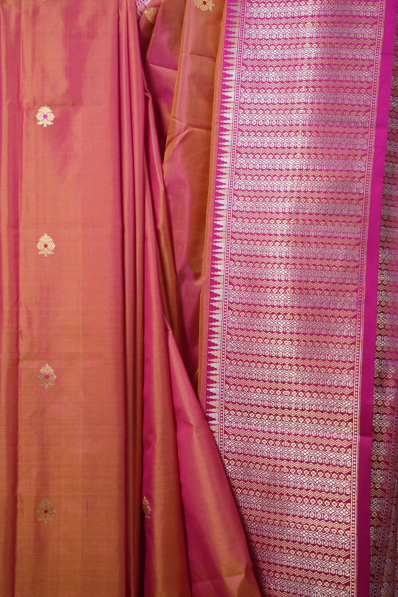 Work - This is a banarasi silk saree in a rose pink base, featuring small motif design across the body and a rose pink base zari border and pallu with intricate traditional designs.