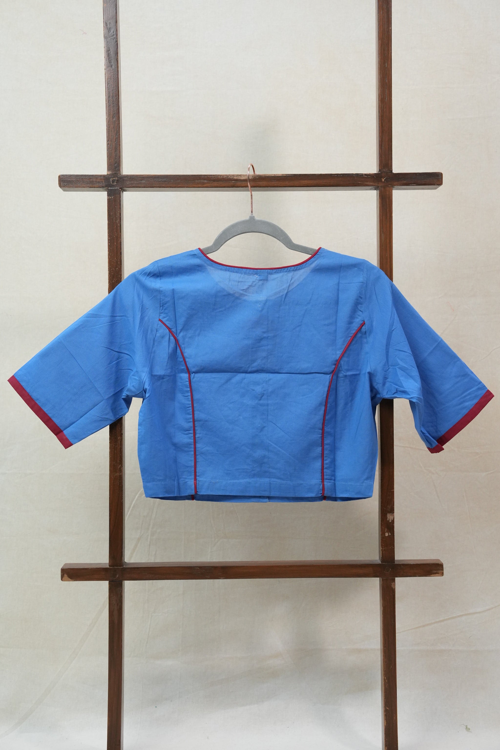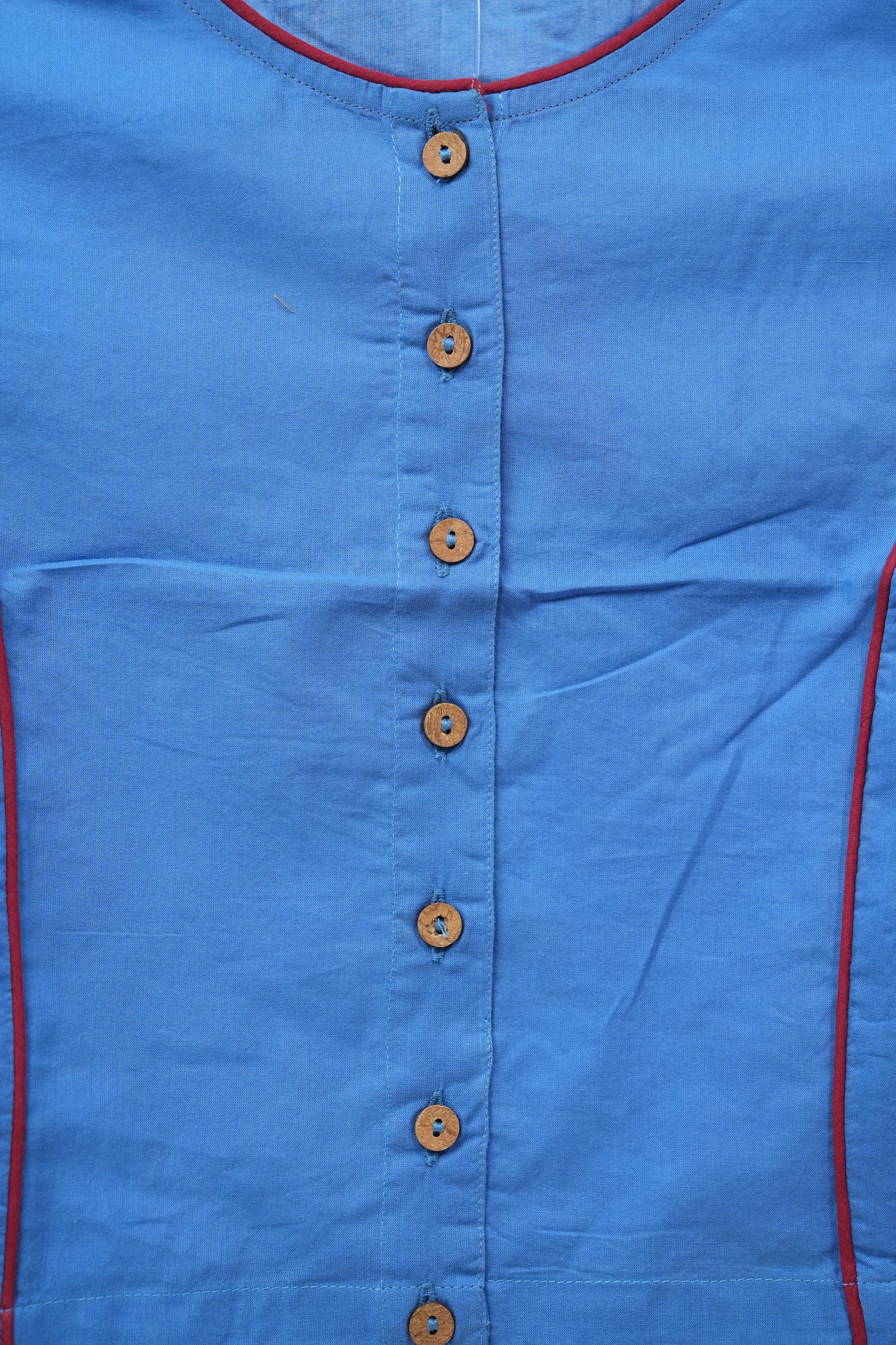 Blue Boat Neck Plain Cotton Blouse With Red Piping - SRBBNCB34